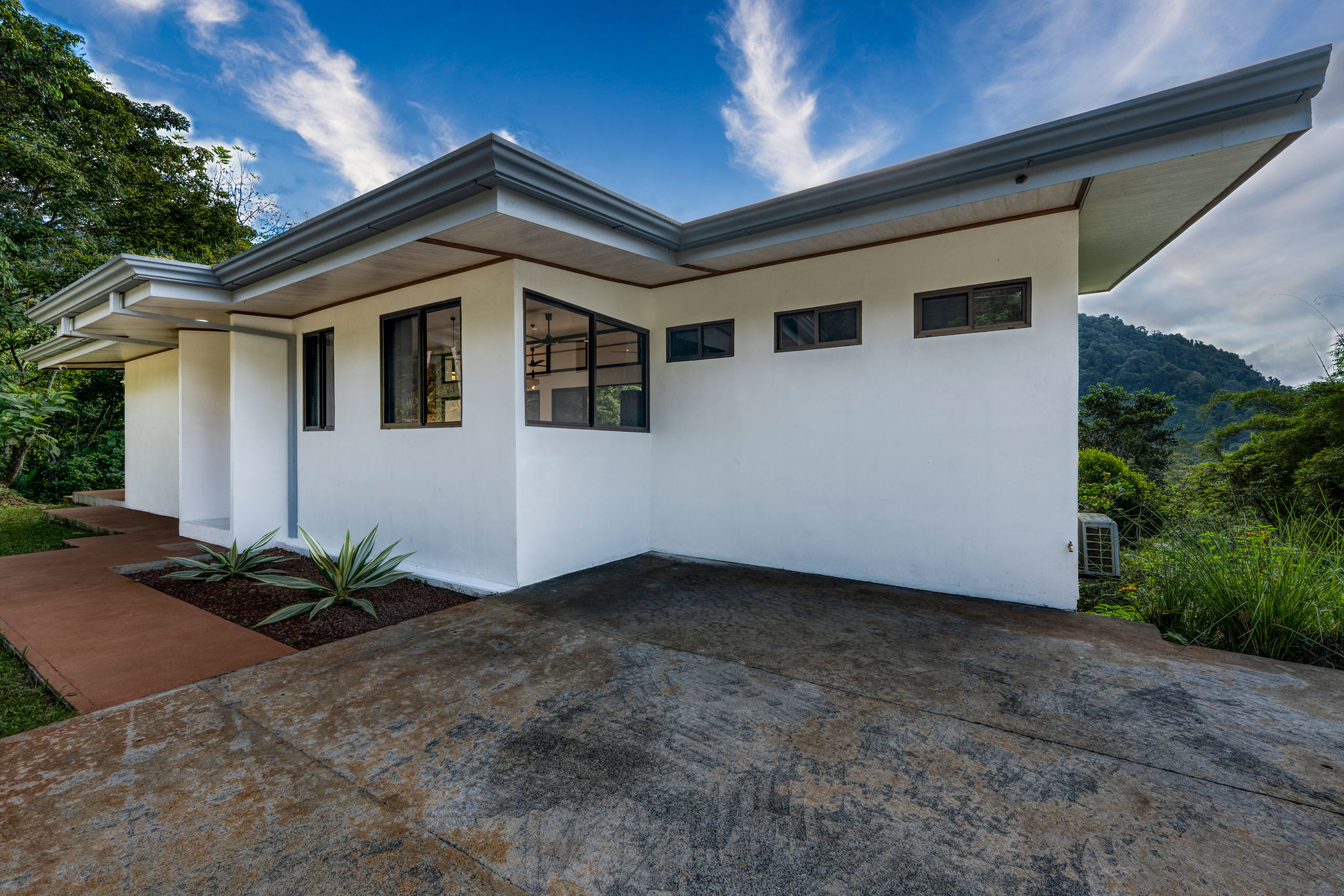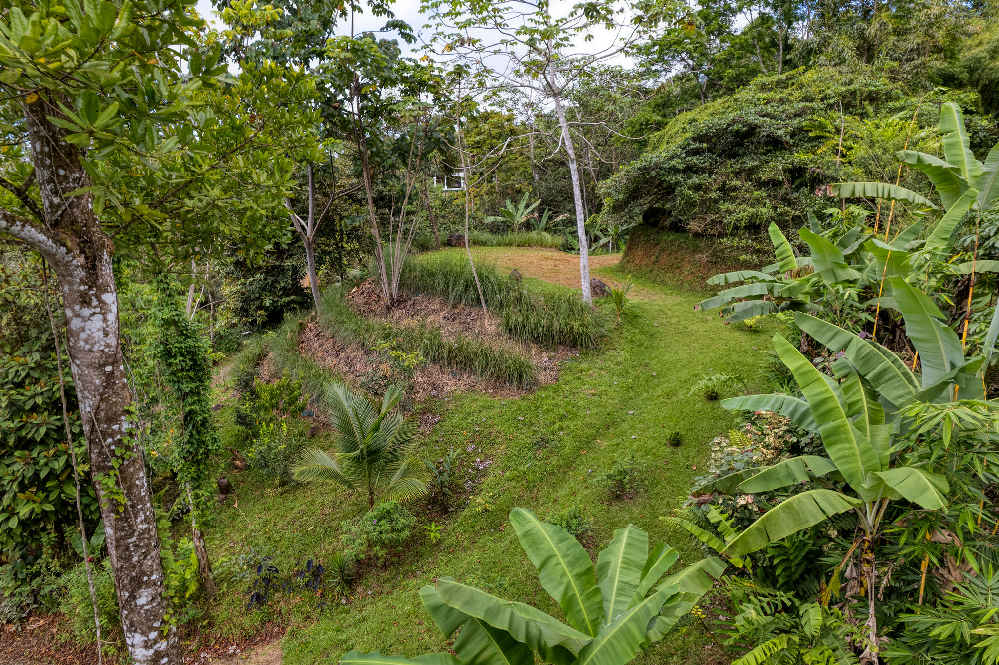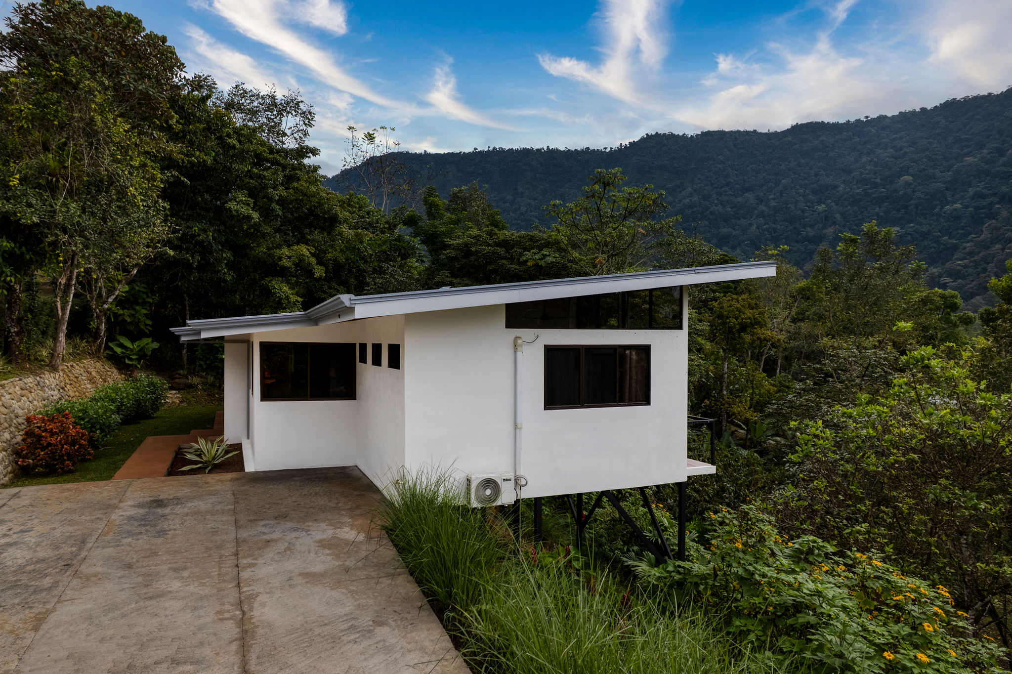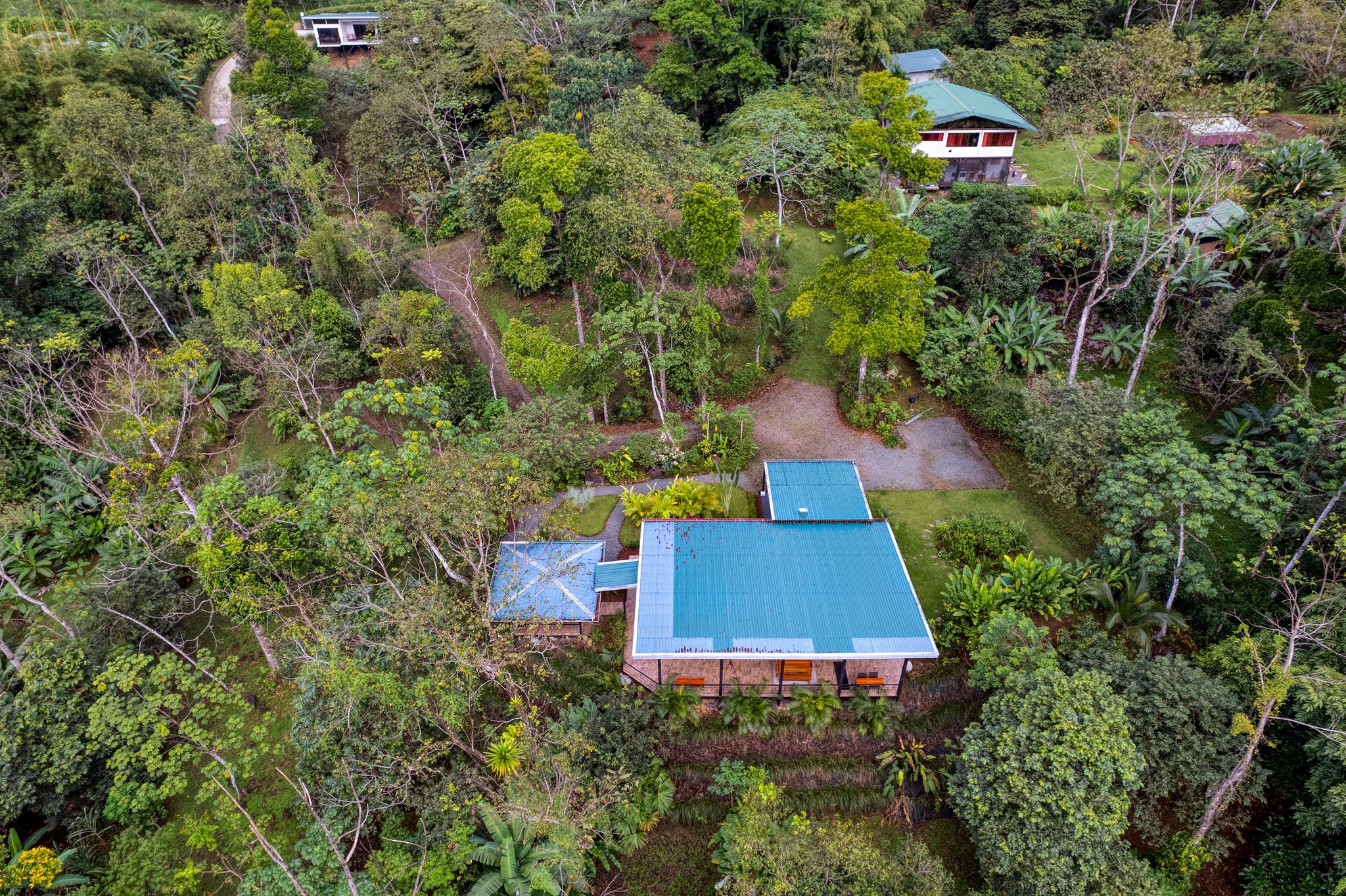 A private interior driveway meanders through the meticulously landscaped property with fruit trees to the main house or lower home. The home also has mountain views and more immersed feel of jungle off the porch with lots of wildlife frequenting the land. The home is also a modern design with open floor concept of the kitchen and the living room between the two bedrooms and baths. The living room and both bedrooms open to a large covered outdoor terrace perfect for lounging, bird watching, and enjoying the climate offered by the ideal elevation. The principal bedroom has a spacious on suite bathroom, as well, as outdoor shower and jacuzzi tub. A 3rd bedroom and bath could easily be added to this home if someone required a 3 bed/3 bath home. Owner would be willing to negotiate the addition of this bedroom and bath if required.
