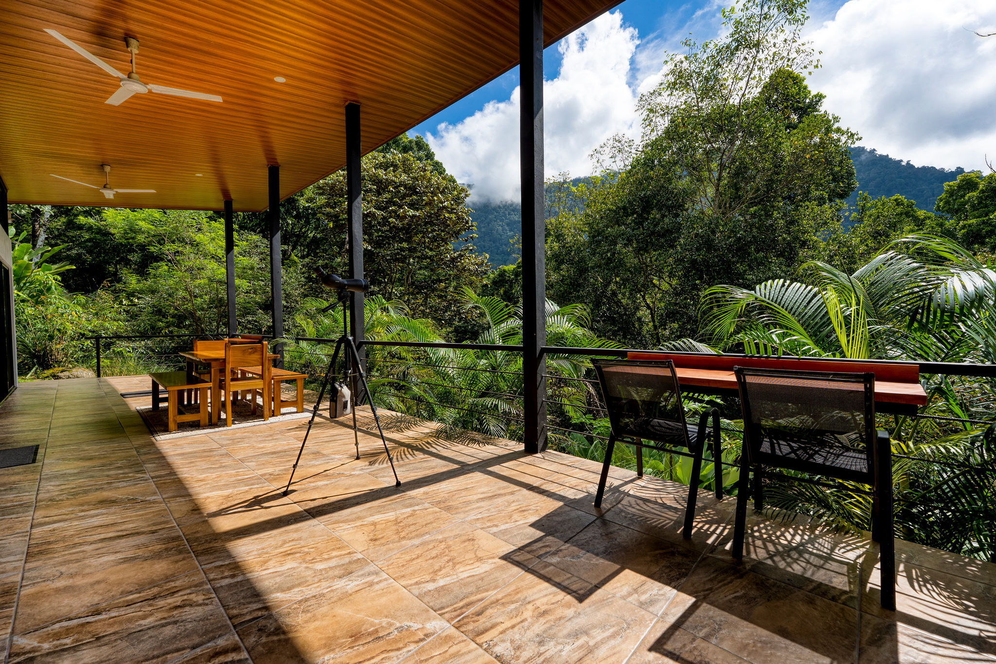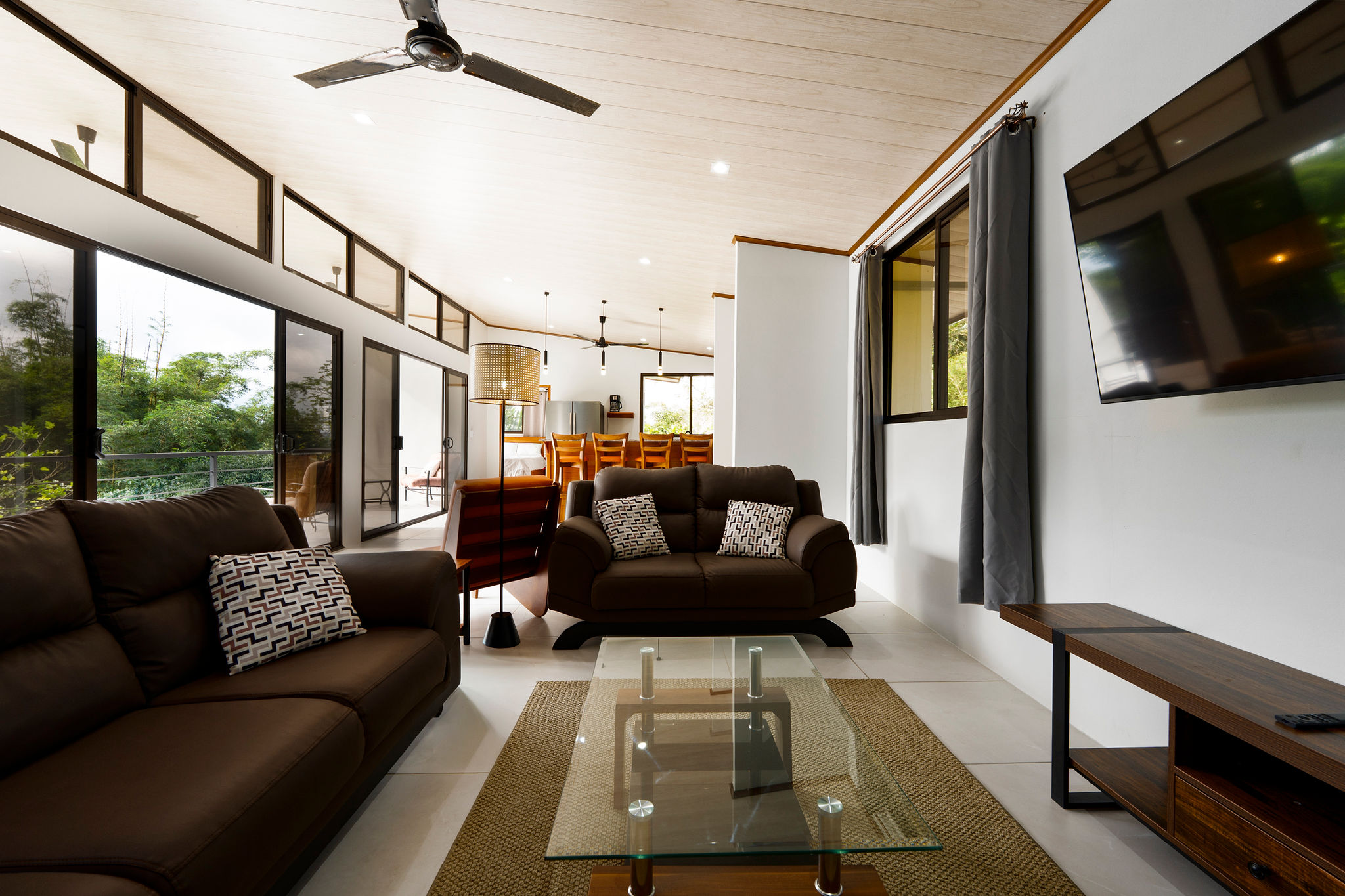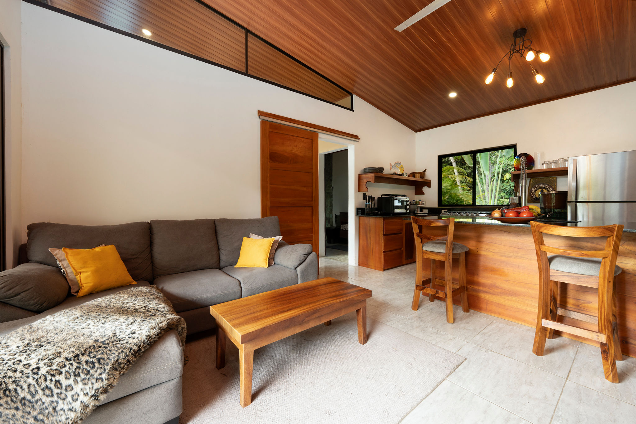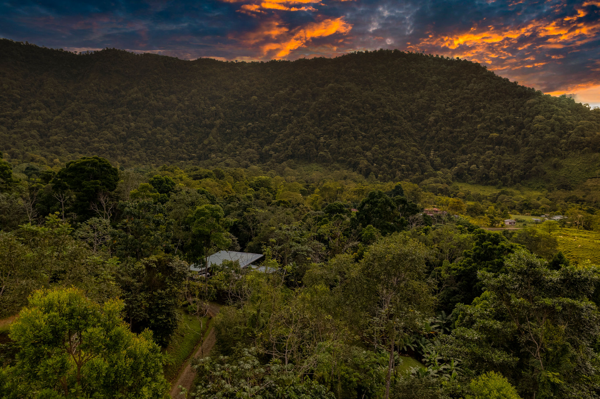 A private interior driveway meanders through the meticulously landscaped property with fruit trees to the main house or lower home. The home also has mountain views and more immersed feel of jungle off the porch with lots of wildlife frequenting the land. The home is also a modern design with open floor concept of the kitchen and the living room between the two bedrooms and baths. The living room and both bedrooms open to a large covered outdoor terrace perfect for lounging, bird watching, and enjoying the climate offered by the ideal elevation. The principal bedroom has a spacious on suite bathroom, as well, as outdoor shower and jacuzzi tub. A 3rd bedroom and bath could easily be added to this home if someone required a 3 bed/3 bath home. Owner would be willing to negotiate the addition of this bedroom and bath if required.