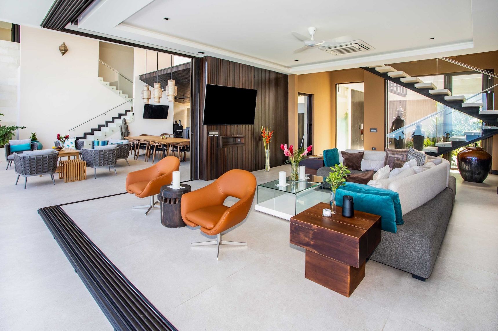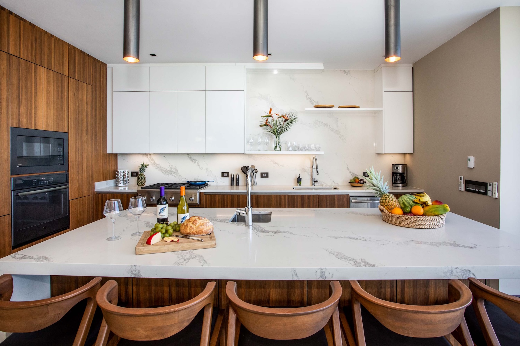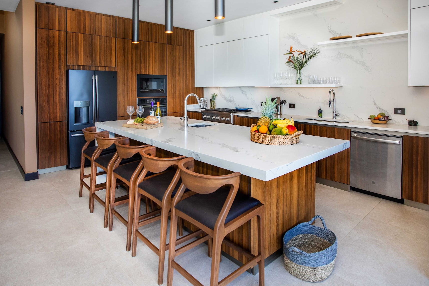 La cocina y sala de estar de concepto abierto crean un ambiente ideal para la convivencia y el entretenimiento. Equipado con electrodomésticos de alta gama, acabados de lujo y muebles elegantes, este espacio se integra armoniosamente con el exterior gracias a sus amplias puertas corredizas.