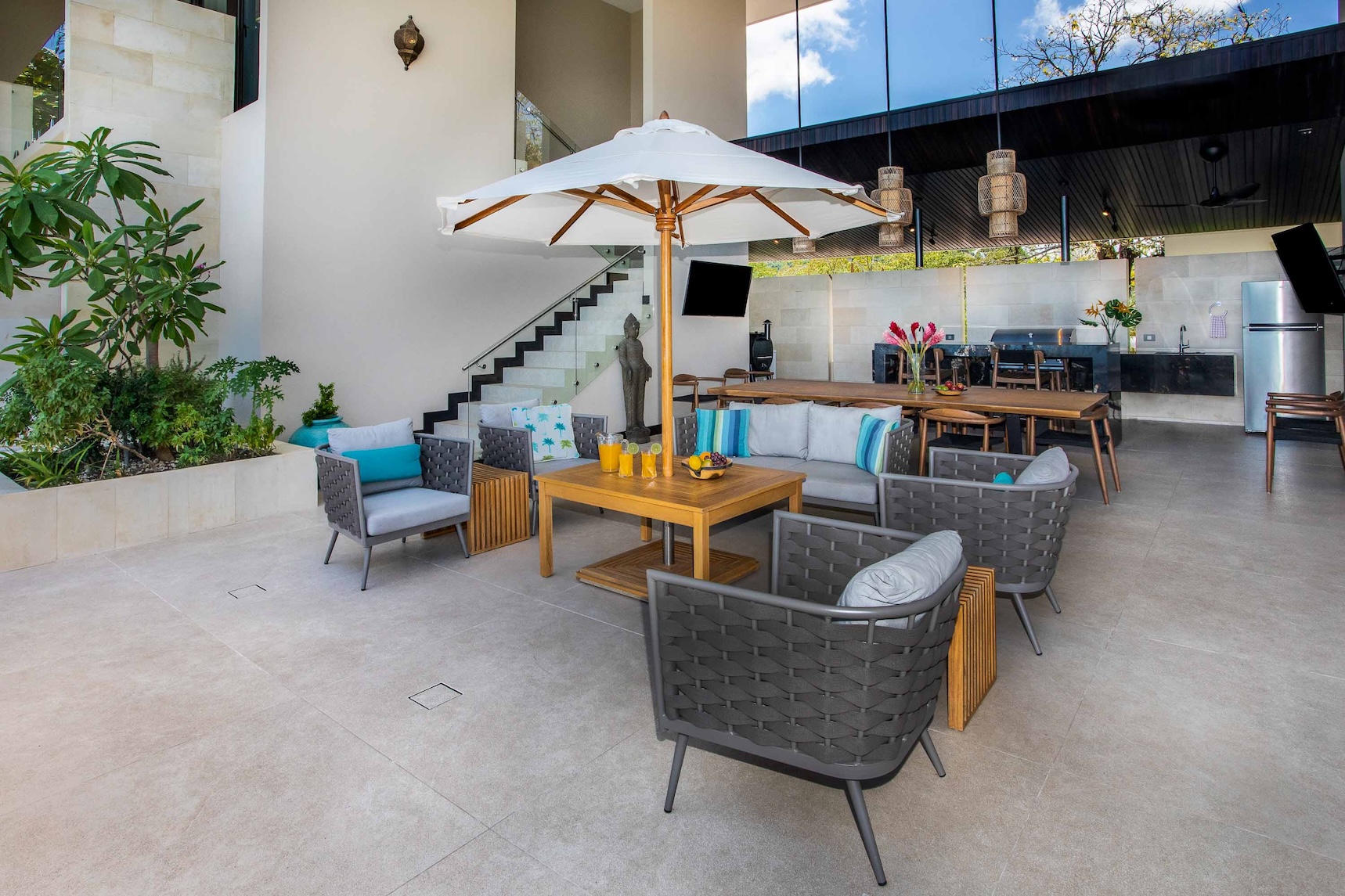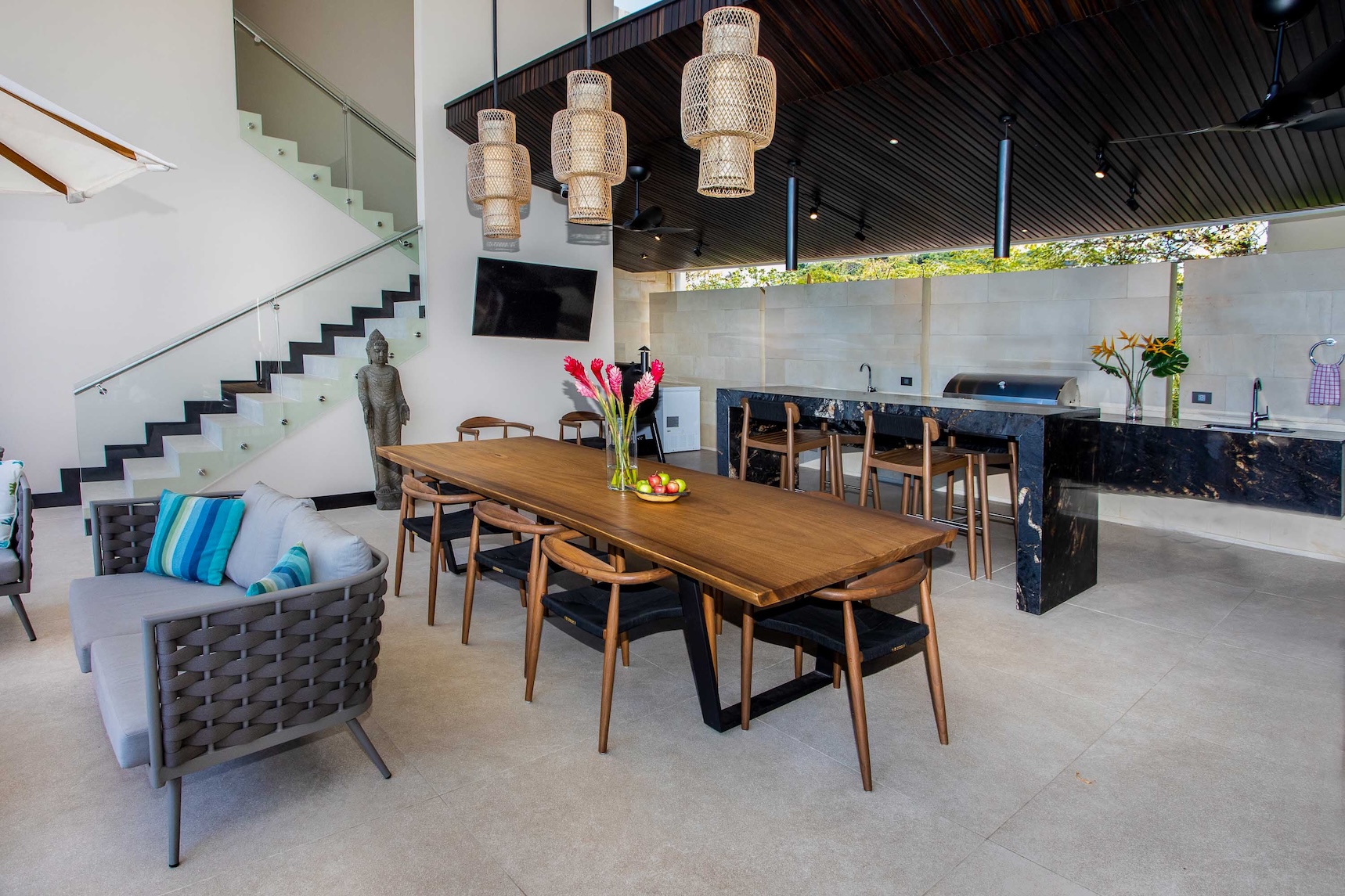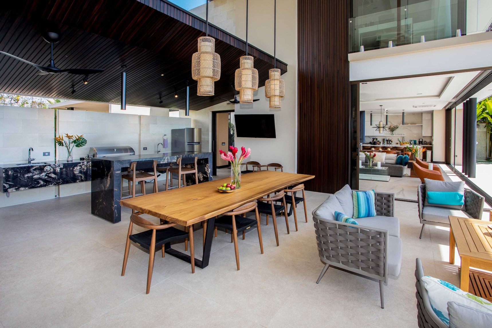 En la zona exterior, la piscina de borde infinito se mezcla visualmente con el Pacífico, creando un espacio de relajación sin igual. La amplia terraza cubierta incluye un área de comedor al aire libre y una parrilla Napoleón de primera línea, perfecta para disfrutar de cenas bajo el cielo tropical. Un medio baño y una ducha exterior brindan mayor comodidad al área de la piscina.
