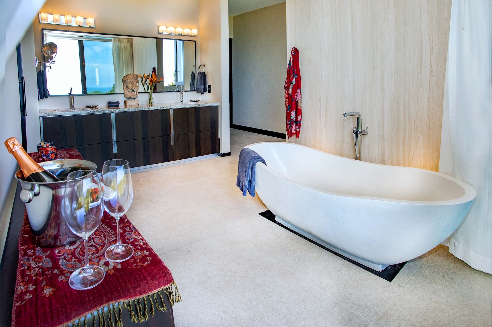 Outside, the infinity pool visually blends seamlessly with the Pacific Ocean, creating an unparalleled relaxation space. The expansive covered terrace features an al fresco dining area and a top-of-the-line Napoleon grill, perfect for enjoying meals under the tropical sky. A powder room and outdoor shower provide added convenience to the pool area.
