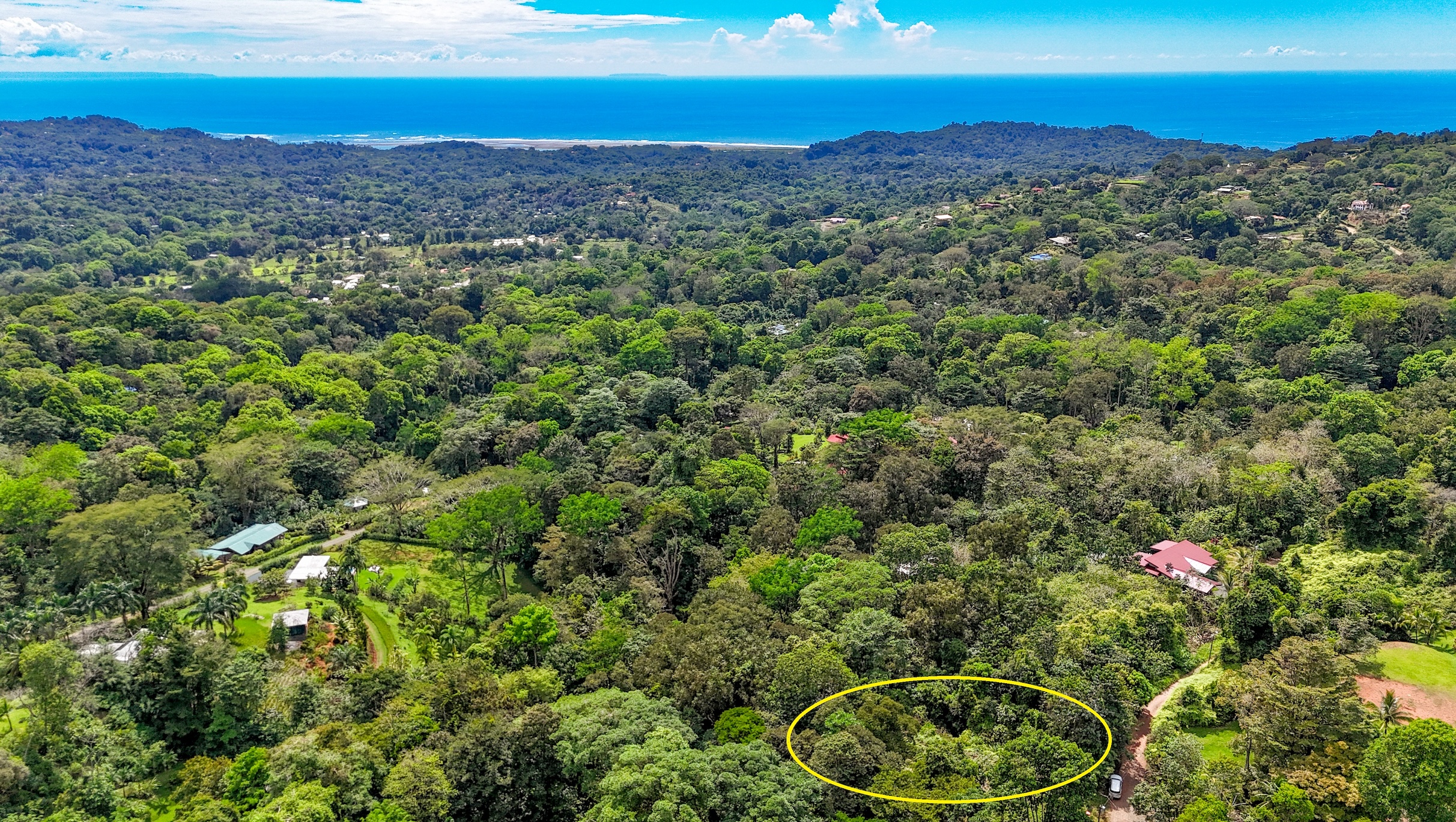 El acceso es sencillo y escénico desde la Carretera Costanera Sur, atravesando el pueblo y adentrándose en la selva hasta llegar a la propiedad. A 250 metros de altura, el clima es más fresco y se disfrutan agradables brisas marinas y de montaña.