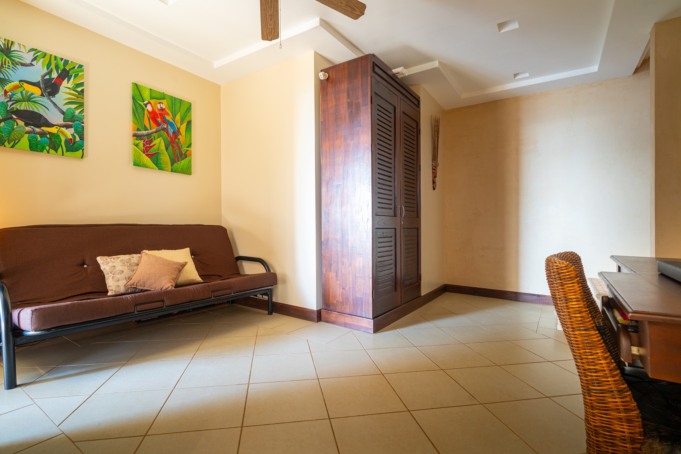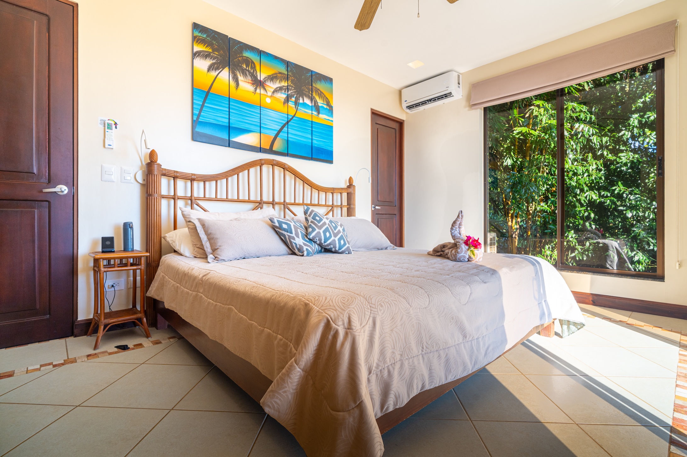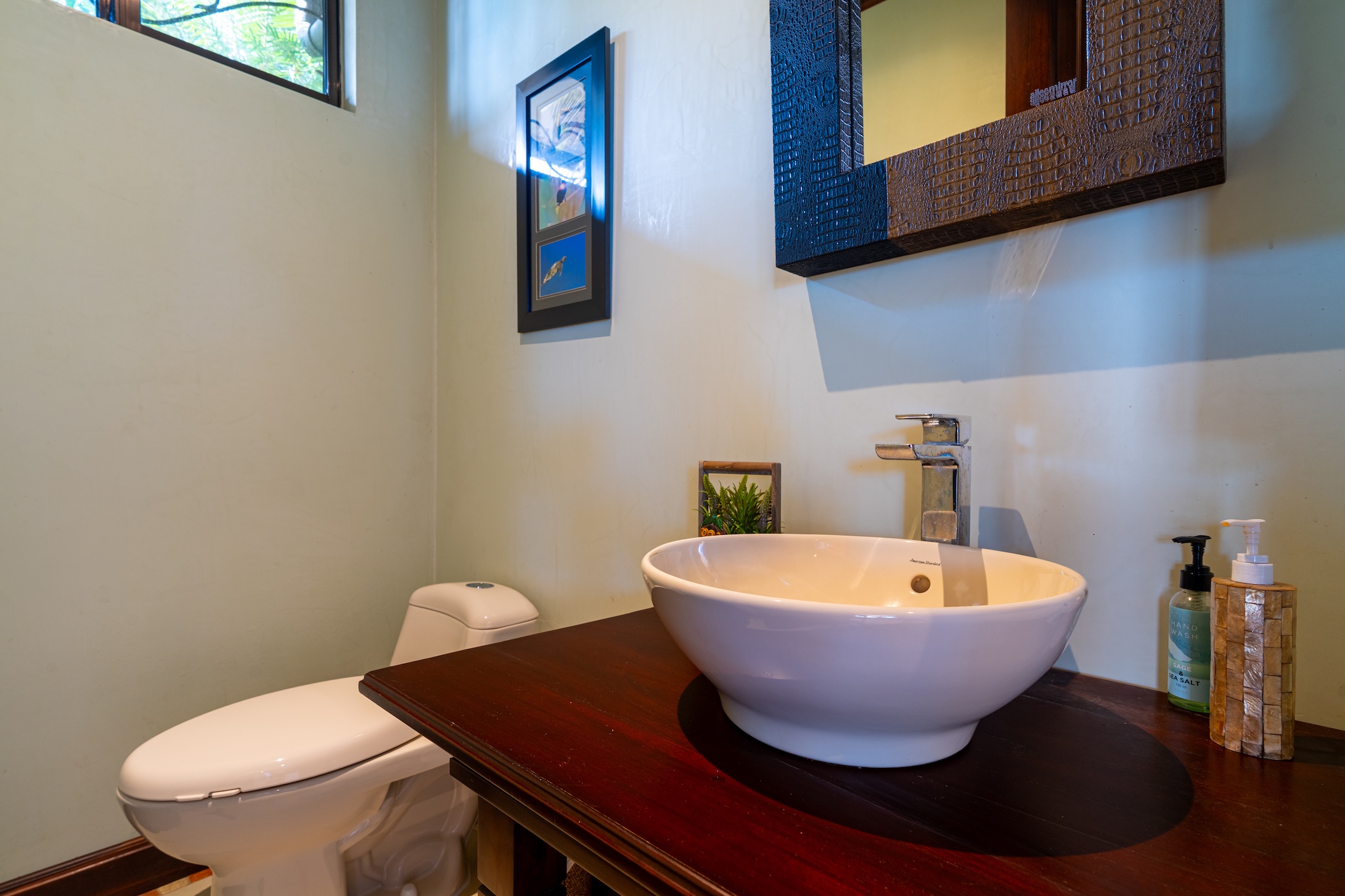 On the main level, the villa offers two spacious suites, each with a private bathroom and direct views of the infinity pool, the surrounding jungle, and the ocean. The home also includes a conveniently located laundry area and an additional futon, providing flexibility for accommodating guests.