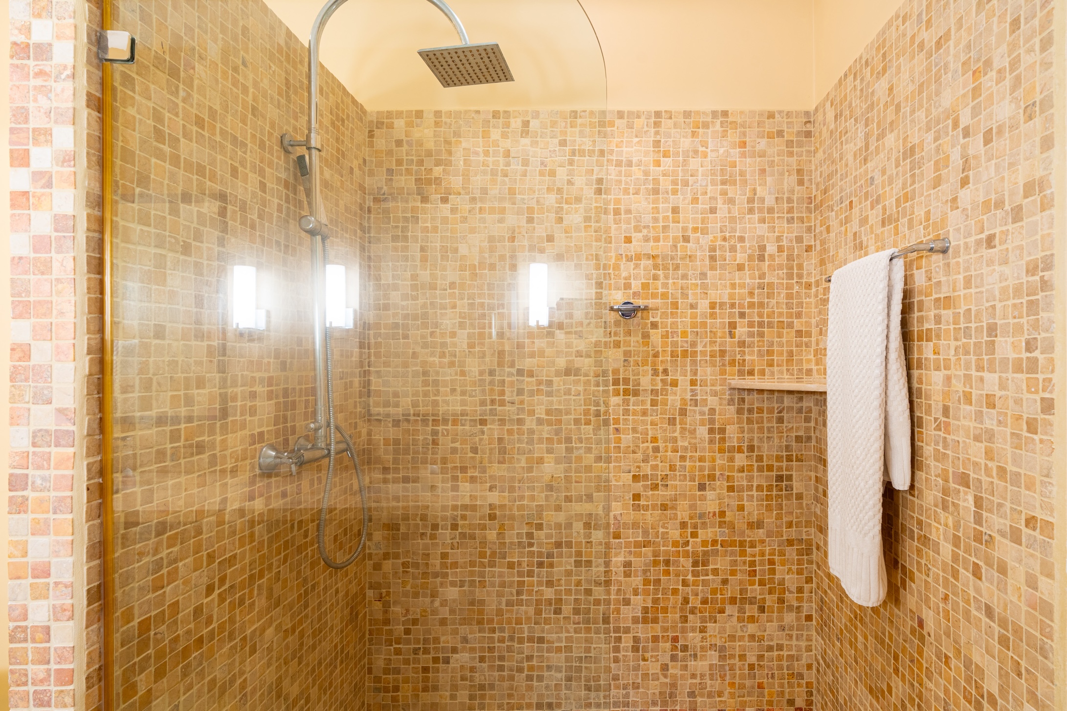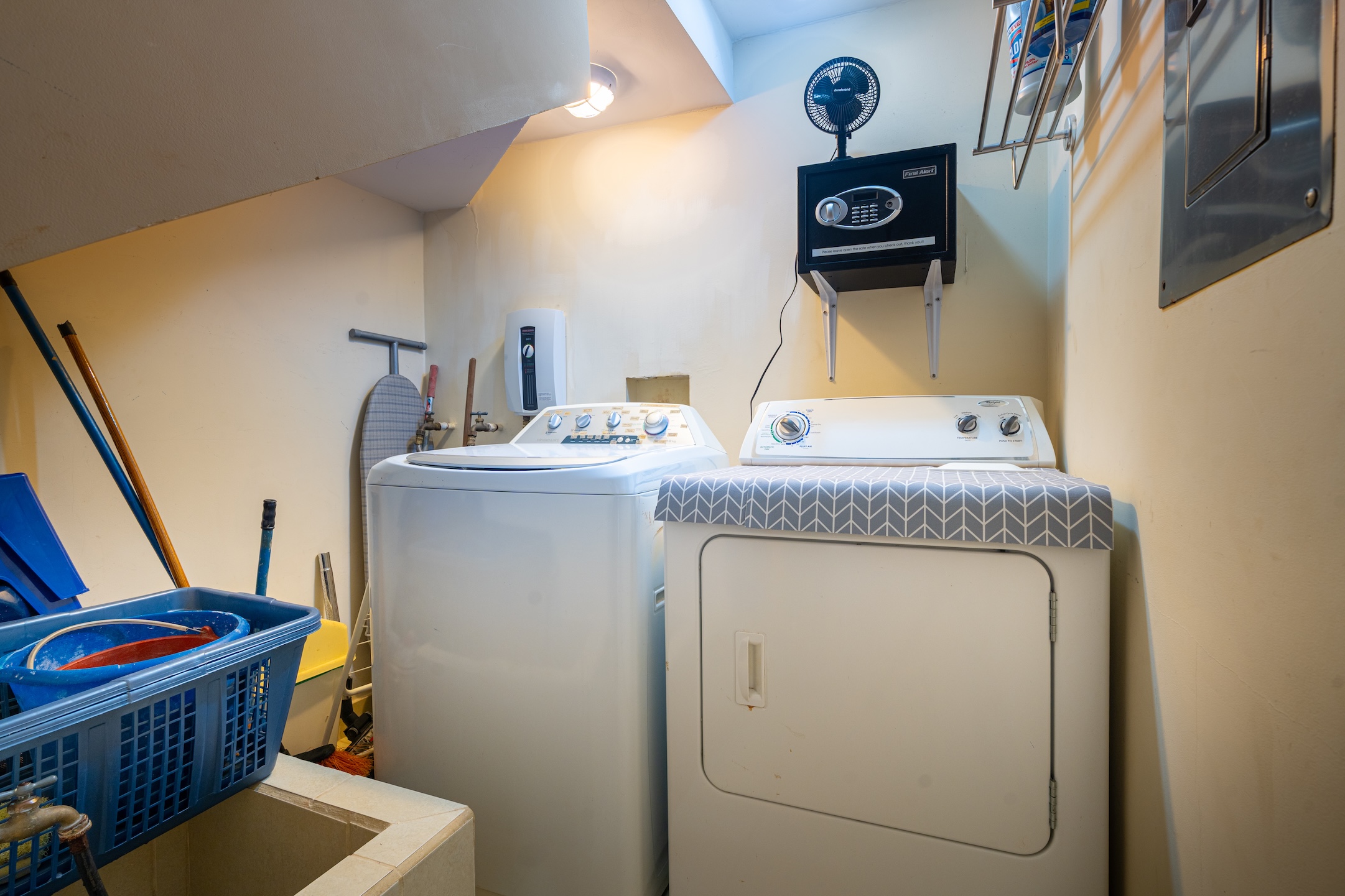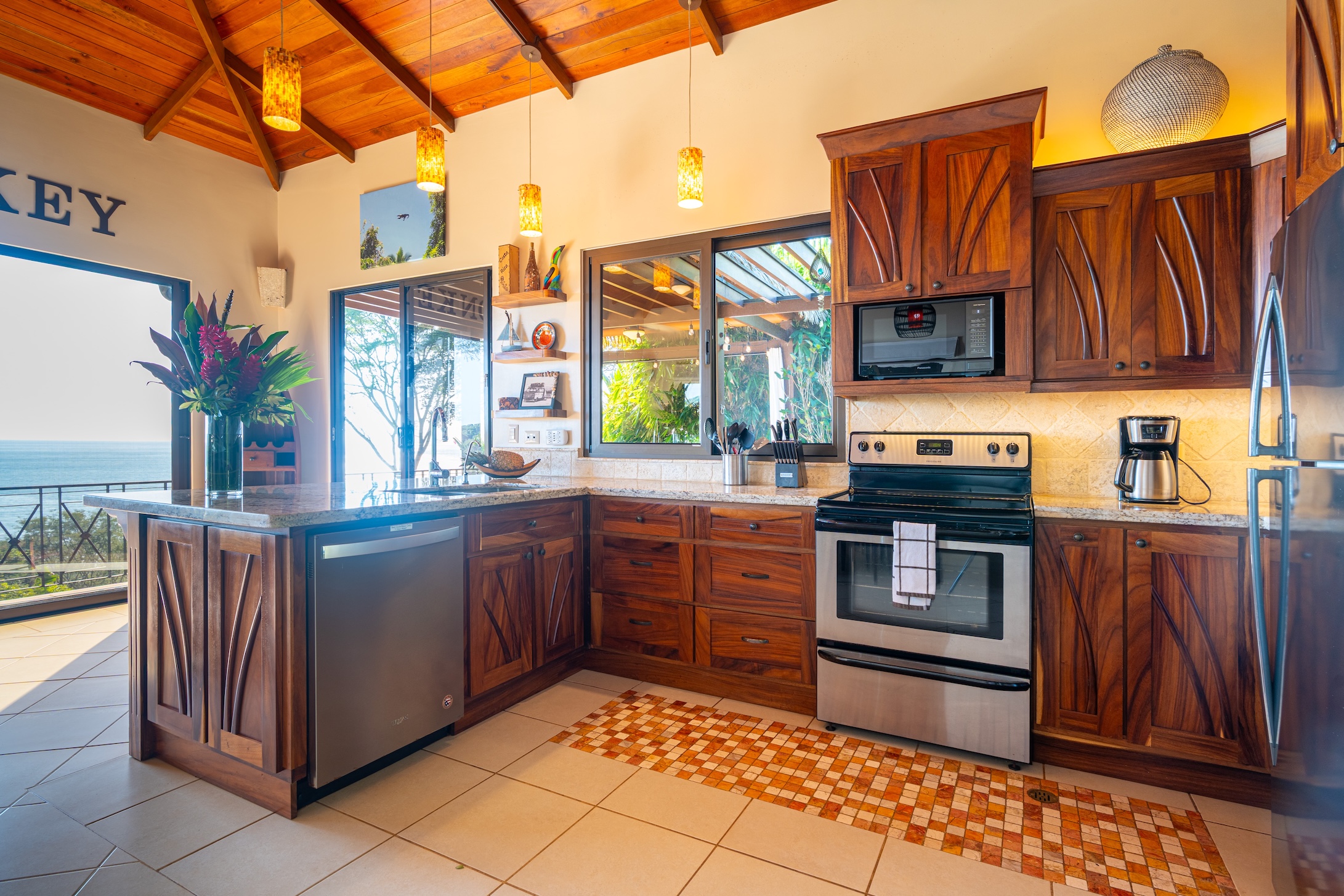 On the main level, the villa offers two spacious suites, each with a private bathroom and direct views of the infinity pool, the surrounding jungle, and the ocean. The home also includes a conveniently located laundry area and an additional futon, providing flexibility for accommodating guests.