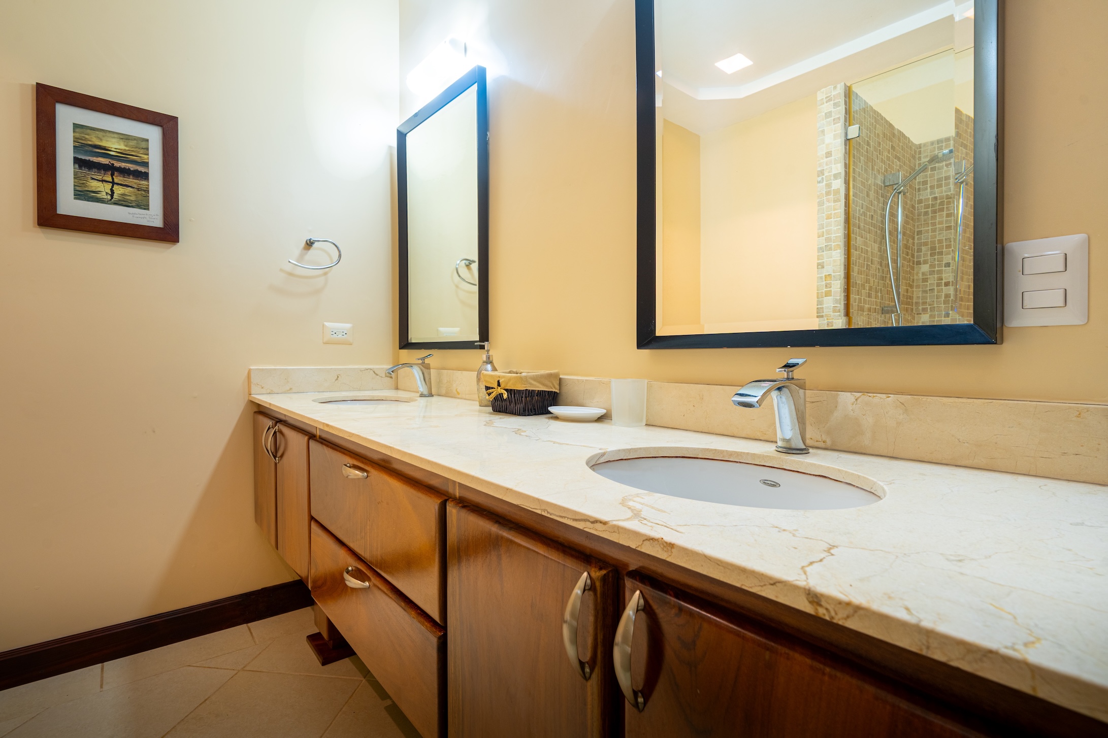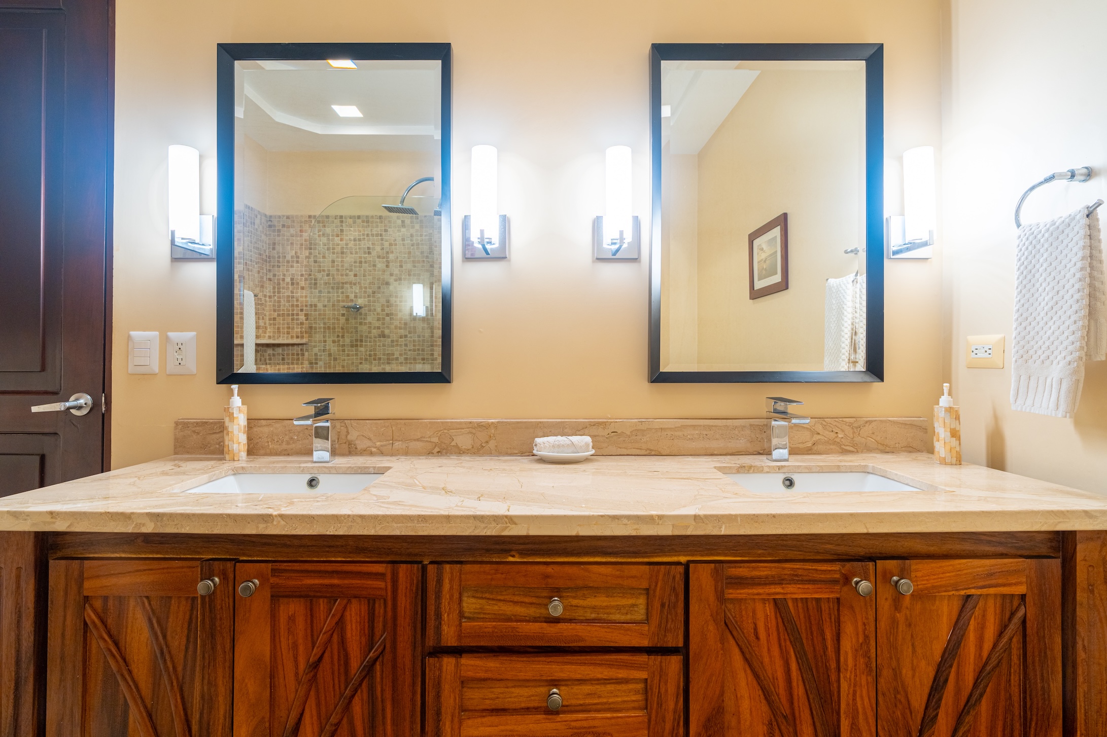 En la planta principal se encuentran dos amplias suites, cada una con baño privado y vistas directas a la piscina infinita, la selva circundante y el océano. La villa también dispone de un área de lavandería convenientemente ubicada y un futón adicional que brinda flexibilidad para alojar invitados.