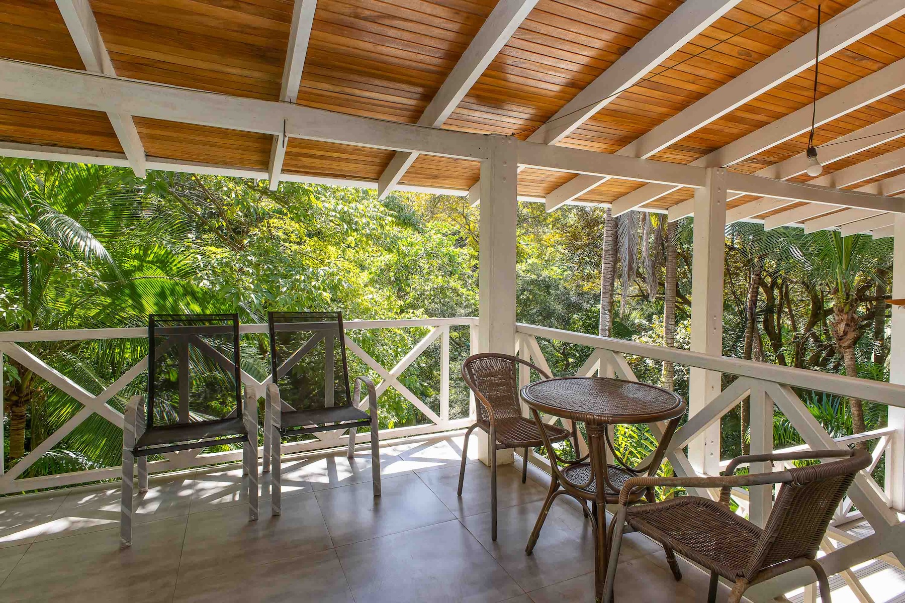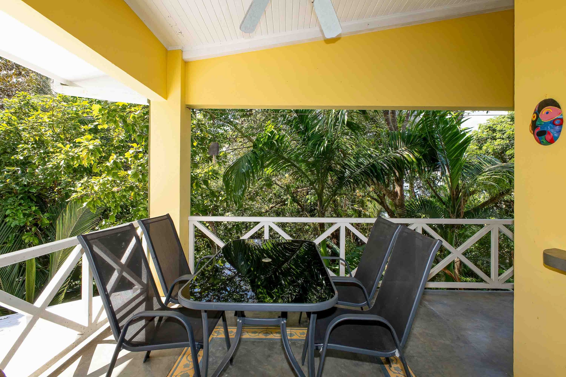On the lower level, a second one-bedroom apartment features a balcony that extends along the living area, offering sweeping jungle views. This unit also includes a full bathroom, providing a comfortable and private setting for guests or rental use.