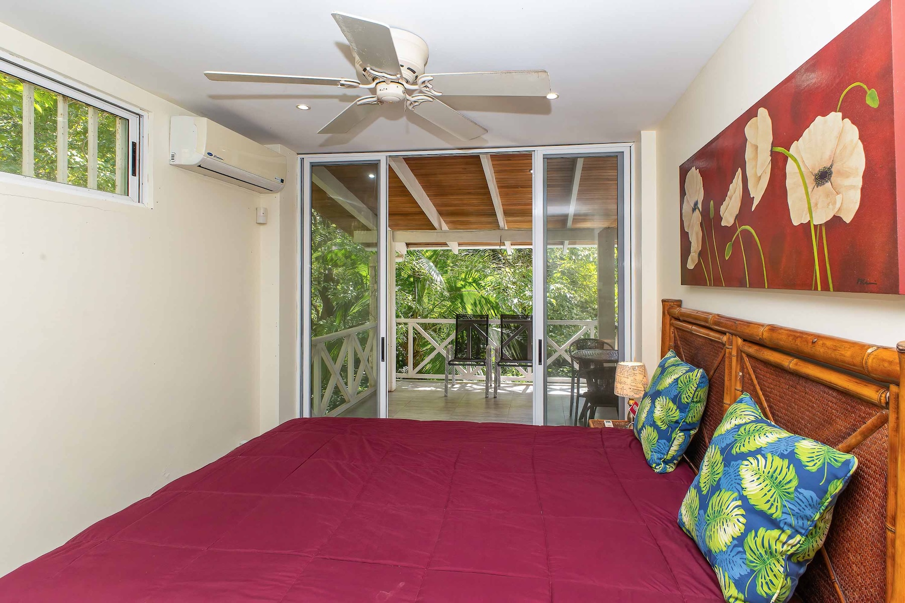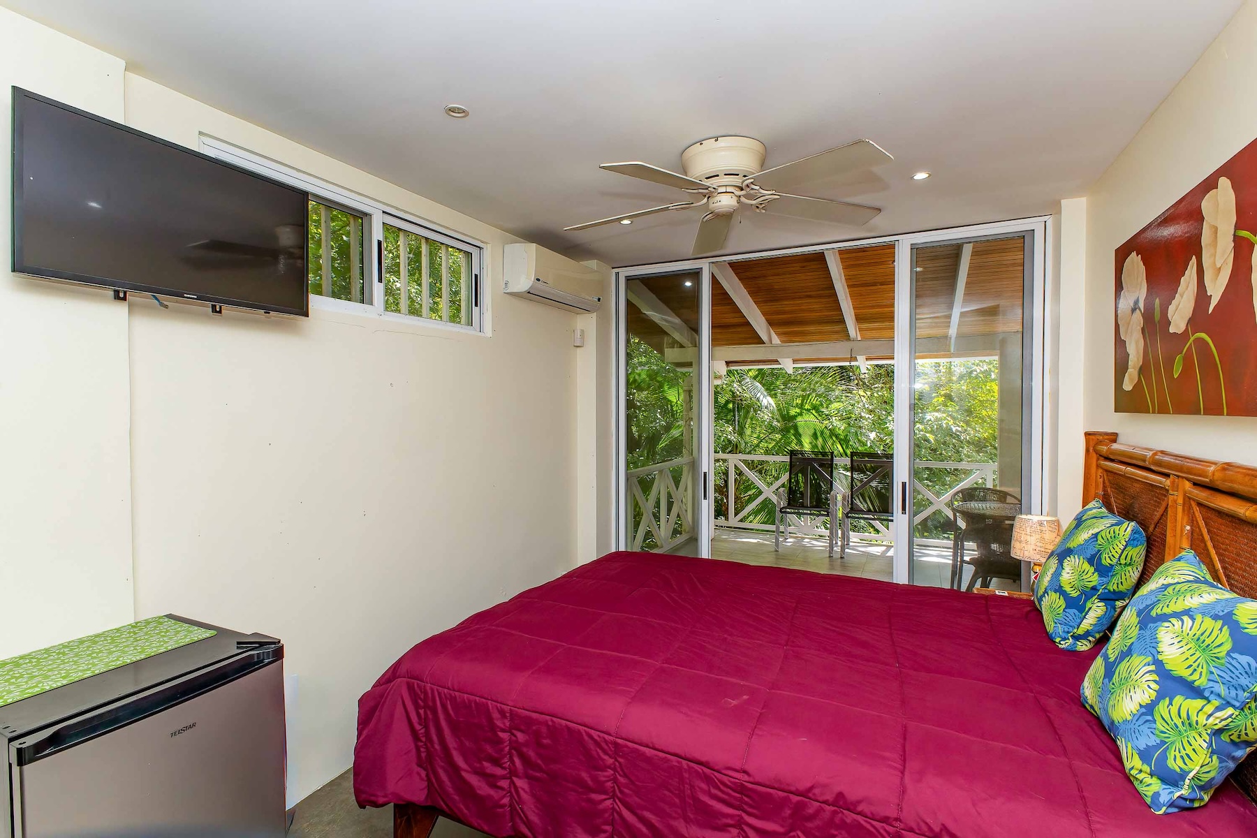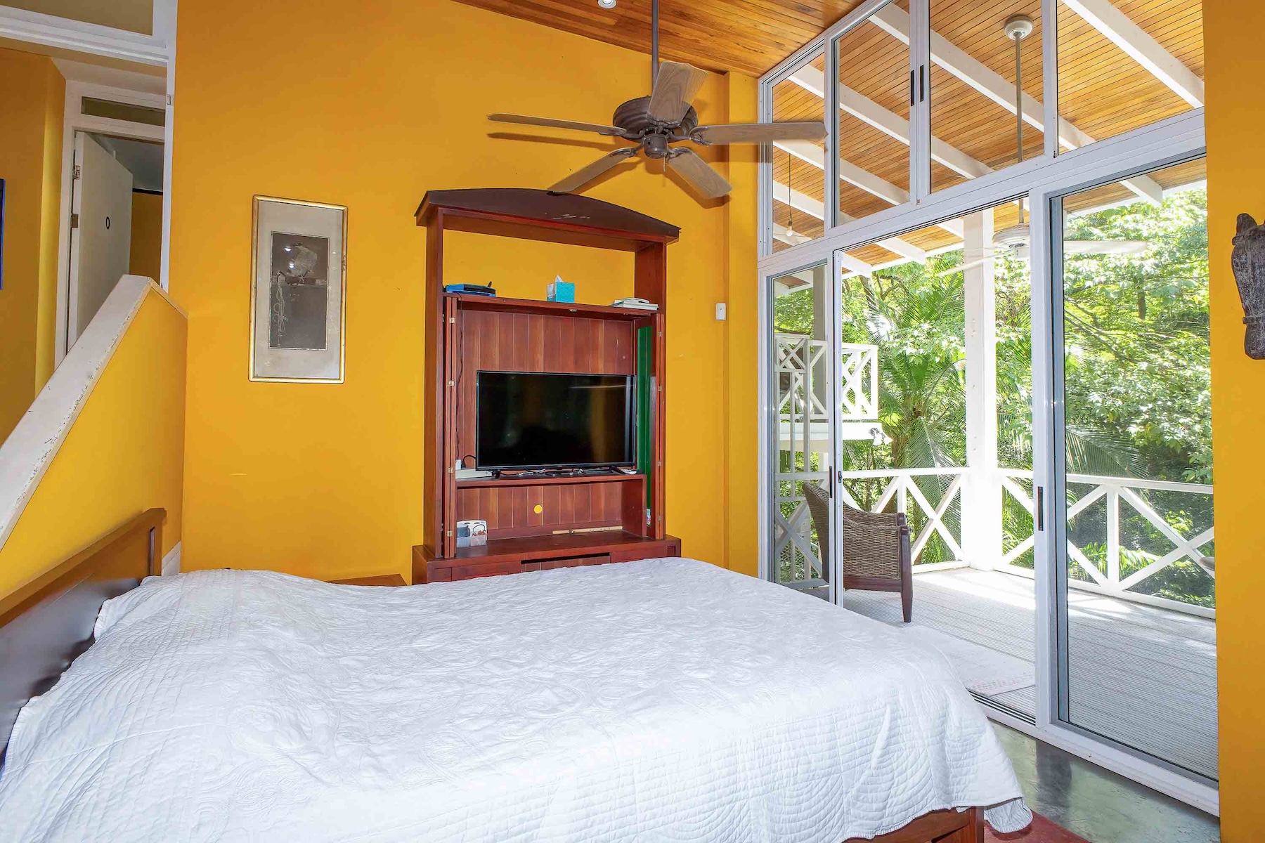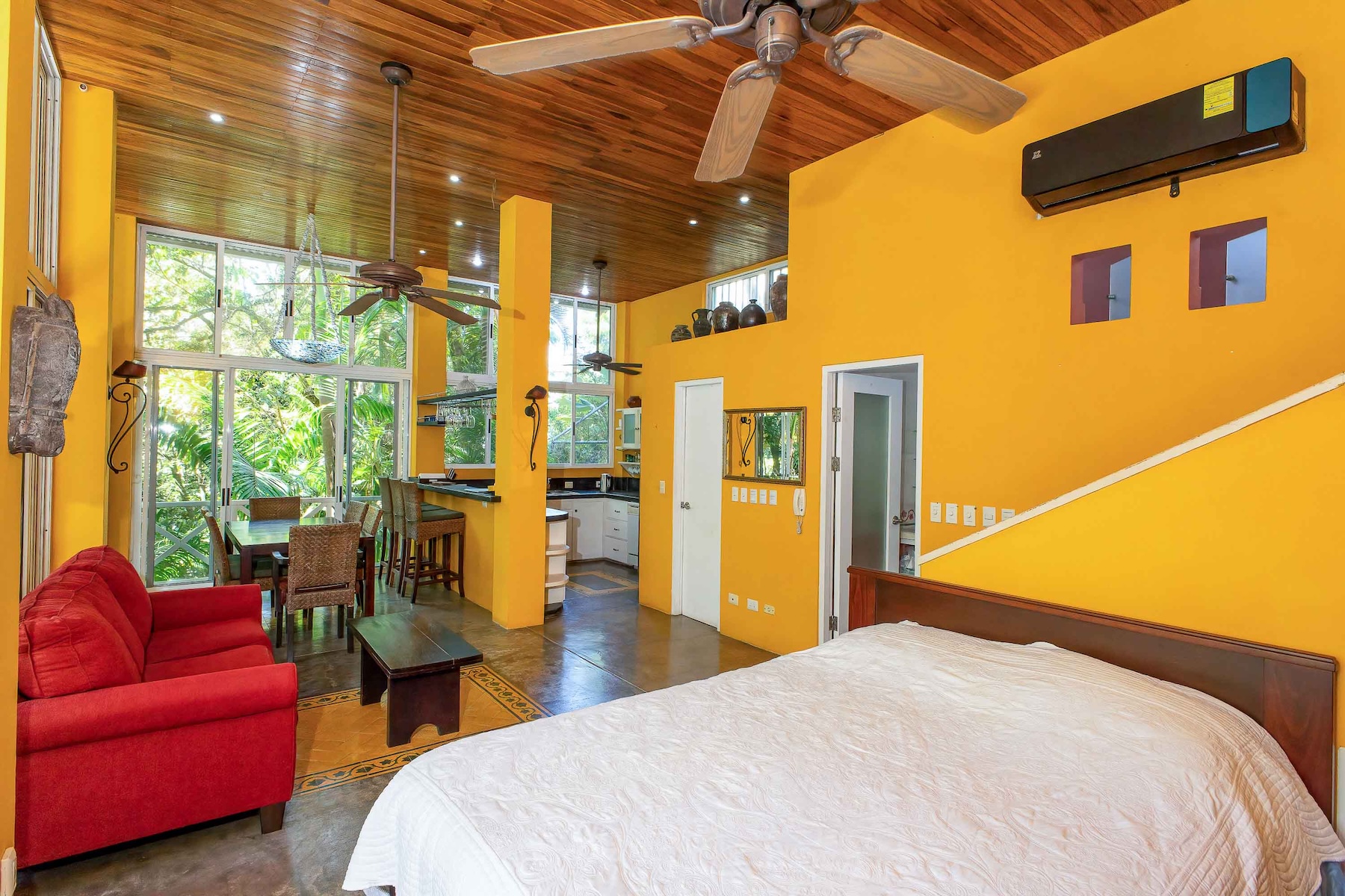 The main level hosts a one-bedroom apartment complete with a full kitchen, bathroom, and private balcony. Expansive sliding glass doors invite natural airflow and open the space to the jungle breeze and the soothing sounds of a nearby seasonal creek, while air conditioning ensures year-round comfort.