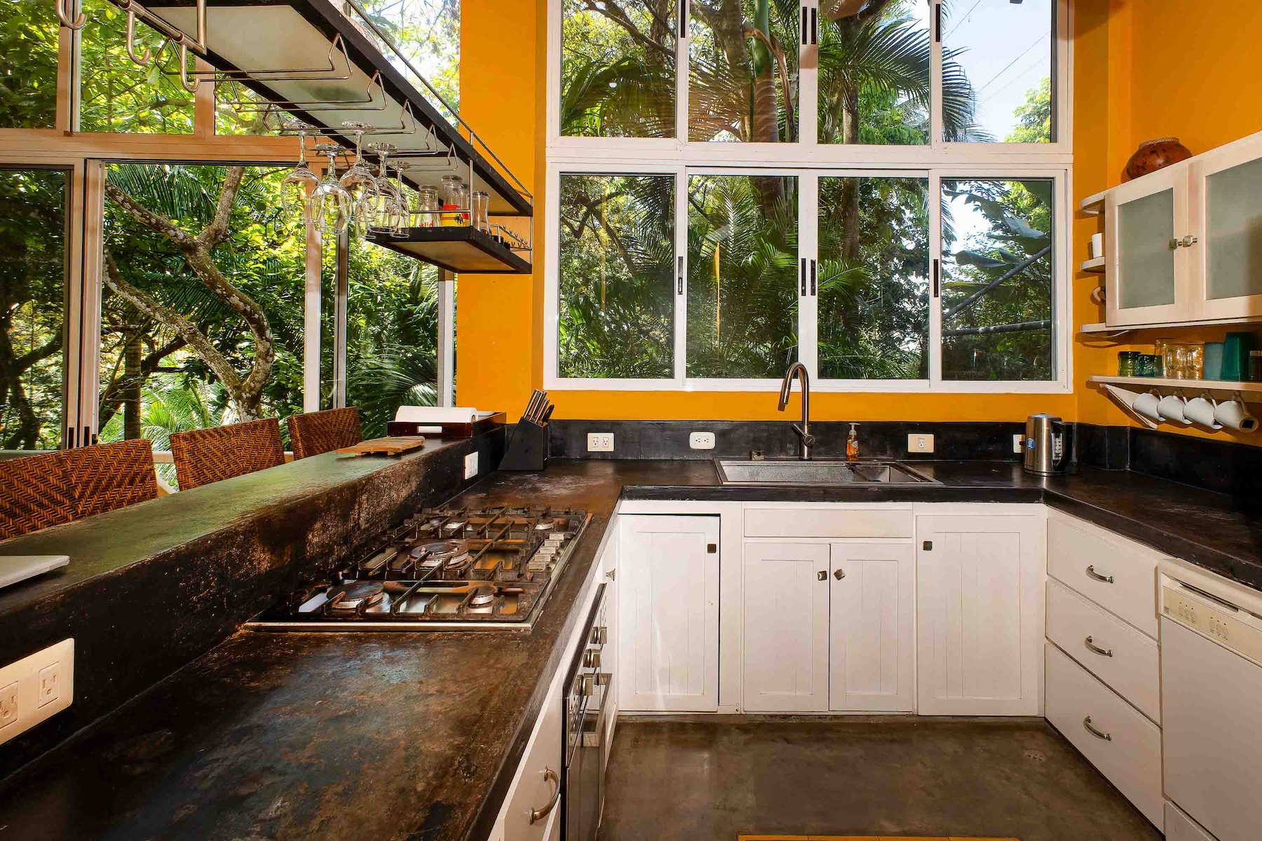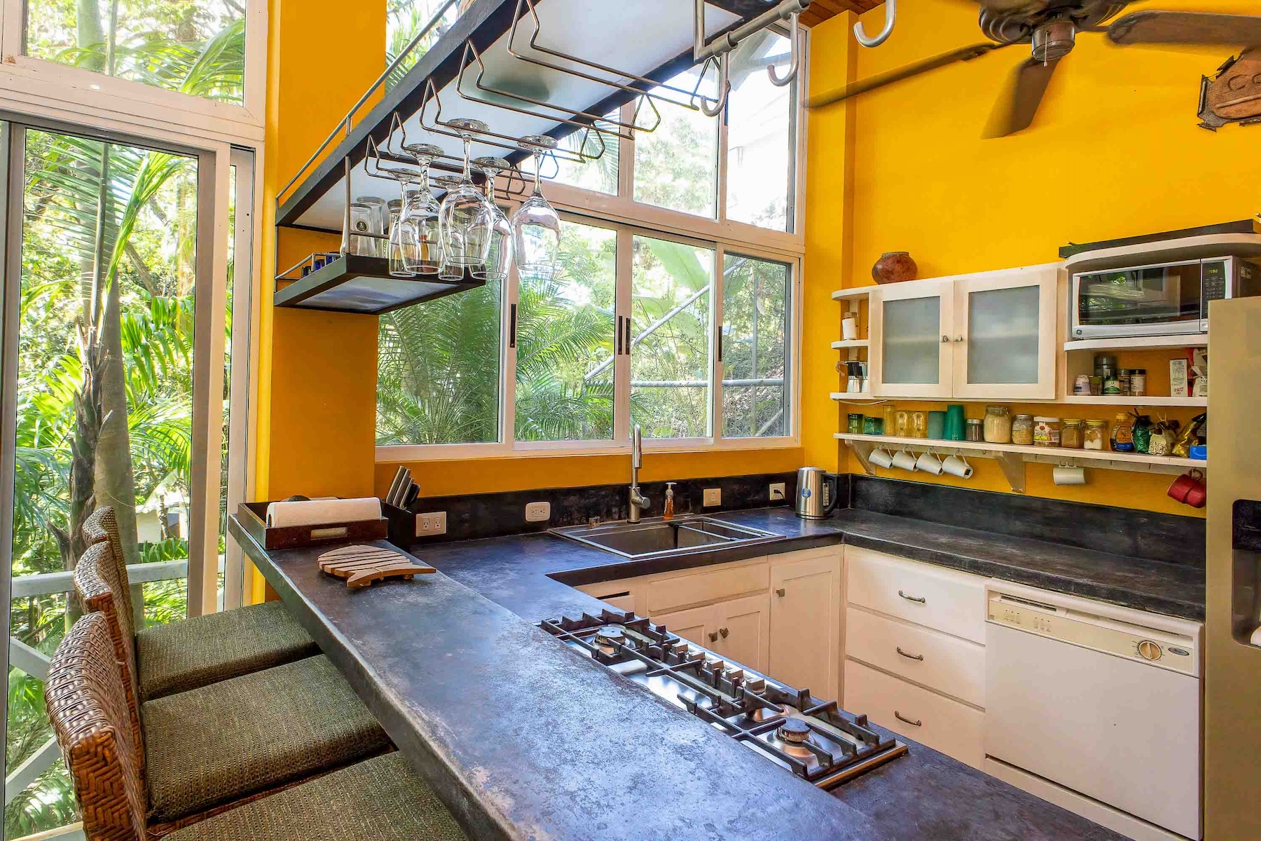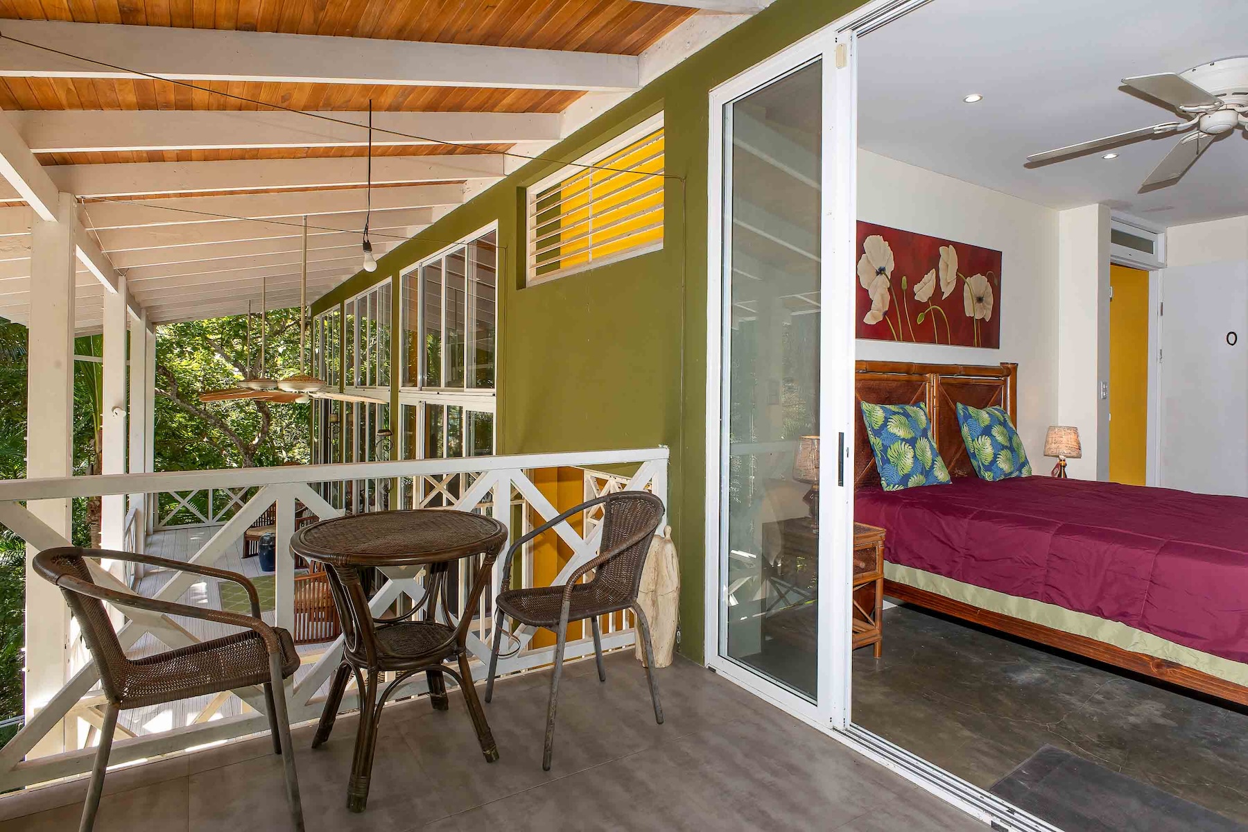 The main level hosts a one-bedroom apartment complete with a full kitchen, bathroom, and private balcony. Expansive sliding glass doors invite natural airflow and open the space to the jungle breeze and the soothing sounds of a nearby seasonal creek, while air conditioning ensures year-round comfort.
