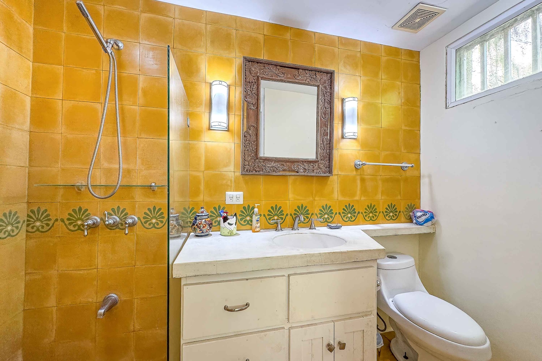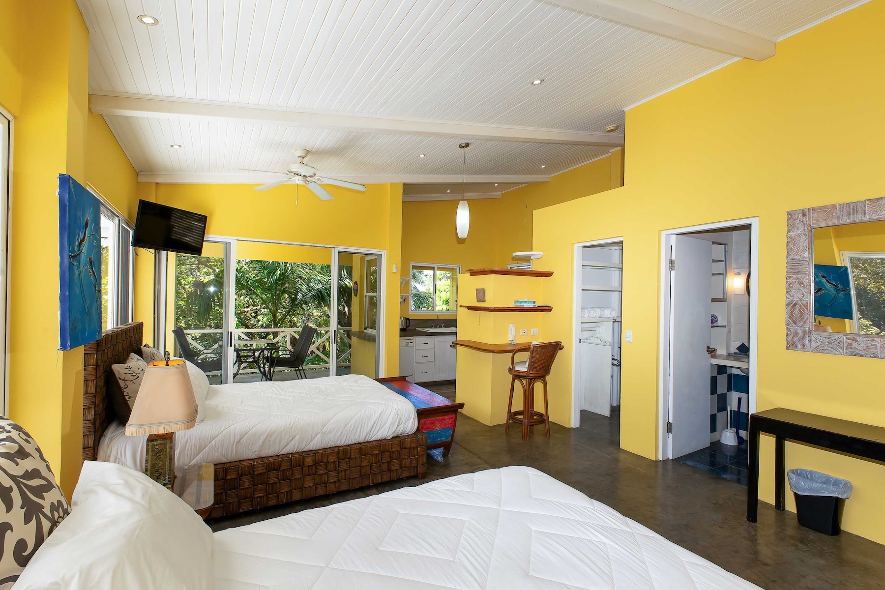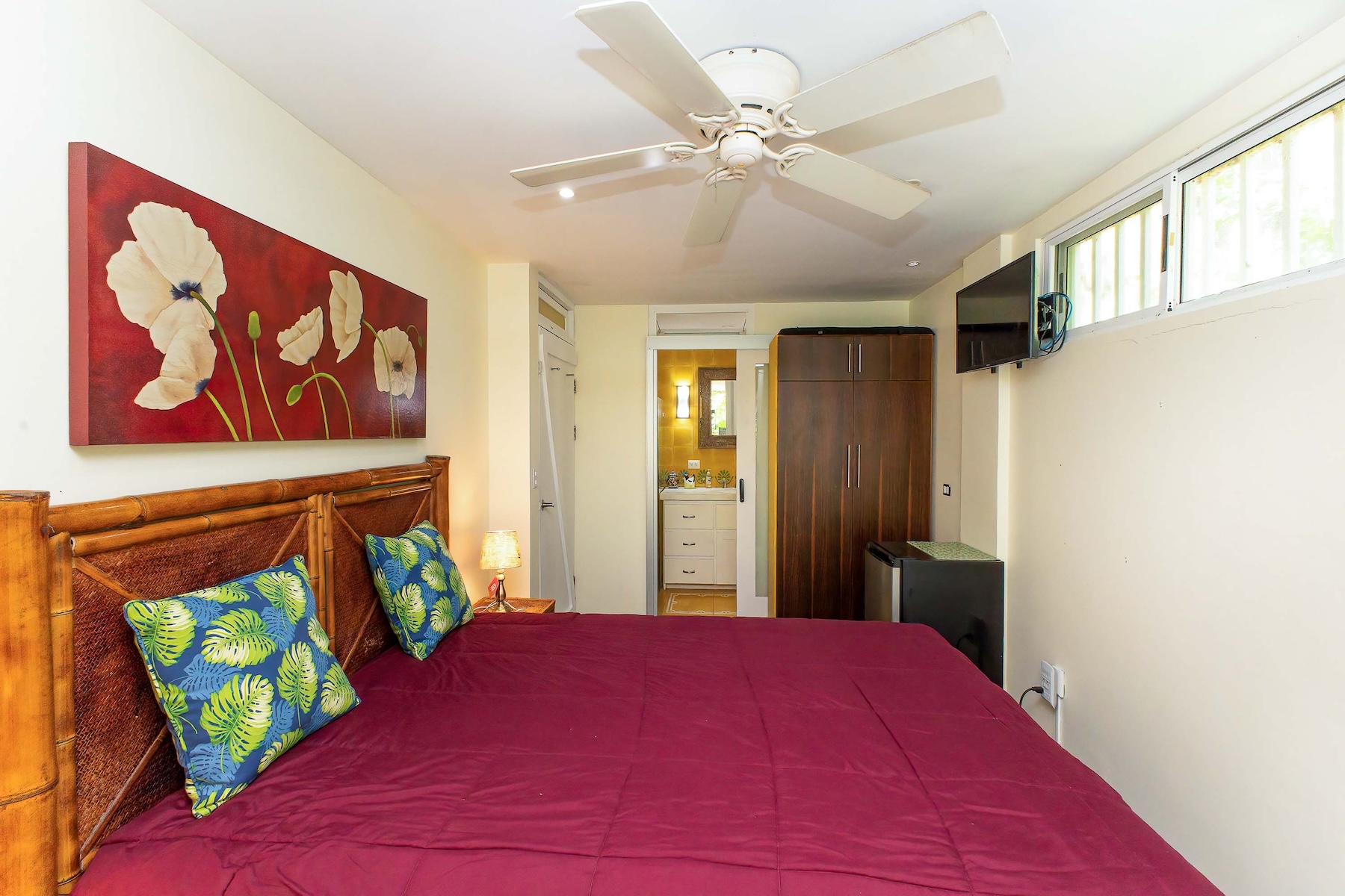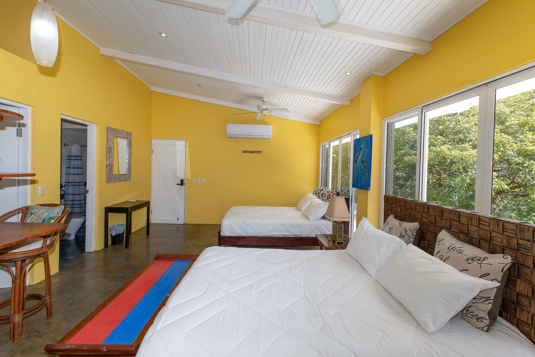 The main level hosts a one-bedroom apartment complete with a full kitchen, bathroom, and private balcony. Expansive sliding glass doors invite natural airflow and open the space to the jungle breeze and the soothing sounds of a nearby seasonal creek, while air conditioning ensures year-round comfort.