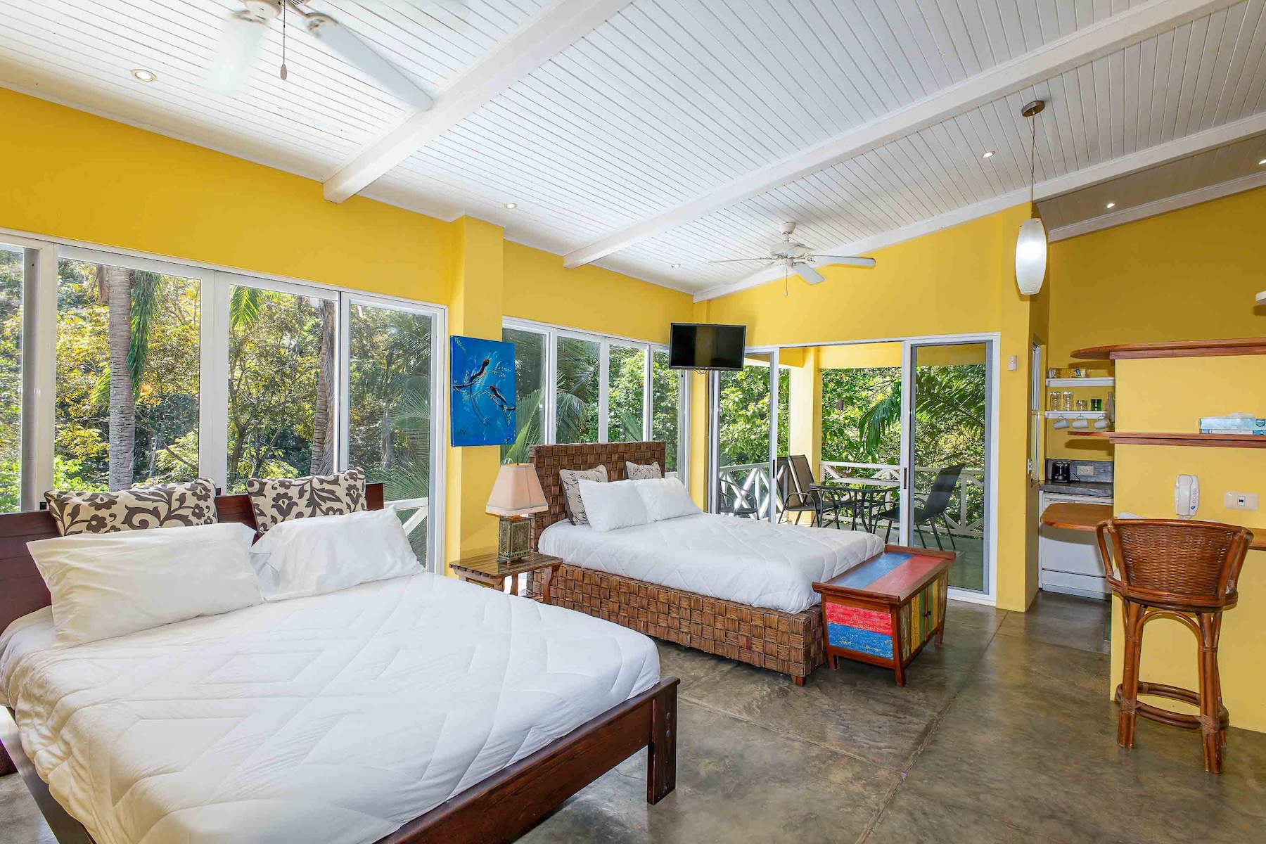 En el nivel principal se encuentra un apartamento de una habitación, equipado con cocina completa, baño y un balcón privado. Los amplios ventanales corredizos permiten una ventilación natural constante, integrando el interior con la brisa de la selva y los sonidos relajantes de un arroyo estacional cercano, mientras que el aire acondicionado garantiza confort en cualquier época del año.