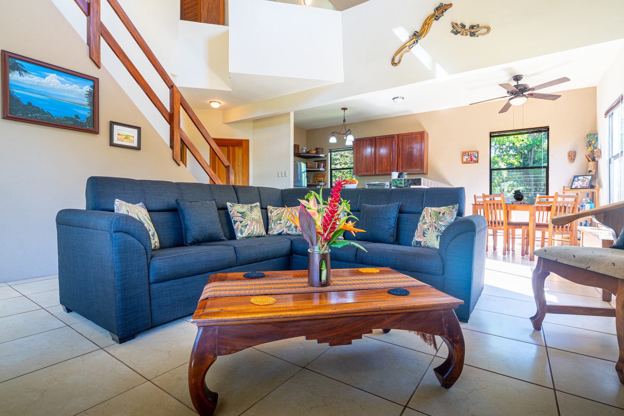 Imagina empezar el día así: los primeros rayos del sol se filtran por las ventanas, mientras el sonido de dos guacamayos rojos posados en el almendro del jardín te despierta suavemente. La naturaleza marca el ritmo de la mañana. Con una taza de café en la mano —preparado con granos recién molidos del mercado local de agricultores de Bahía— te balanceas en tu mecedora, dejando que la brisa matutina te envuelva mientras observas el ir y venir de las aves en el manglar. Respiras profundo, conectado con la belleza que te rodea. En ese momento, todo está bien; la vida se siente plena.