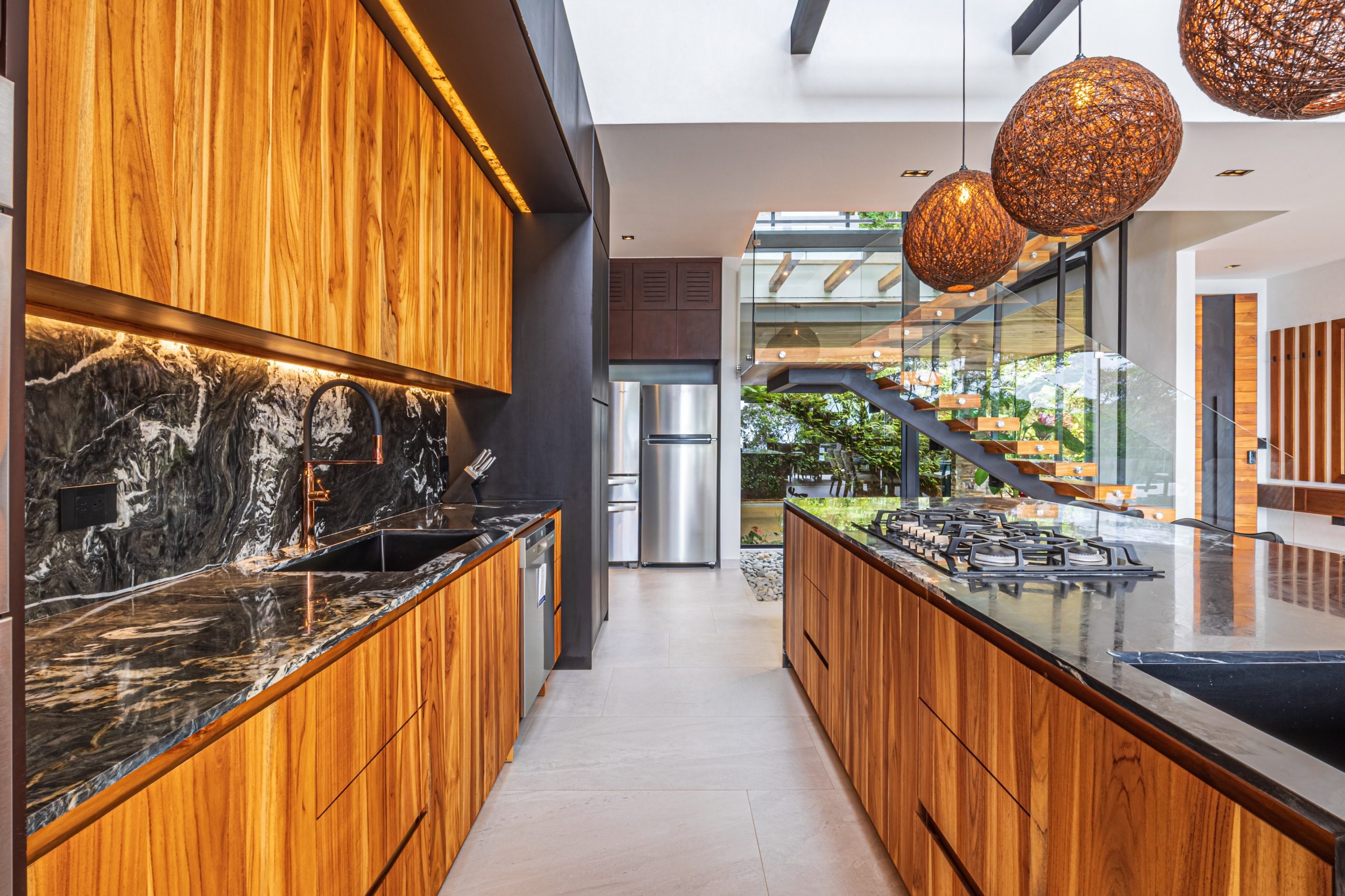 The modern kitchen with top-of-the-line appliances and ample island for entertaining has unique LED lighting. Spacious living room and dining space open to the outdoor terrace and pool. There is an outdoor bbq area and an interior and exterior fire place. The pool one-of-a-kind with a free-floating section with clear glass. The pool waterfalls 20 feet to a lower pool for the lower guest apartment. Also, a sunken jacuzzi on the terrace by the pool for the cool evenings and nights.