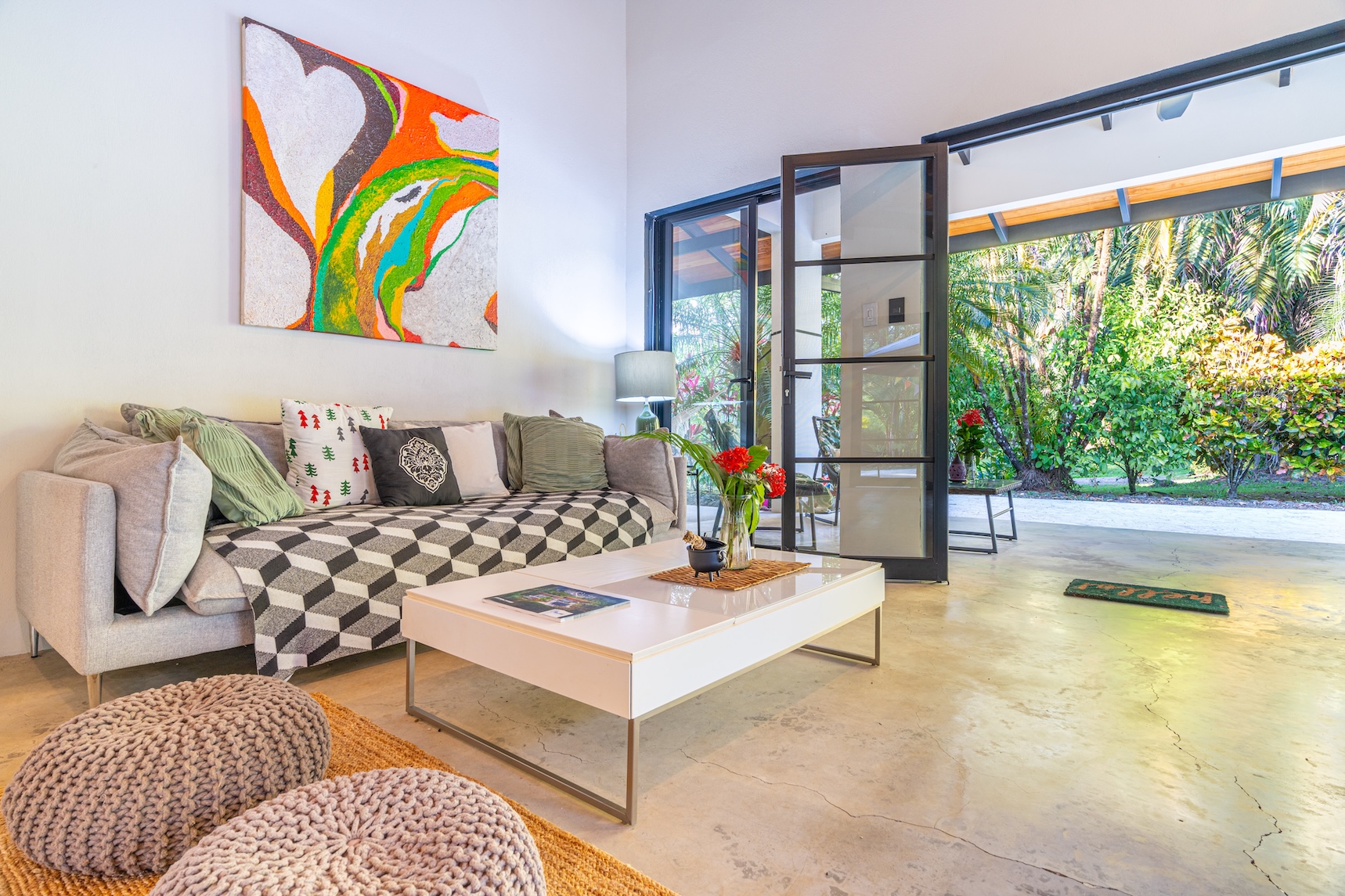 La casa, de una planta y diseño abierto, es práctica y fácil de mantener. La cocina de estilo europeo incluye encimeras de hormigón, fregadero profesional, amplio espacio de trabajo, estufa de gas y un horno eléctrico vintage, ideal para disfrutar momentos tranquilos mientras se observa la vegetación que rodea la propiedad.