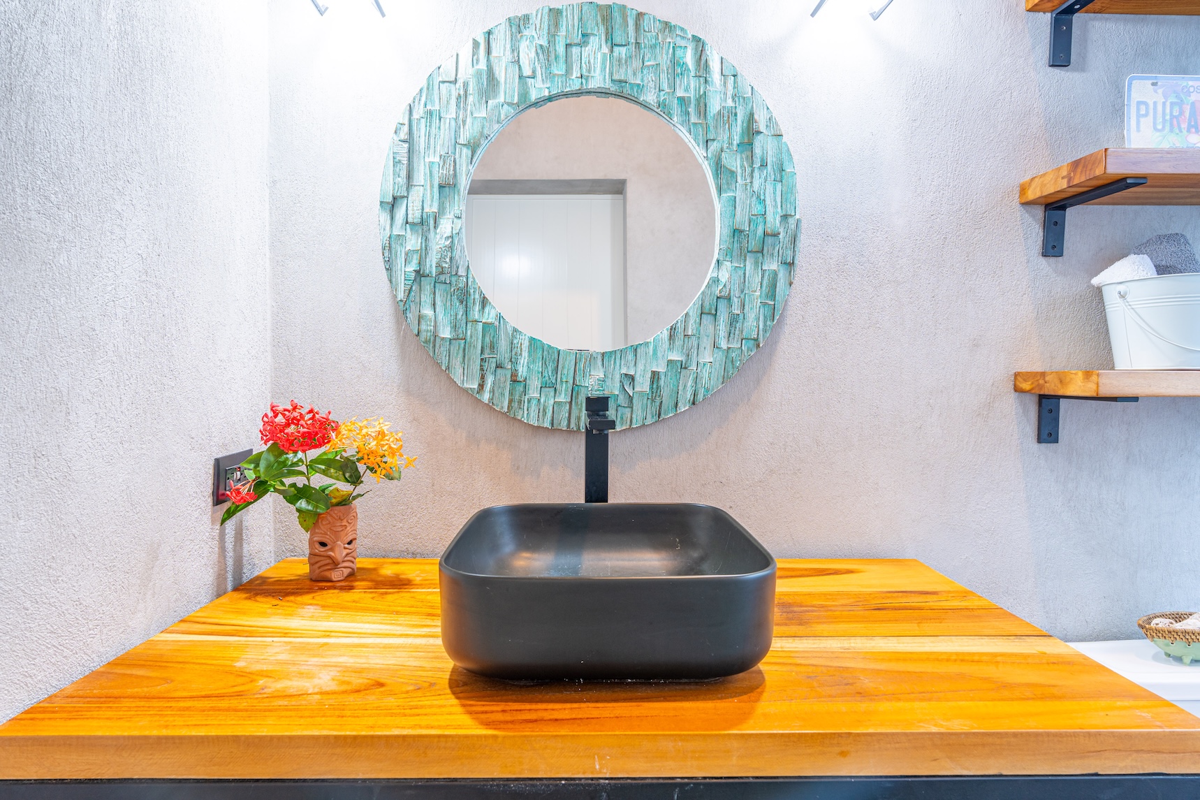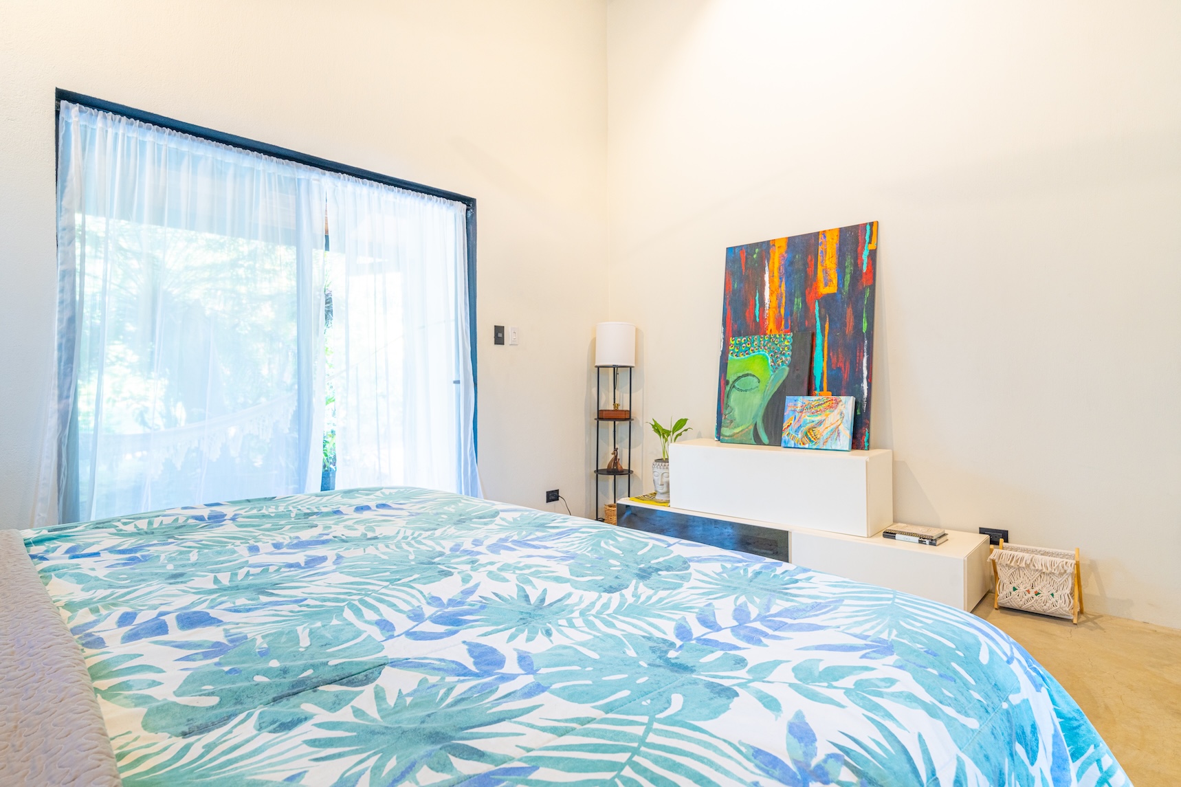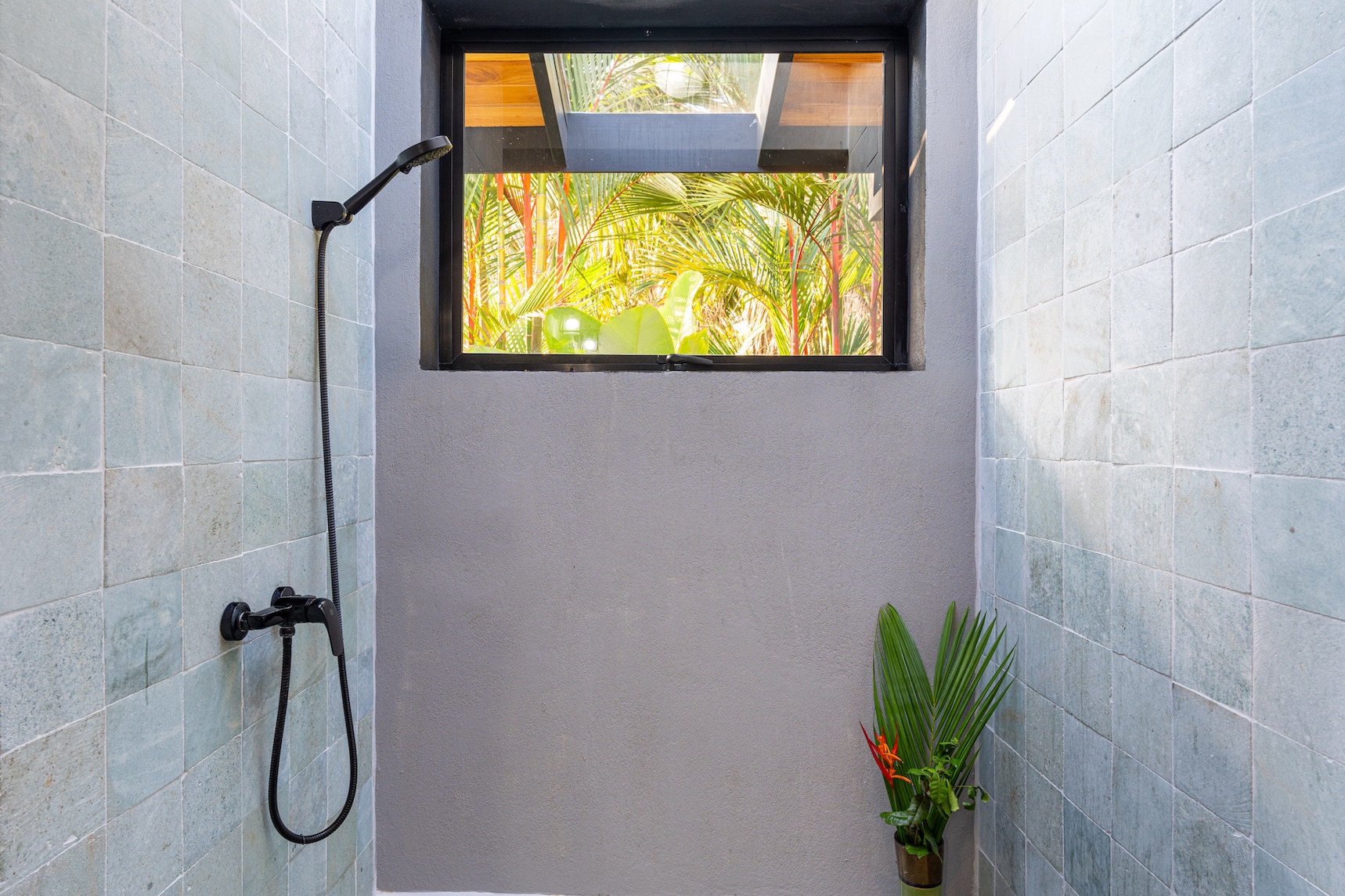 The two master suites feature new air conditioning, spacious layouts, and private bathrooms. The showers are distinguished by their green Sukabumi stone, which complements the natural concrete walls and floors. Skylights allow natural light to flood in, creating a seamless blend of indoors and outdoors.