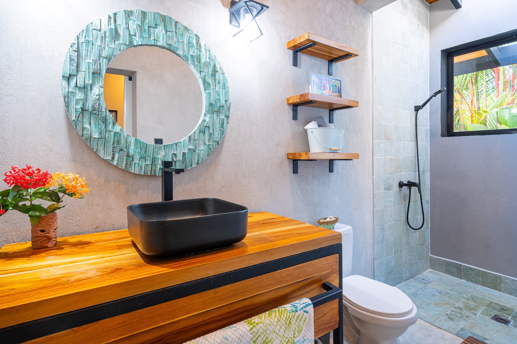 Las dos suites principales cuentan con nuevos aires acondicionados, amplitud y baños privados. Las duchas destacan por su piedra verde de Sukabumi, que realza paredes y pisos de hormigón natural. Los tragaluces permiten la entrada de luz natural, creando una experiencia que fusiona interior y exterior.