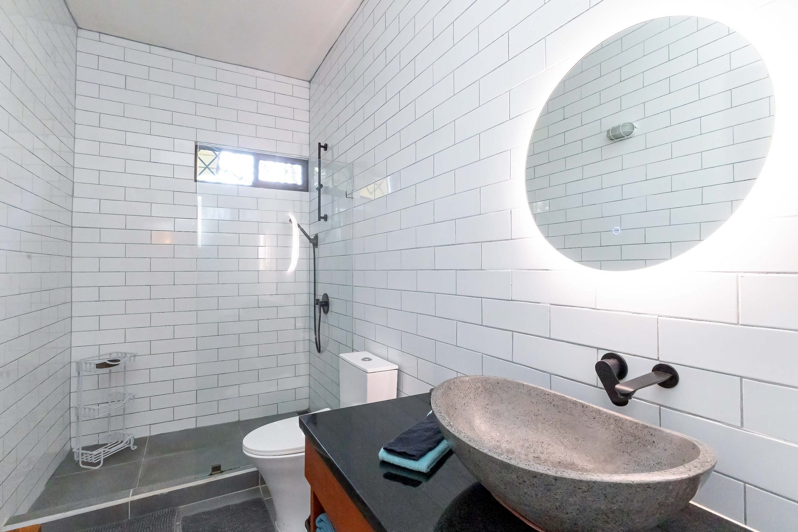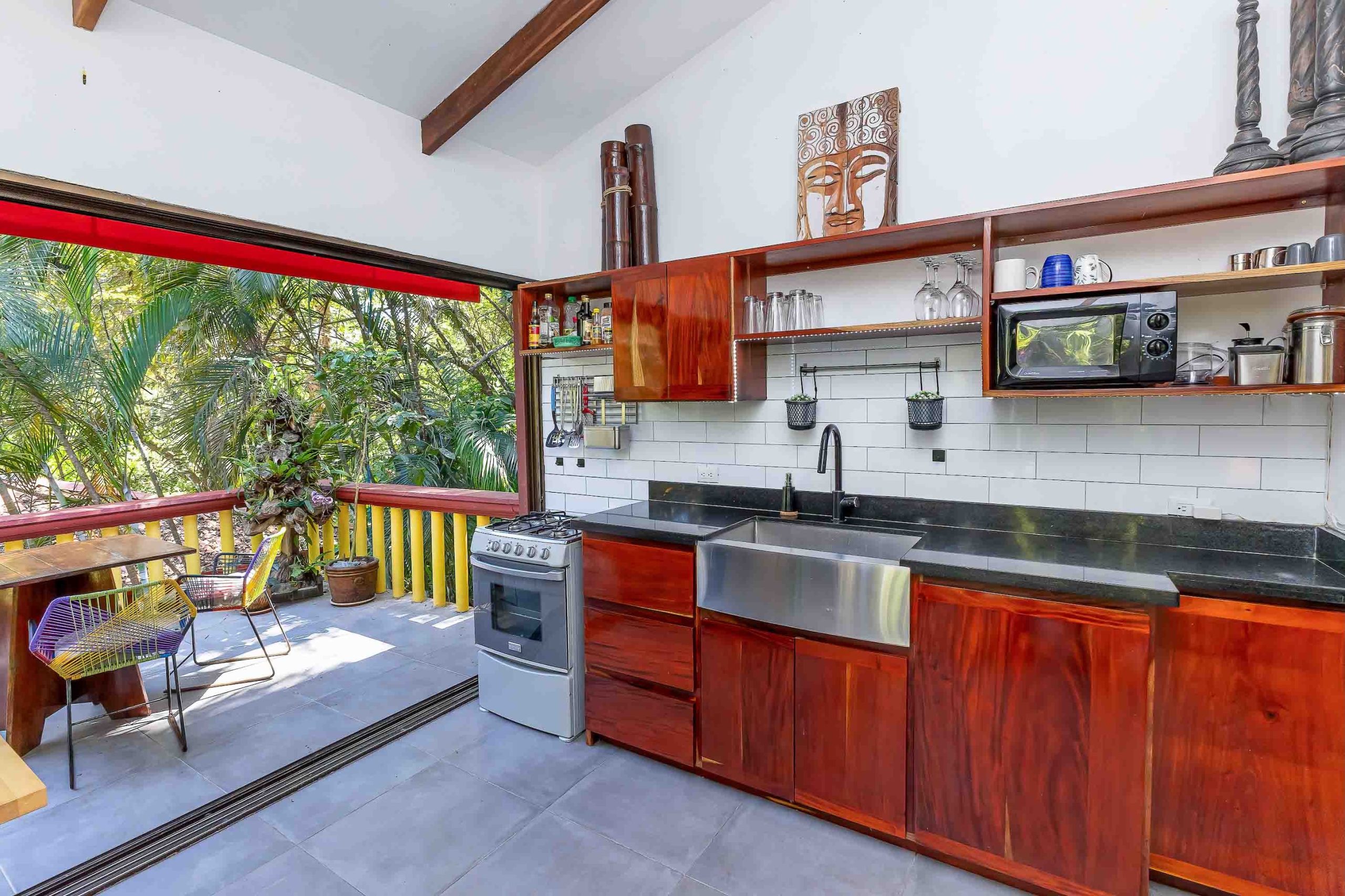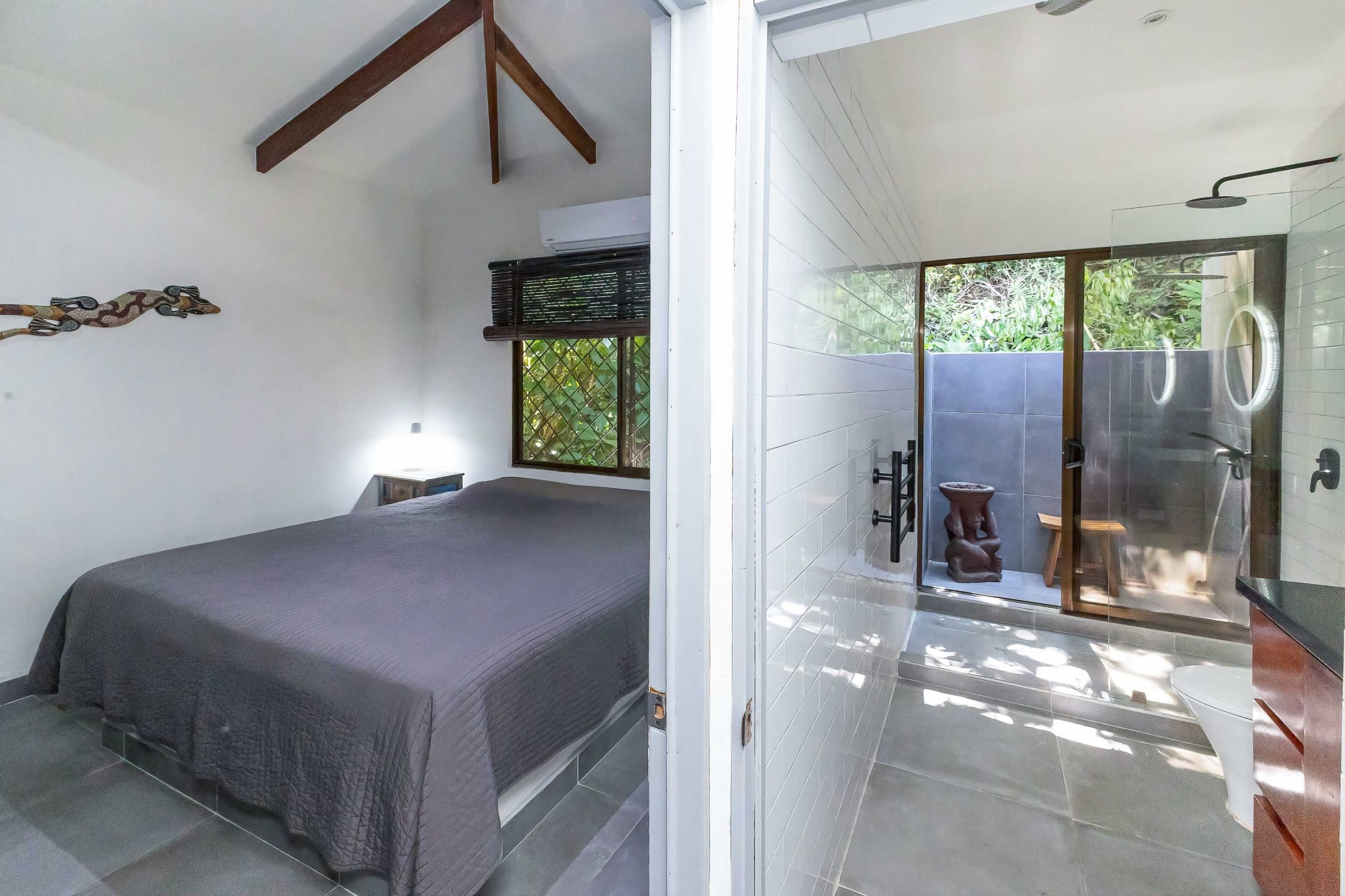 A bright and spacious two-bedroom, one-bath unit featuring a full kitchen, a cozy living area, and an outdoor terrace nestled among the treetops. The bathroom includes an adjoining outdoor shower, offering a unique nature-immersive experience.