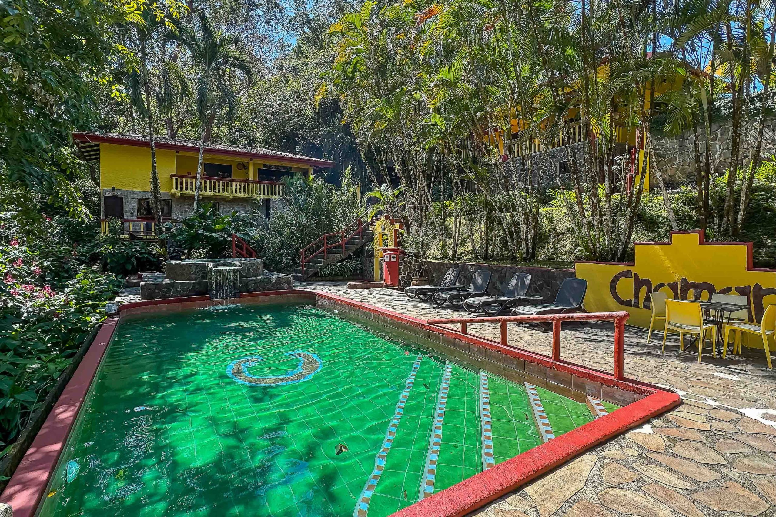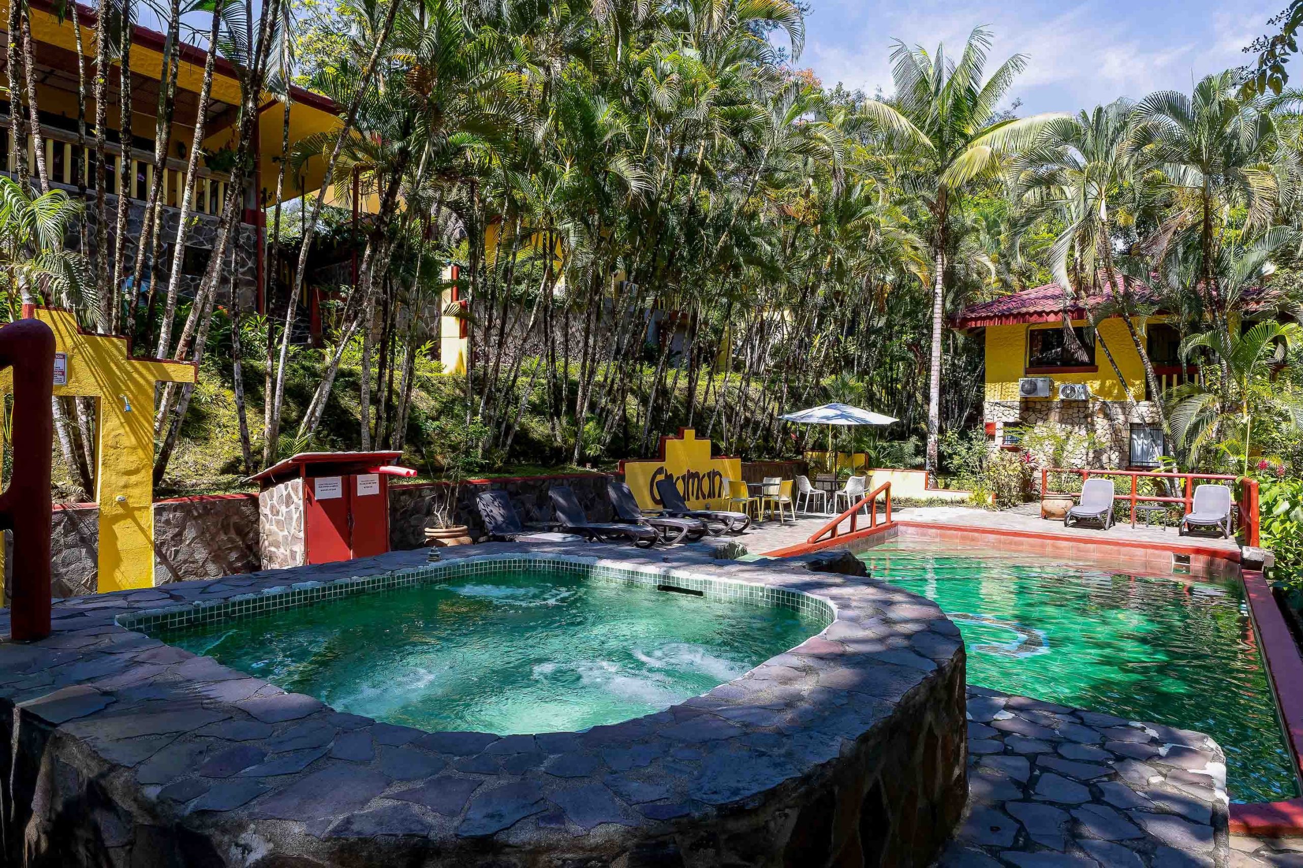 Residents and guests enjoy a large shared swimming pool and a social area designed for relaxation and gathering, all within a serene, jungle-surrounded setting.