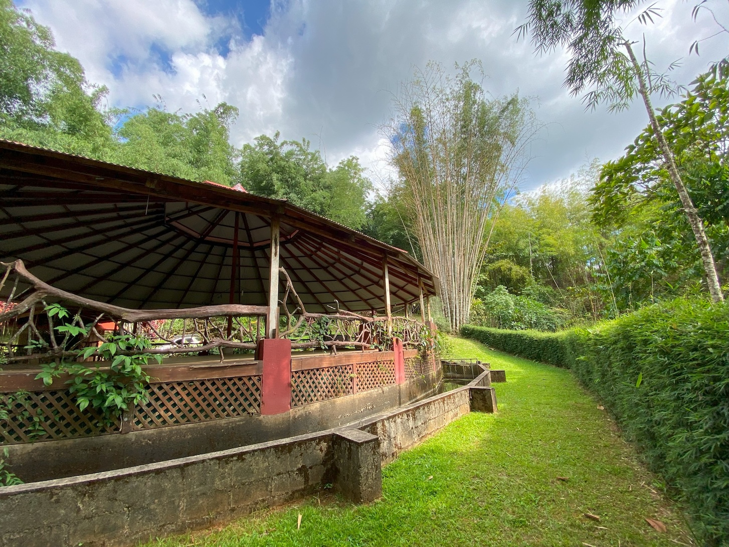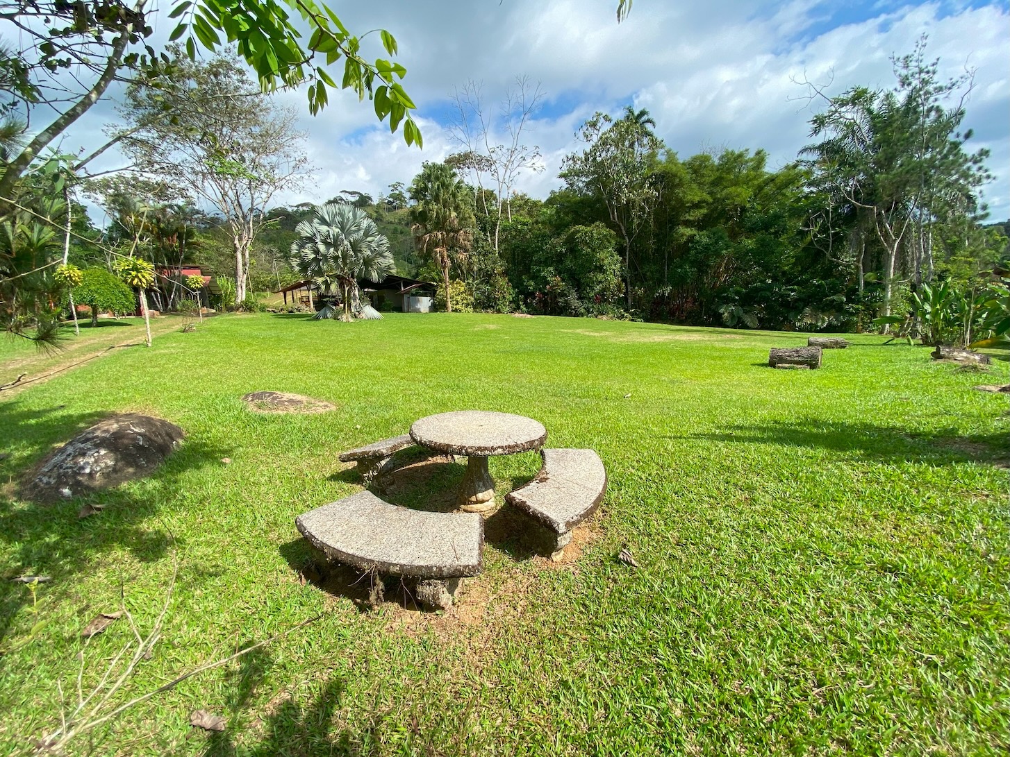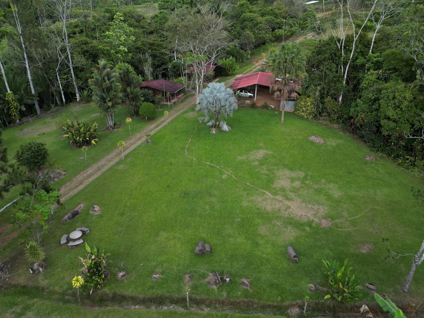 At the heart of the property stands an impressive circular rancho, 15 meters high and 22 meters in diameter, built with metal and concrete structure. It is surrounded by a peaceful artificial pond and a majestic bamboo forest located just meters from the river. This structure—an investment of approximately $175,000—is accompanied by two small cabins, perfect for the property caretaker or as temporary housing while a larger project is developed.