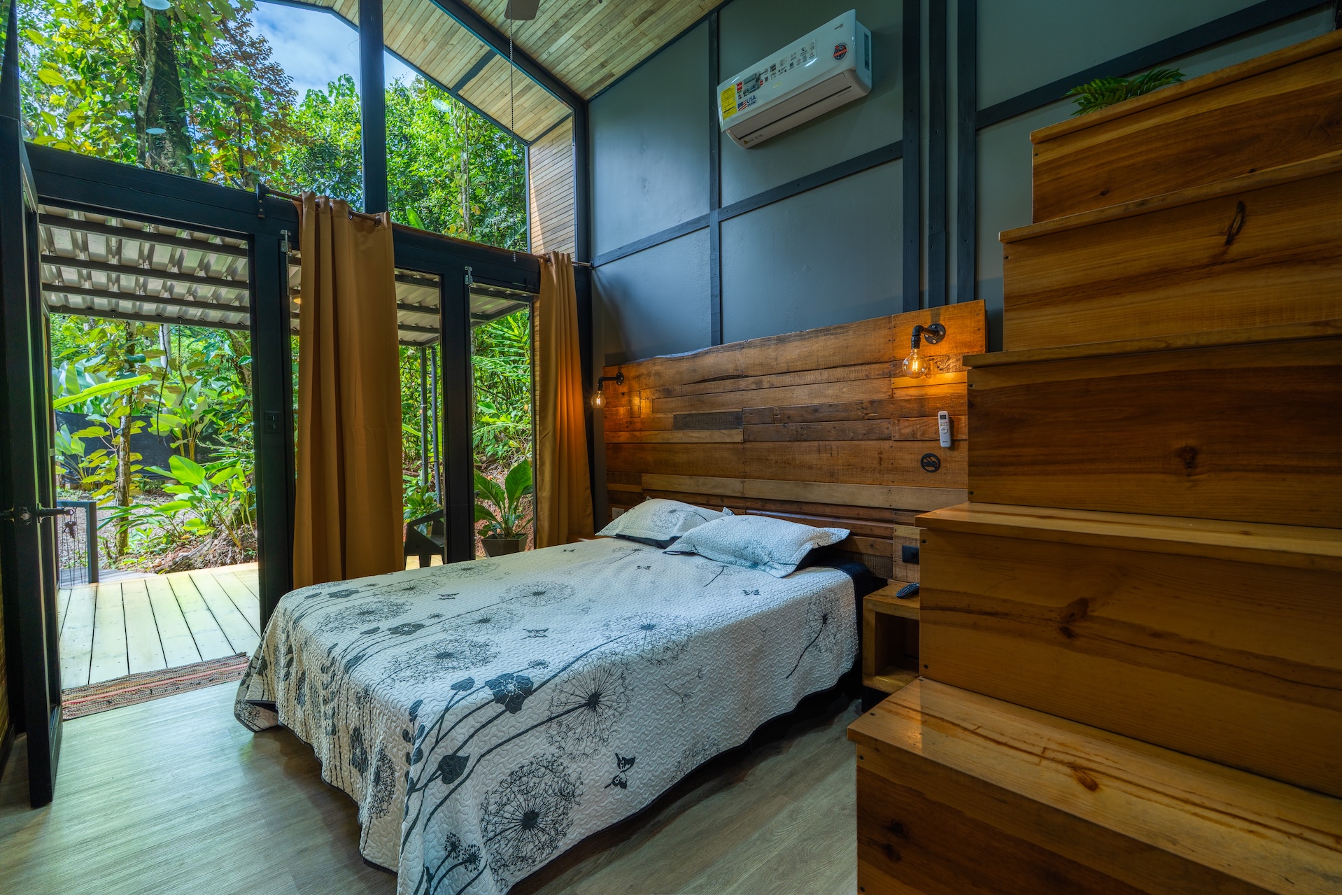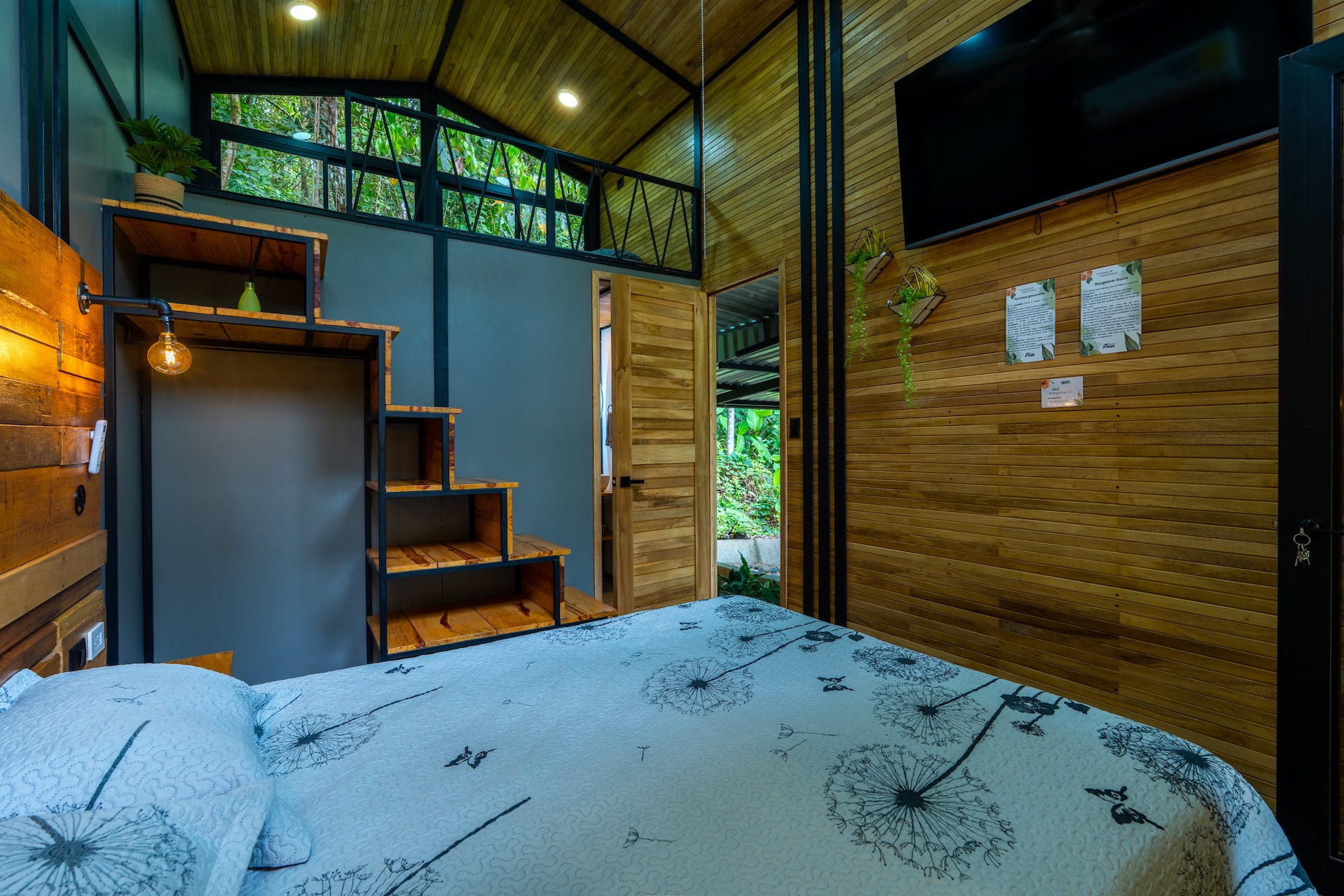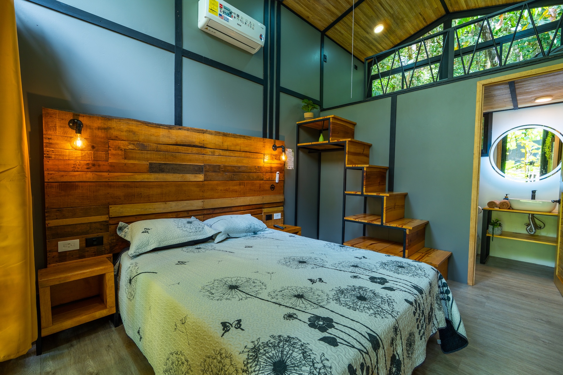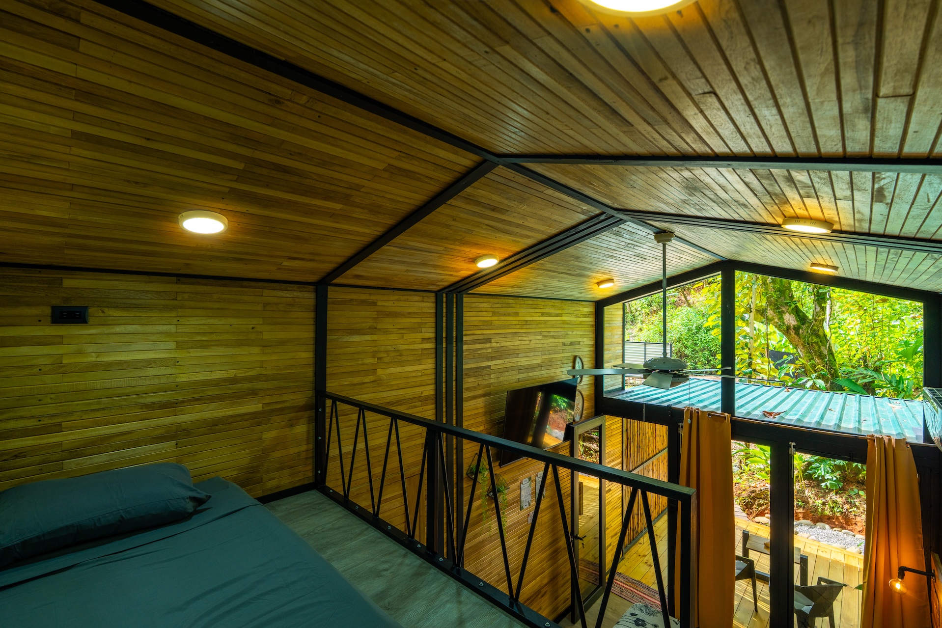 Cada bungalow es una villa independiente de diseño cuidadosamente pensado, que cuenta con un amplio dormitorio con cama king size, un entrepiso tipo loft de doble altura con cama individual, terraza privada, baño completo y finos detalles artesanales en madera. Estas unidades boutique brindan a los huéspedes una experiencia de retiro excepcional, ideal para quienes buscan privacidad, confort y una conexión auténtica con la naturaleza que las rodea.