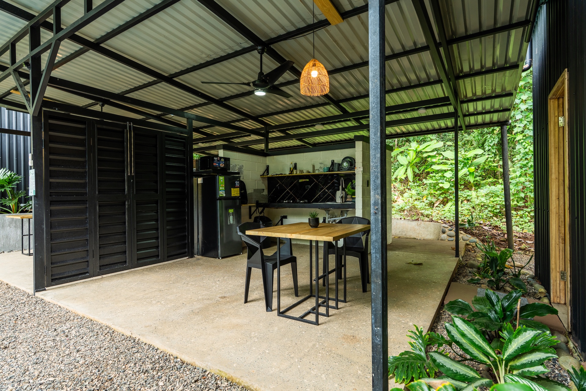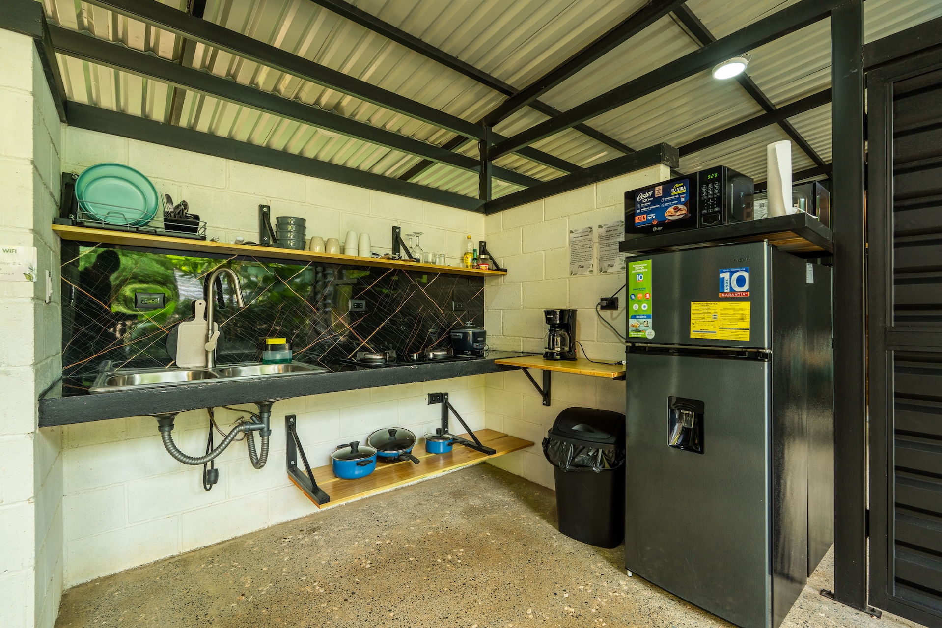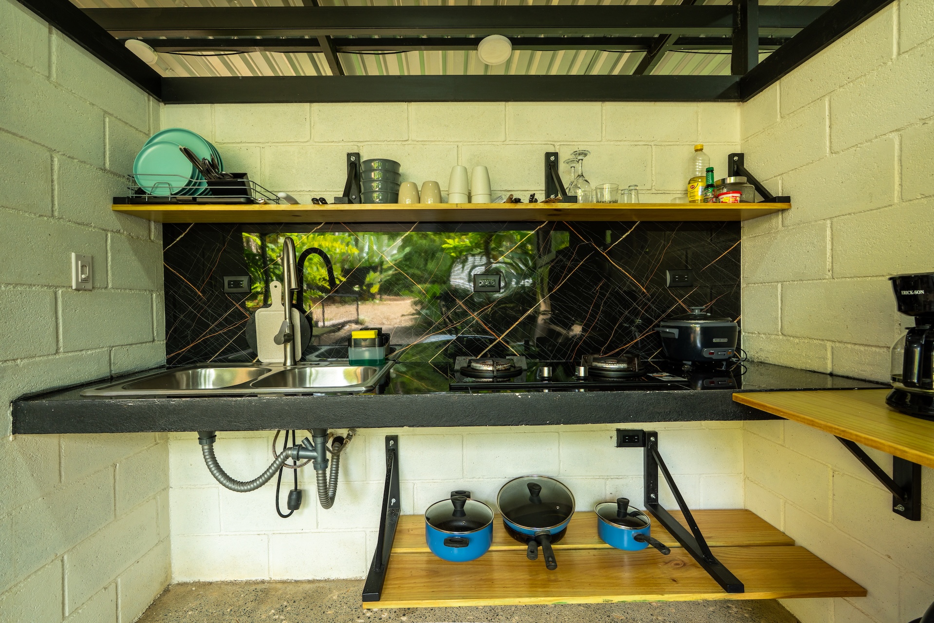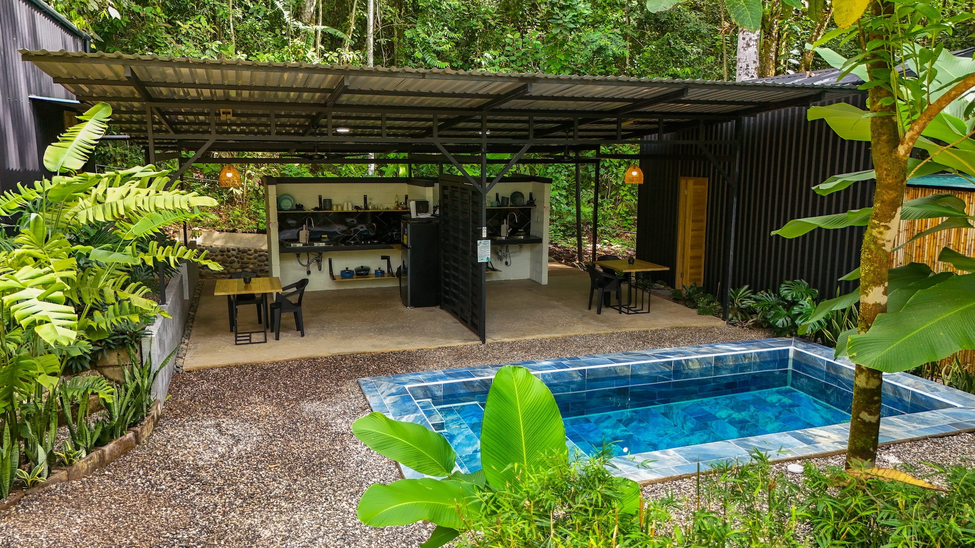 El área social principal de la propiedad es una cocina exterior completamente equipada, rodeada de exuberante vegetación madura, perfecta para disfrutar del estilo de vida tropical. A pocos pasos, la piscina al aire libre recibe abundante luz natural y se integra de forma armónica con la arquitectura del conjunto, creando un espacio ideal para el descanso y la relajación en un entorno natural.