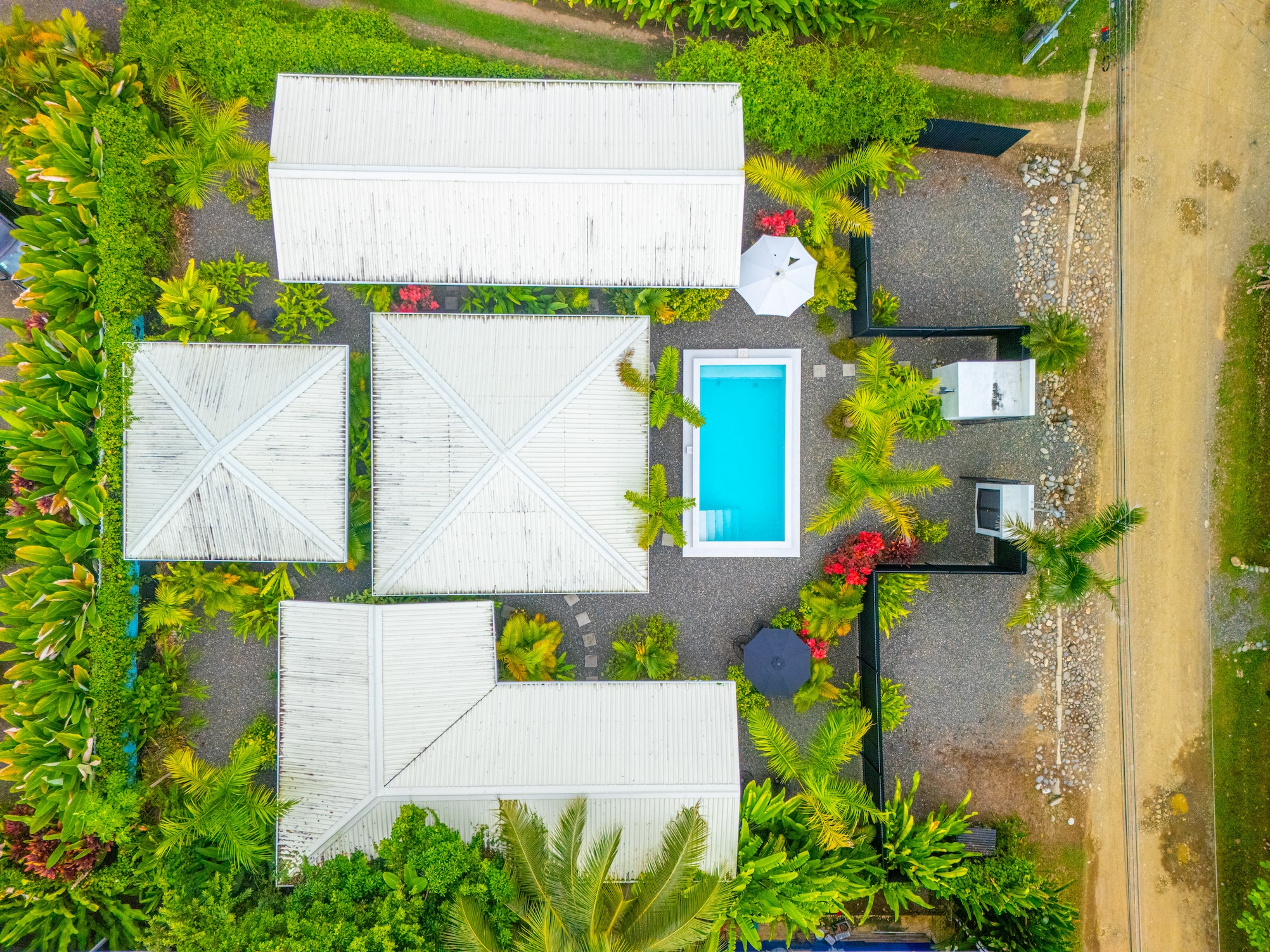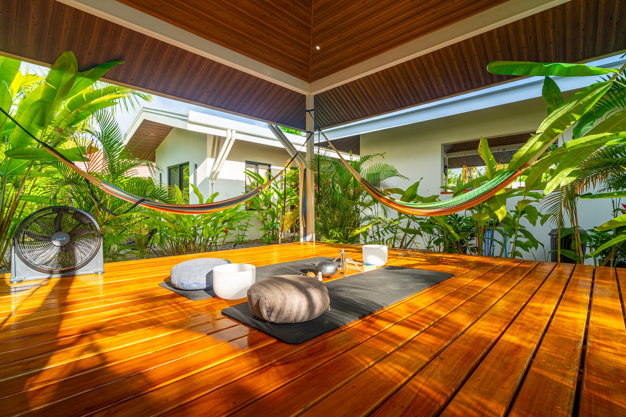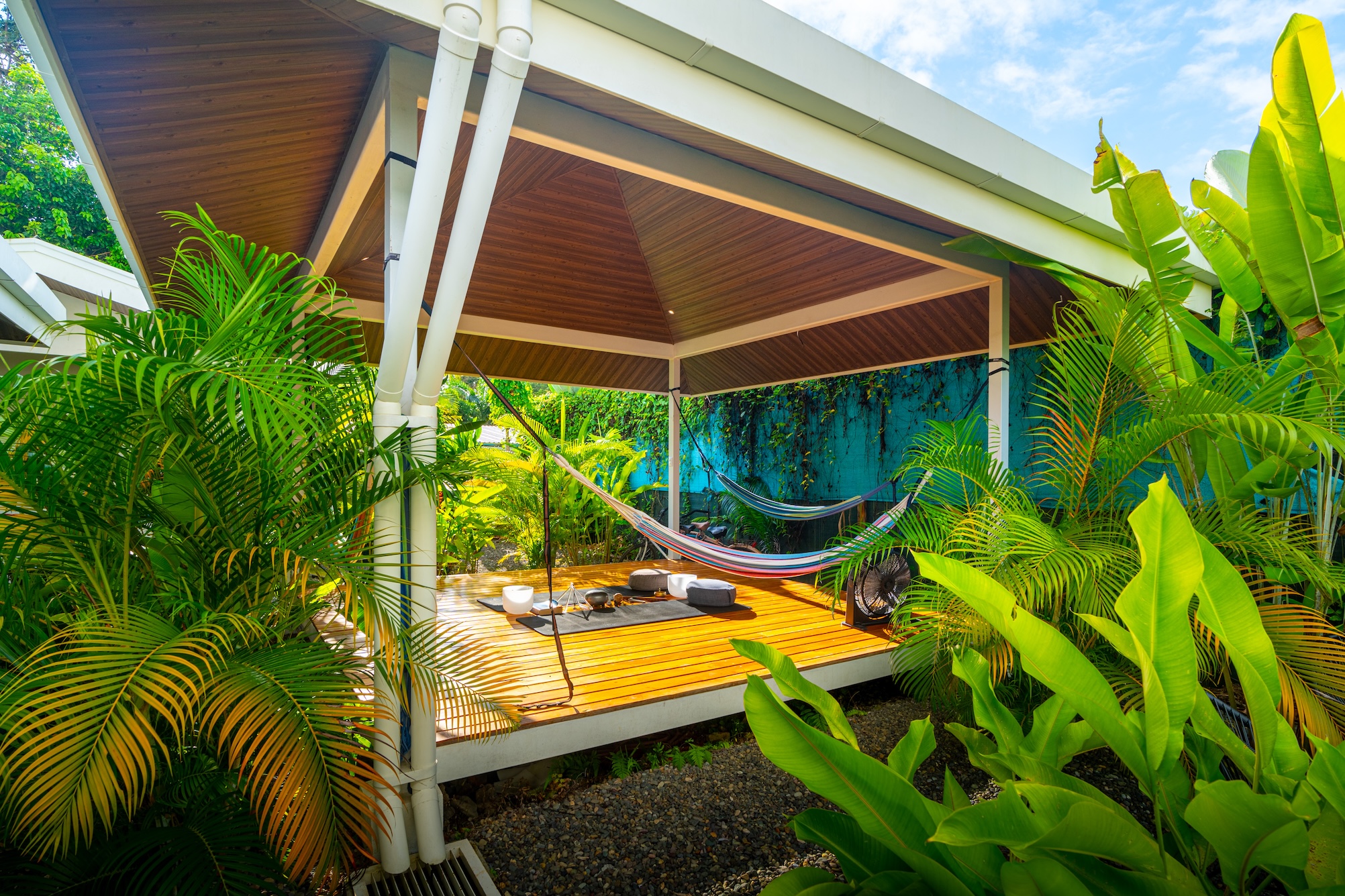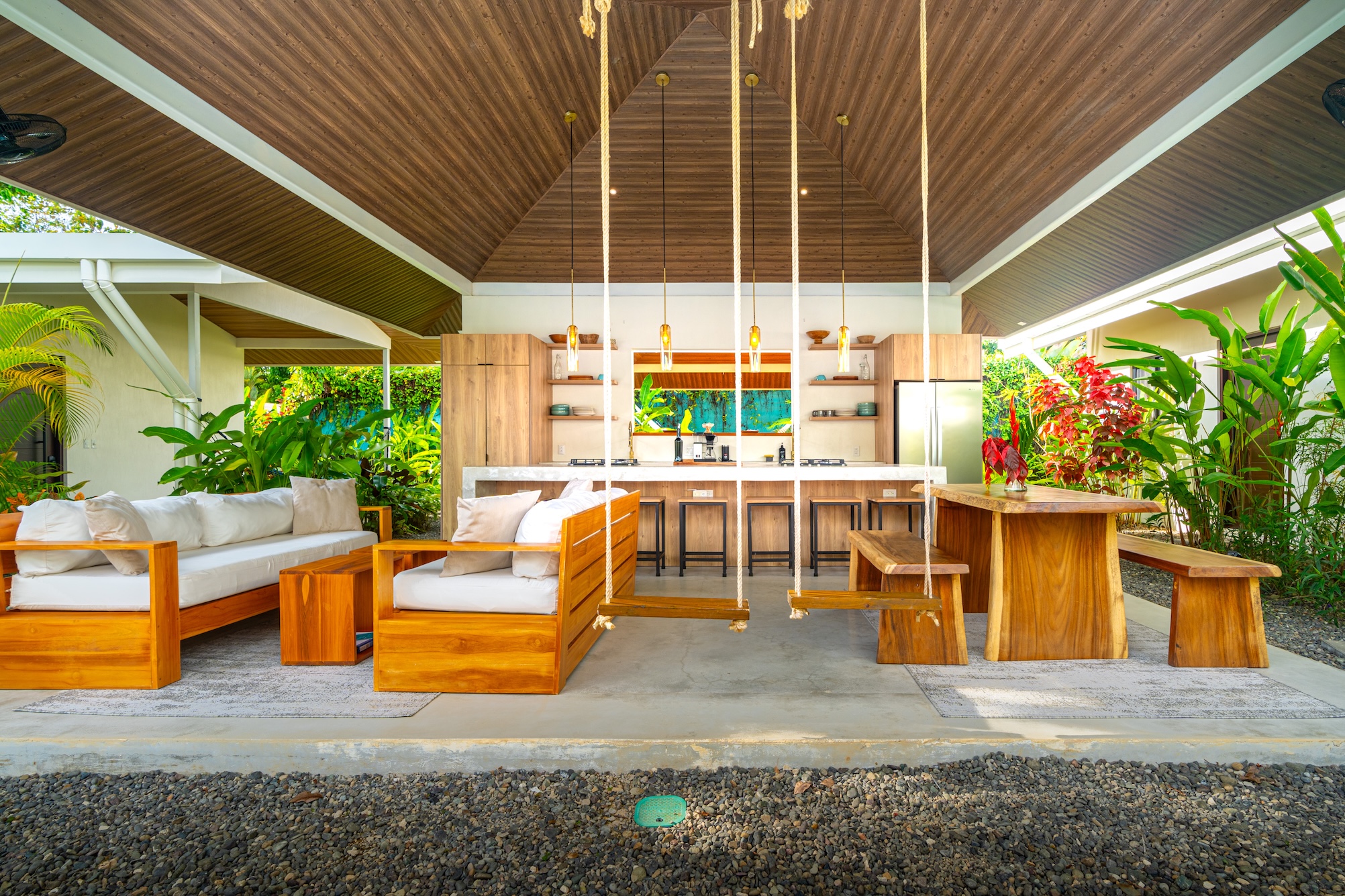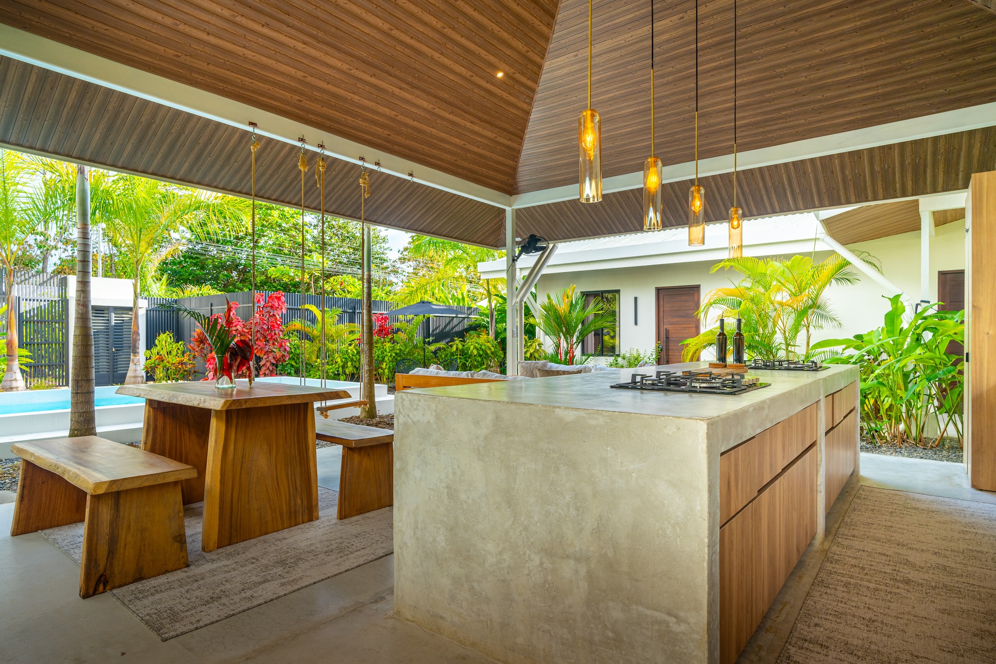 La distribución del proyecto ha sido concebida para fomentar la convivencia al aire libre, organizando cuatro suites privadas alrededor de áreas comunes que incluyen una cocina compartida, sala de estar, piscina y una terraza especialmente diseñada para yoga y meditación. Este diseño convierte a la propiedad en una opción ideal para alquileres de corta estancia, un hostal boutique o un retiro de tamaño reducido, ofreciendo al mismo tiempo privacidad y confort a cada huésped.