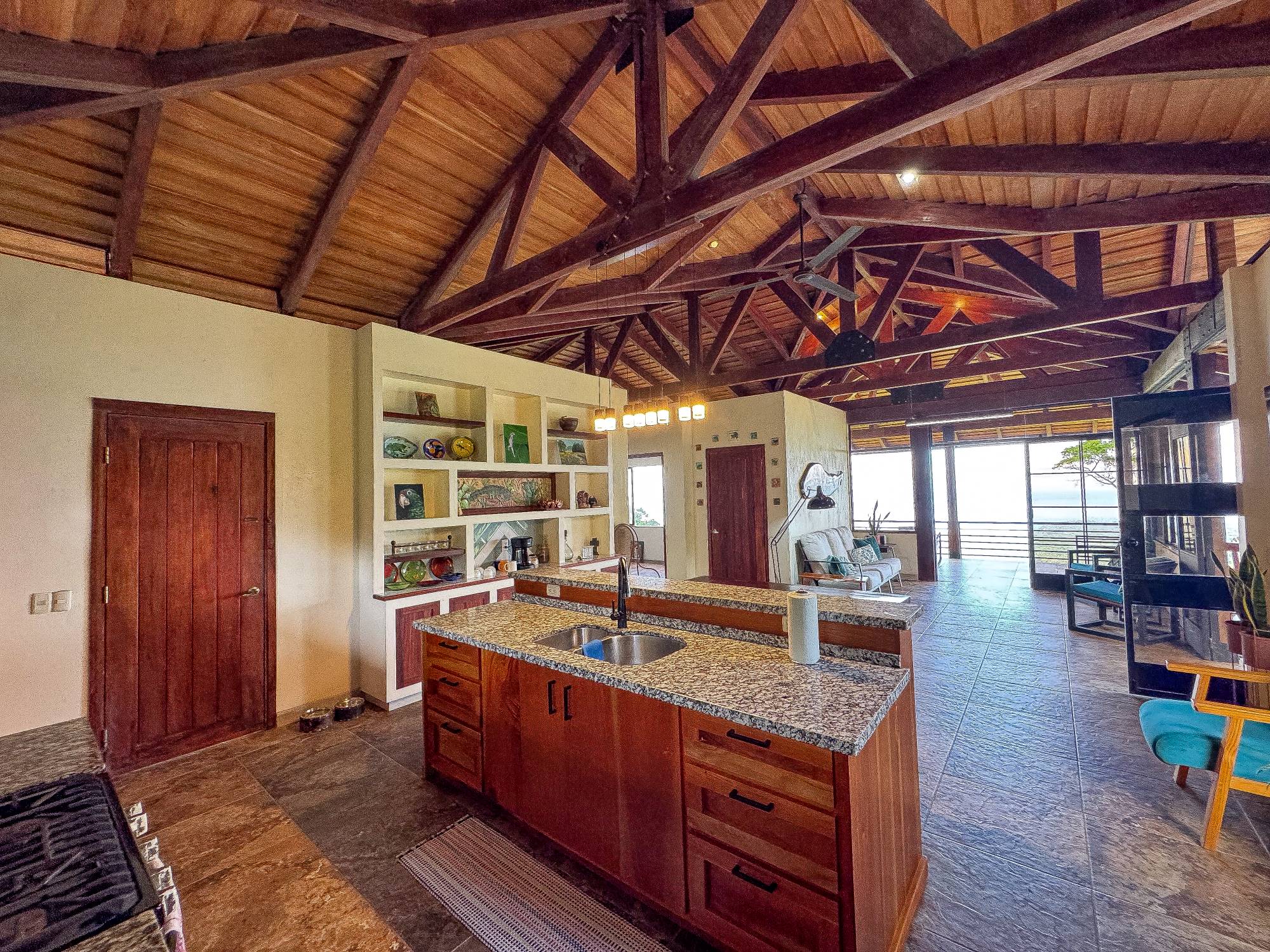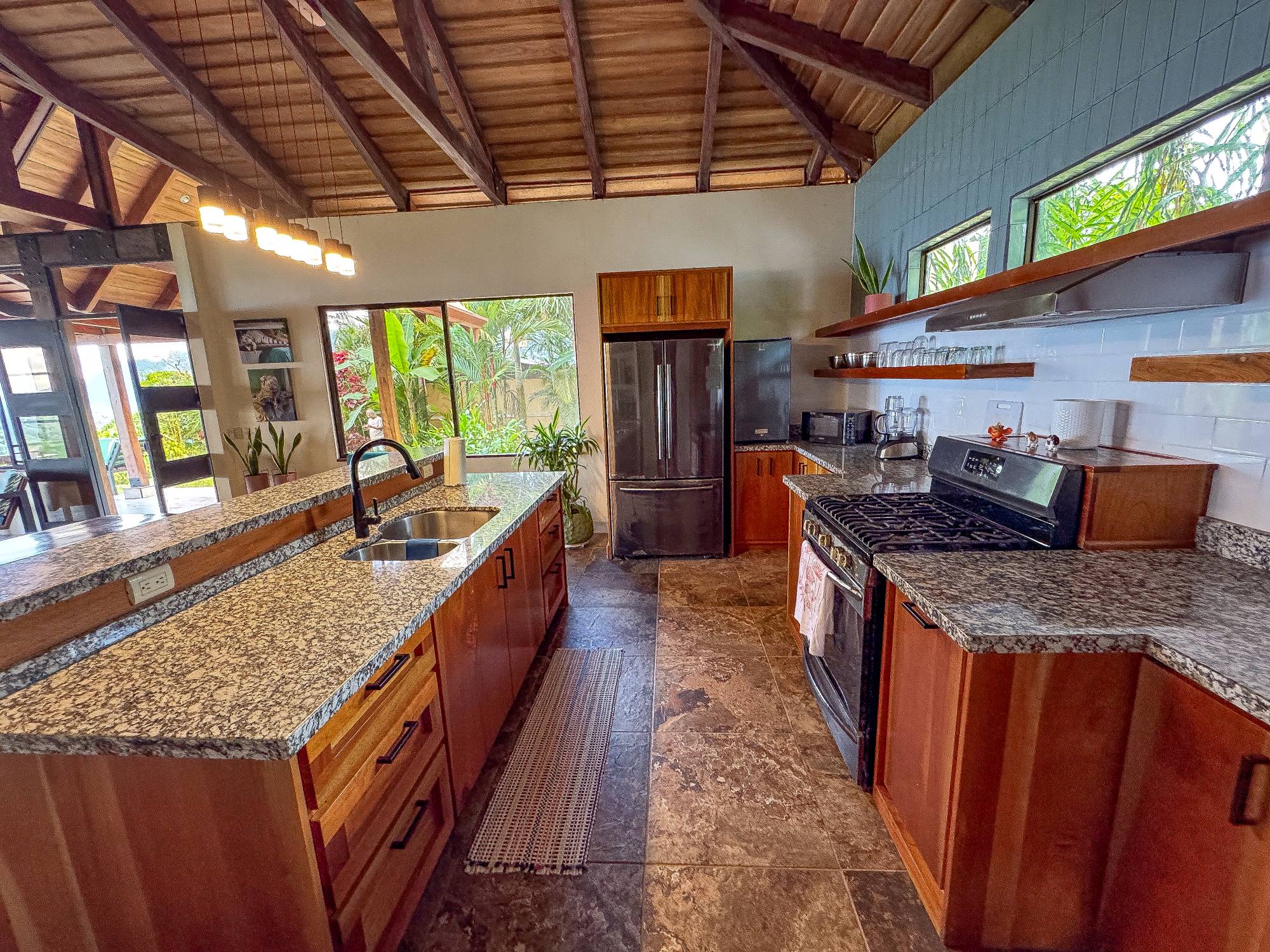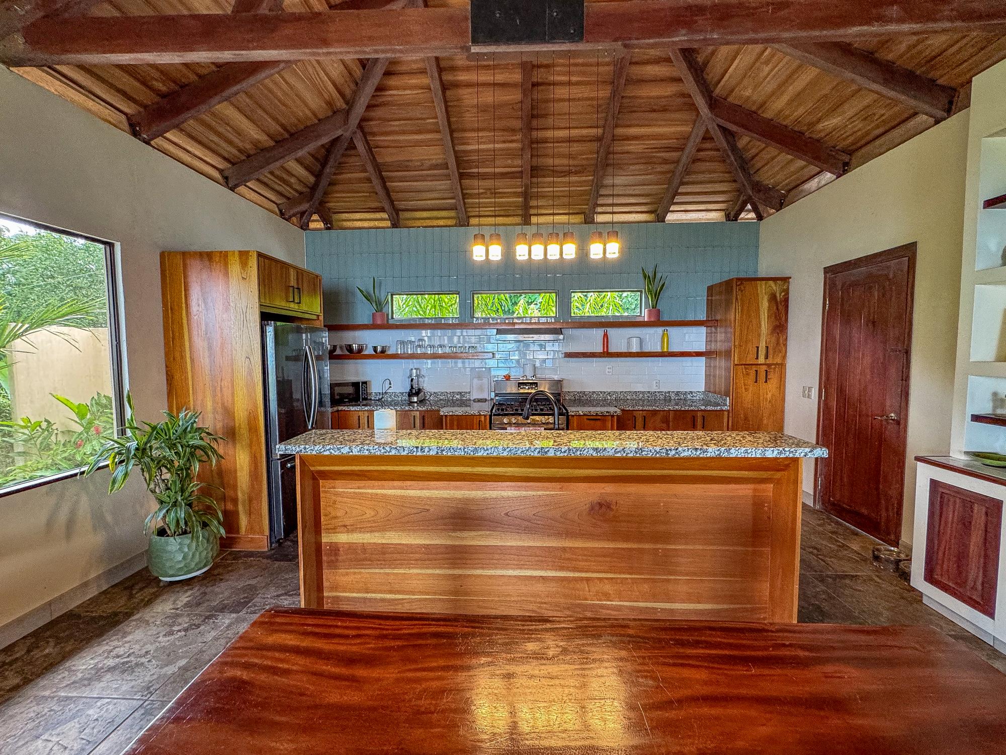 El corazón de la casa es una cocina gourmet equipada con una gran isla central, amplios gabinetes de cedro y espacio de almacenamiento. Se integra perfectamente con la sala, el comedor y una amplia terraza cubierta con vistas al mar y a la selva.