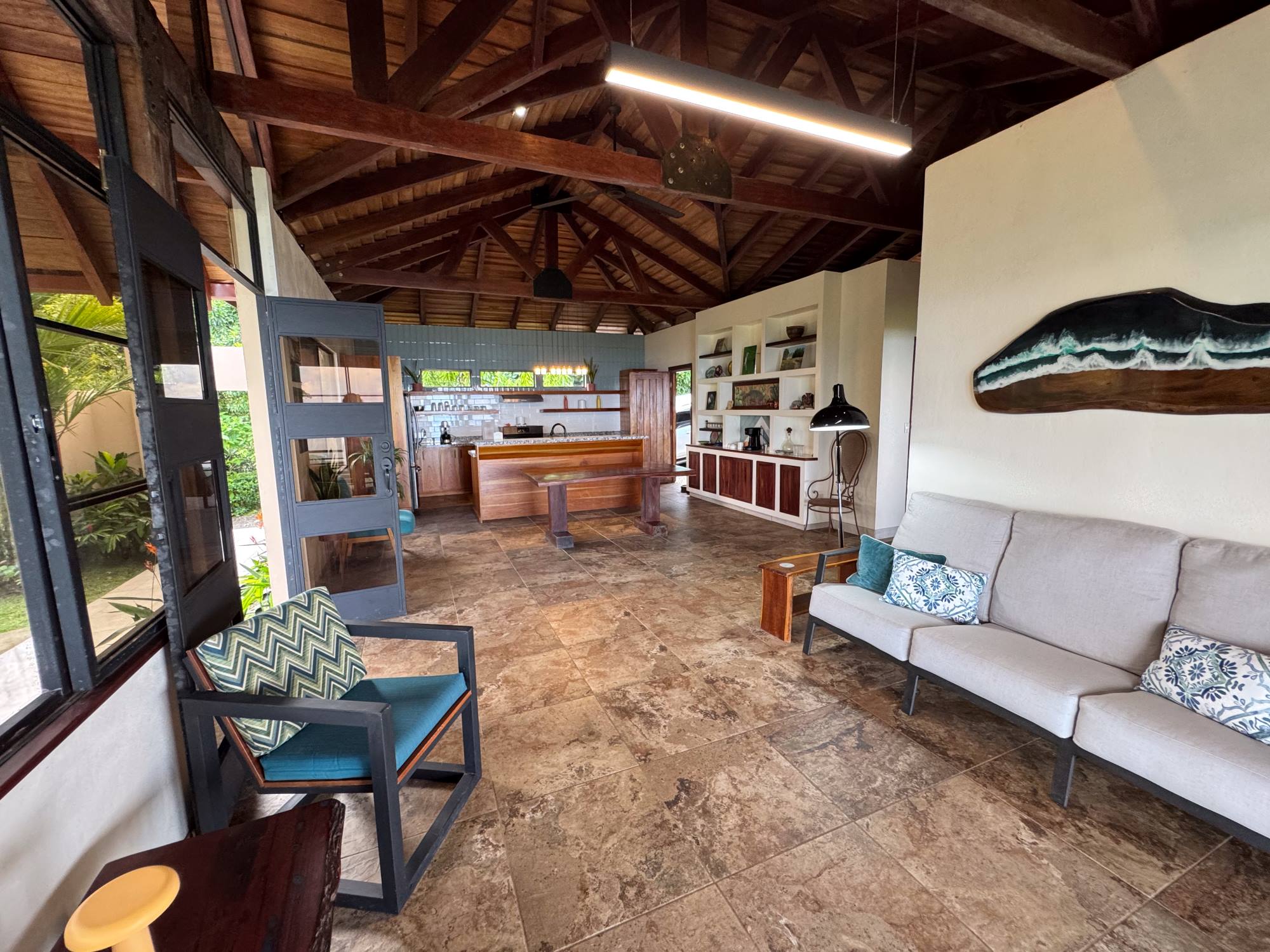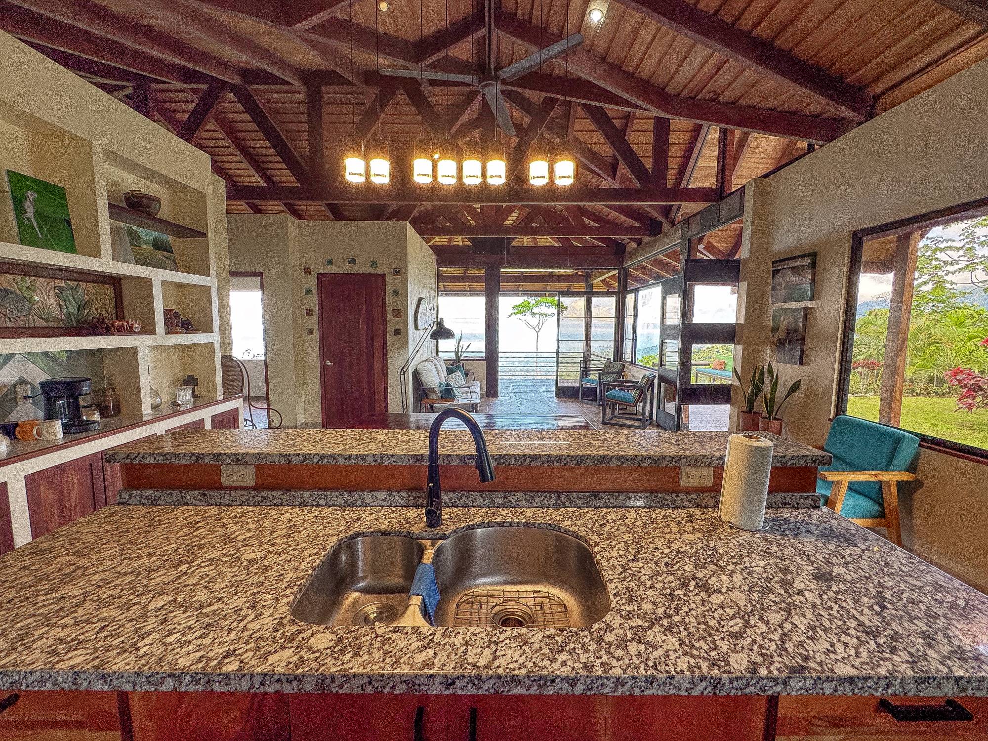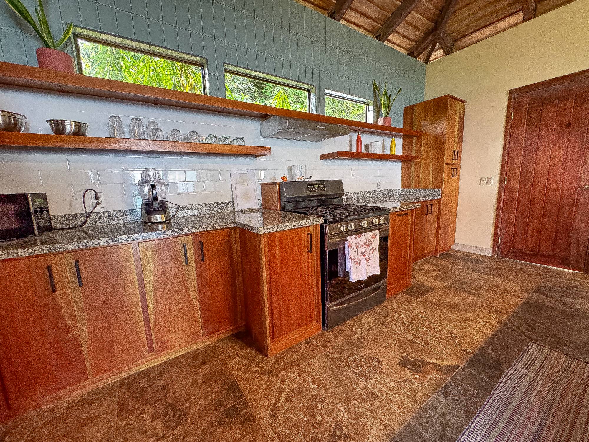 El corazón de la casa es una cocina gourmet equipada con una gran isla central, amplios gabinetes de cedro y espacio de almacenamiento. Se integra perfectamente con la sala, el comedor y una amplia terraza cubierta con vistas al mar y a la selva.