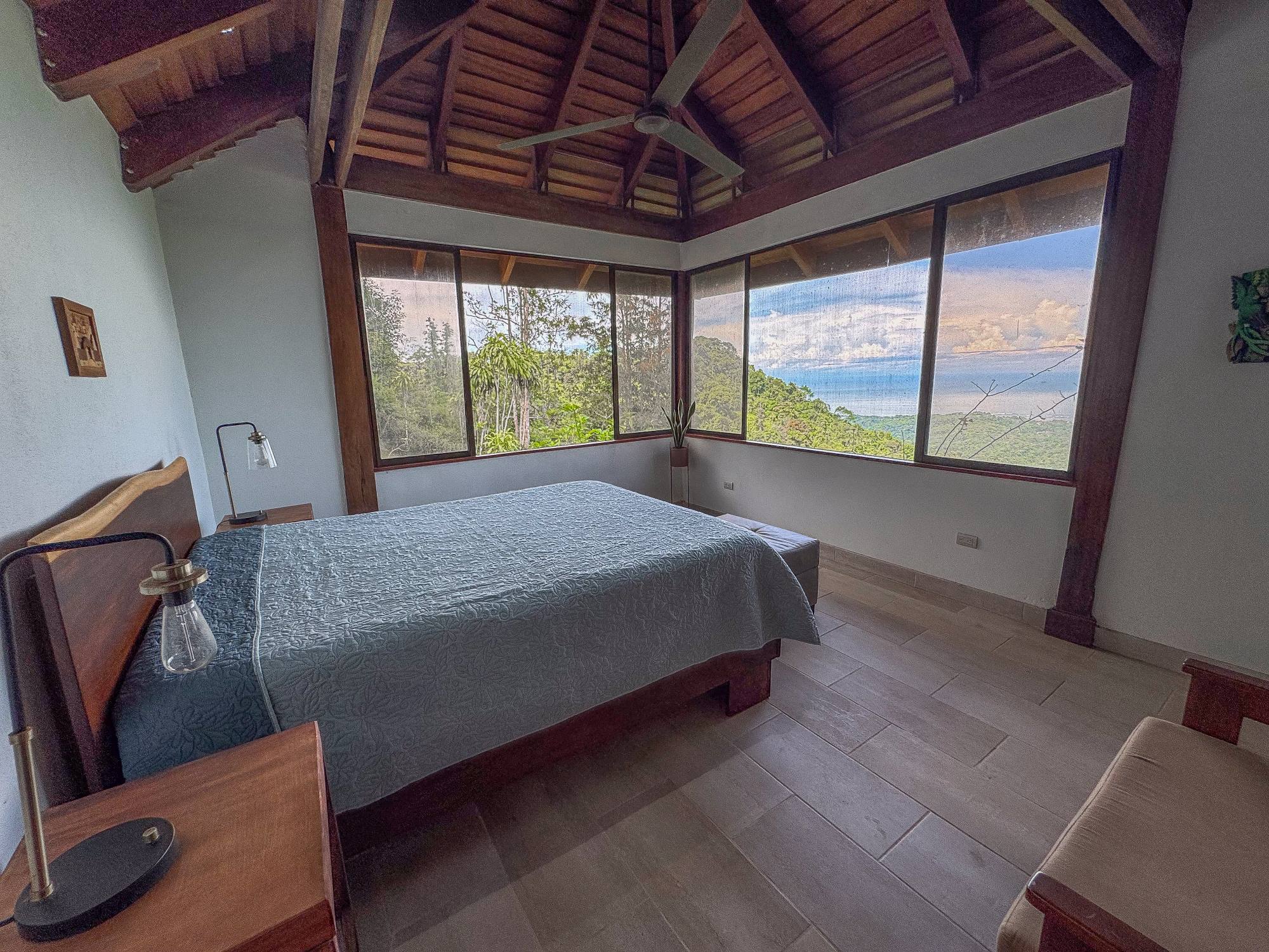 The heart of the home is a gourmet kitchen equipped with a large center island, ample cedar cabinetry, and storage space. It integrates seamlessly with the living room, dining room, and a spacious covered terrace with ocean and jungle views. Both bedrooms—the master with an en suite bathroom, and the second currently serving as an art studio—boast stunning views. The home also includes a second full bathroom, a laundry room, and ample storage areas.