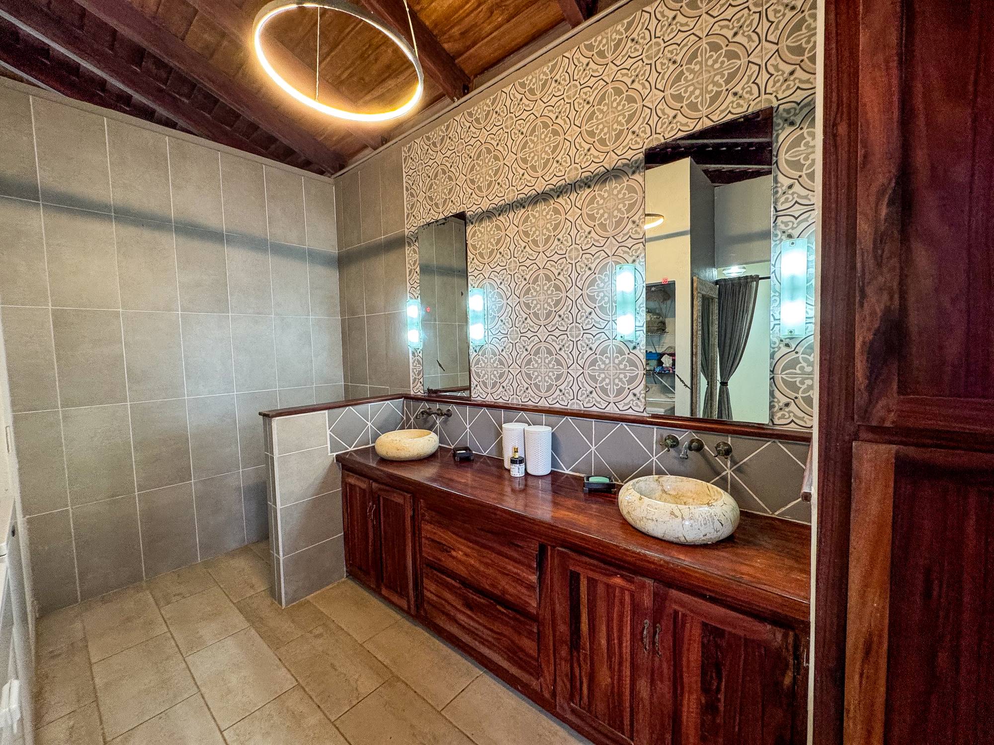 La residencia principal combina diseño natural, materiales nobles y una estructura abierta que permite que la brisa marina y de montaña refresque cada rincón. El techo de madera de cedro, visible desde el interior, crea una sensación de amplitud y calidez, mientras que la continuidad de los suelos de baldosa entre el interior y exterior ofrece una transición armoniosa.