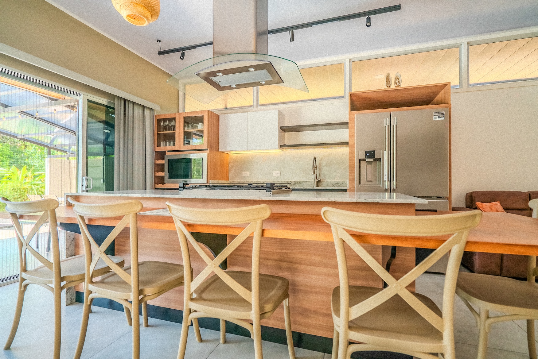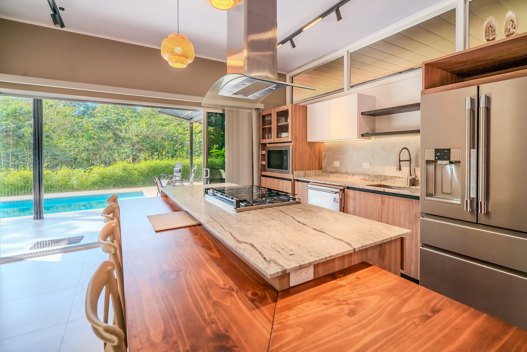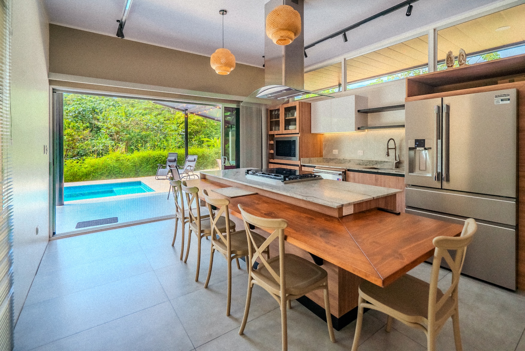 Cocina completamente equipada, con electrodomésticos de acero inoxidable, encimeras de granito y acceso directo al patio y piscina a través de puertas corredizas de vidrio
