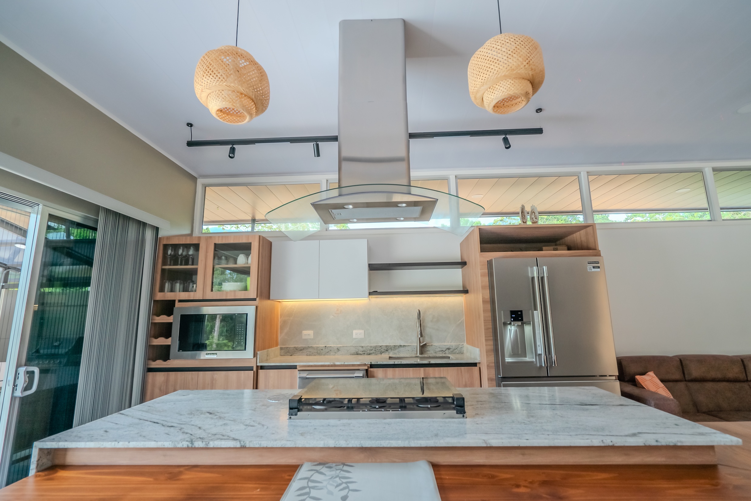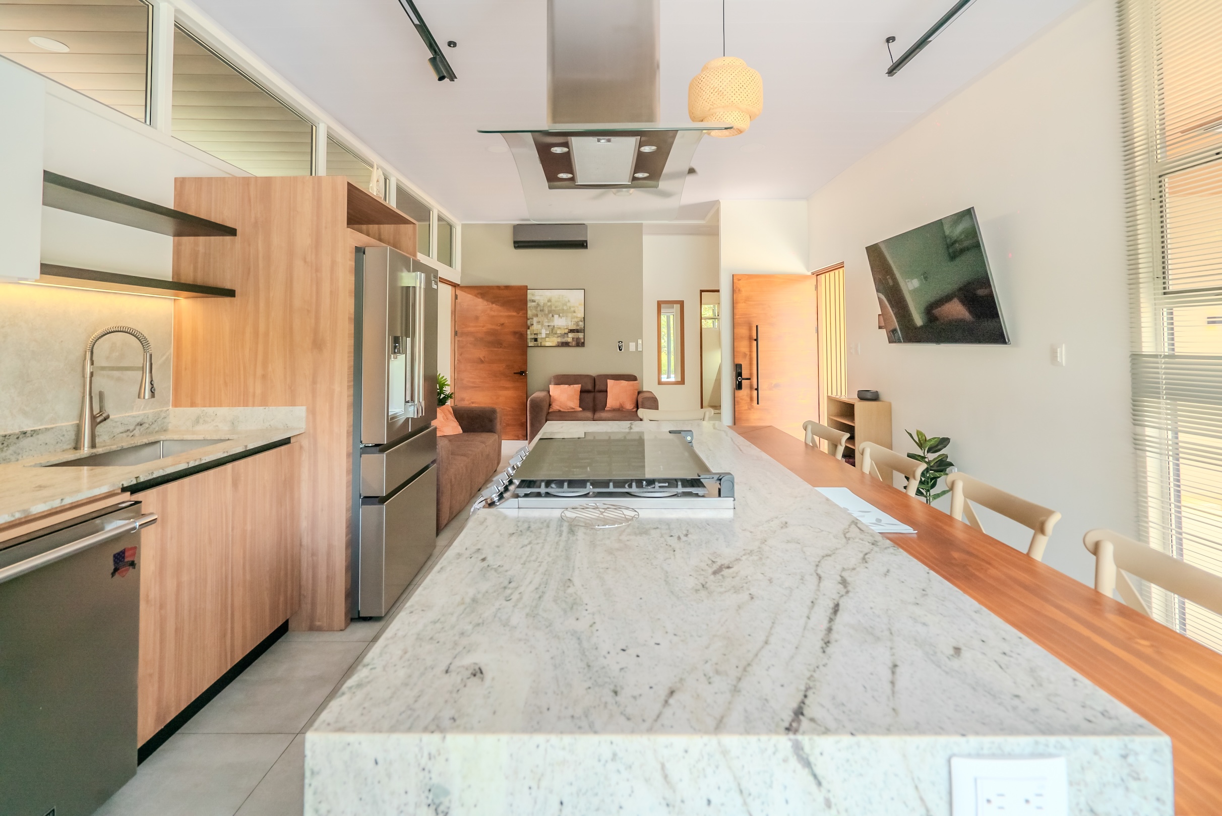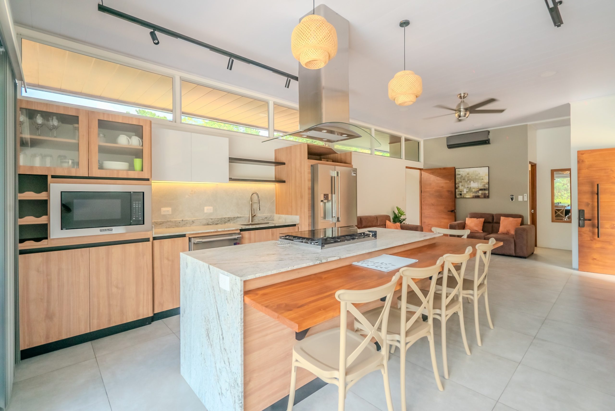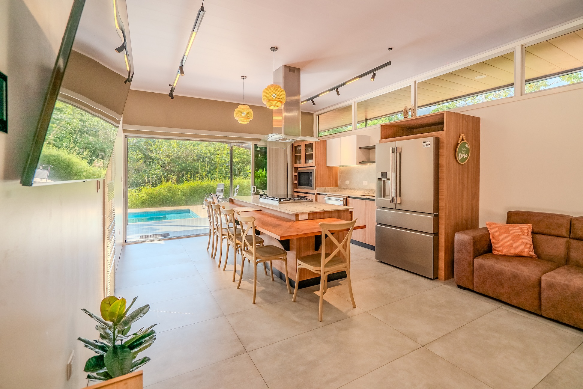 Cocina completamente equipada, con electrodomésticos de acero inoxidable, encimeras de granito y acceso directo al patio y piscina a través de puertas corredizas de vidrio