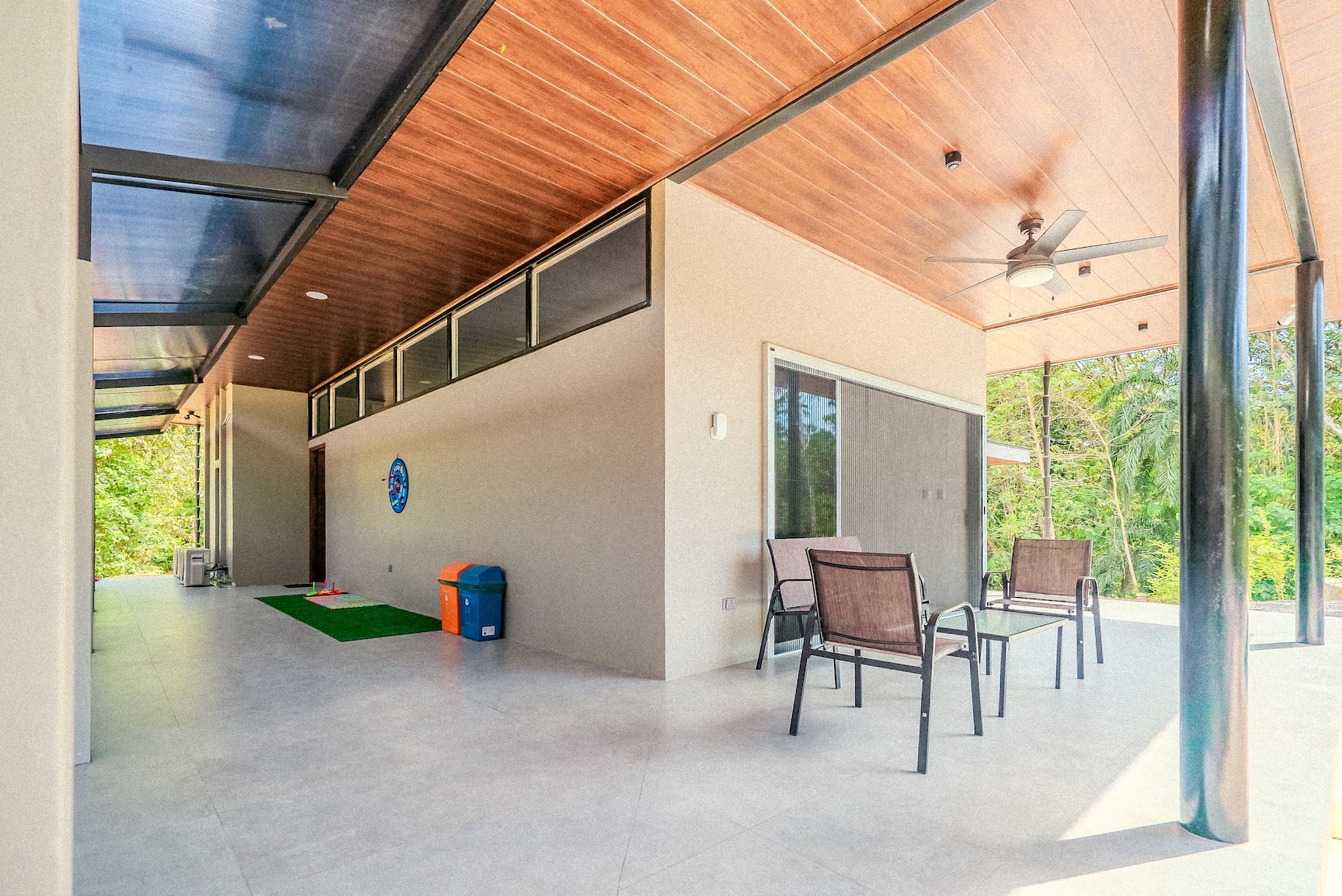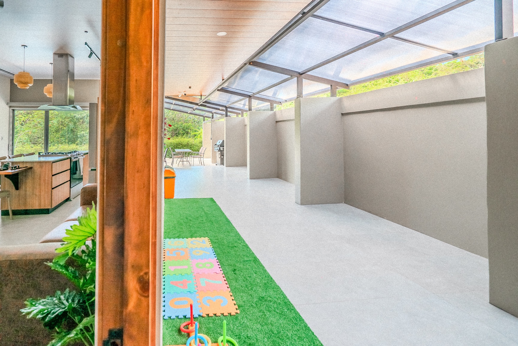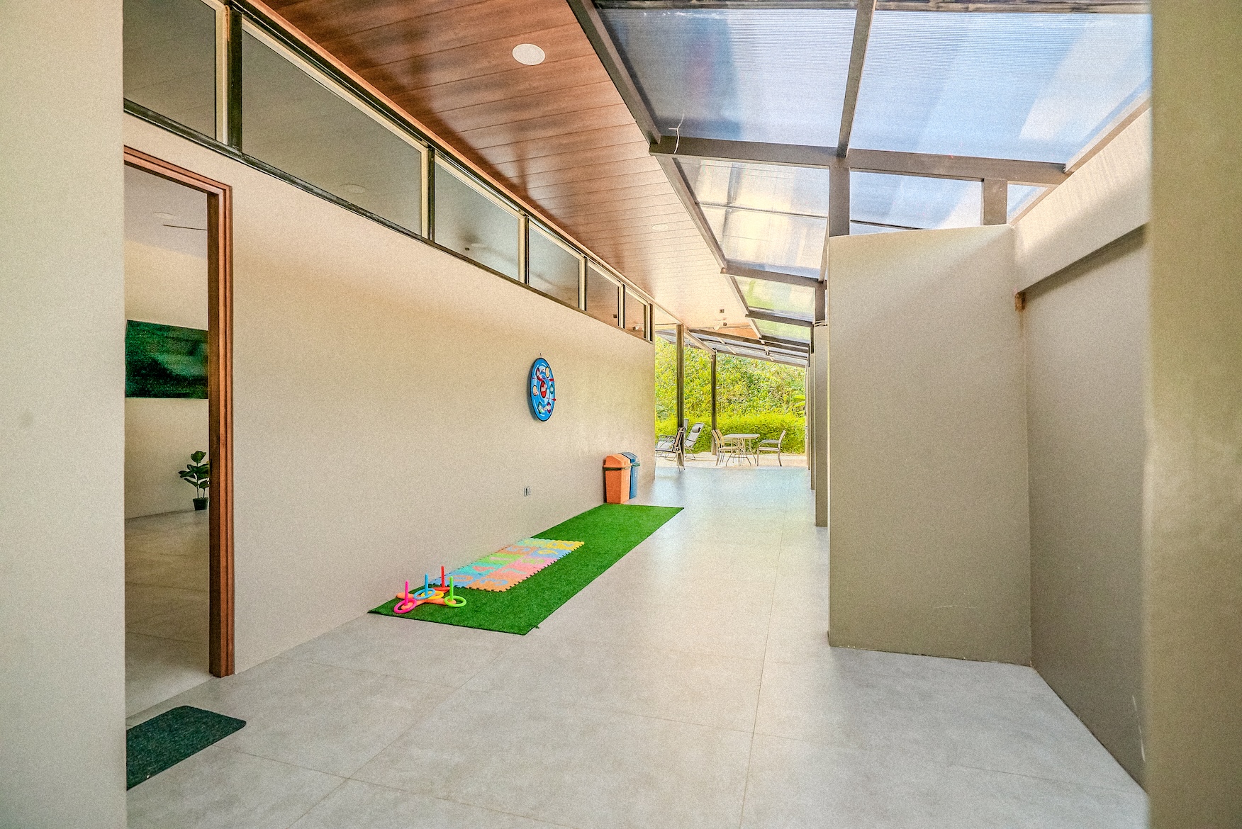 Patio trasero techado que funciona como pasillo, área de juegos o zona flexible