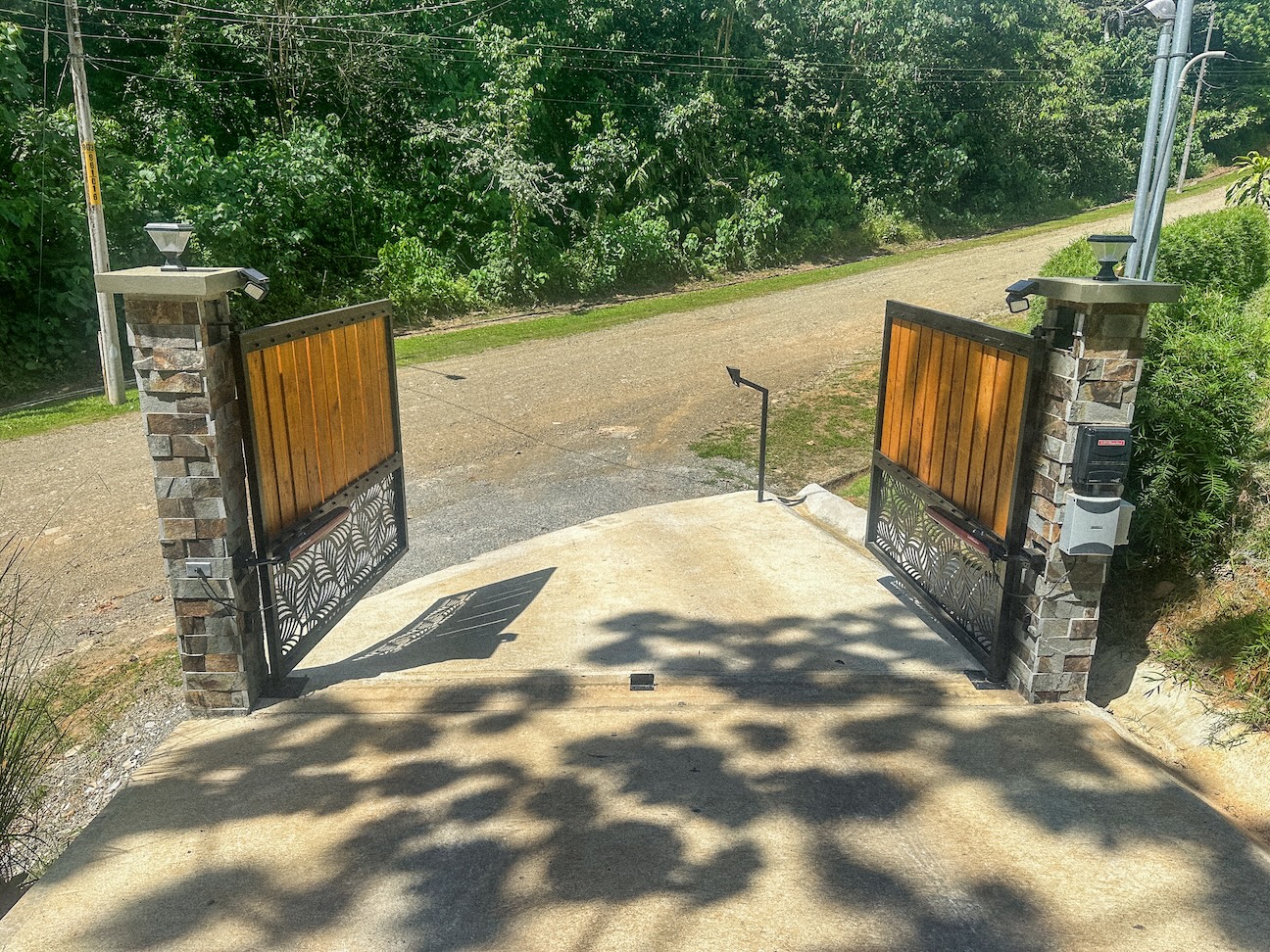 La propiedad se accede mediante un camino bien preparado que comienza en la Costanera y atraviesa Ojochal hasta llegar a Fase 11. Un portón eléctrico de diseño atractivo da la bienvenida al final del acceso inclinado.