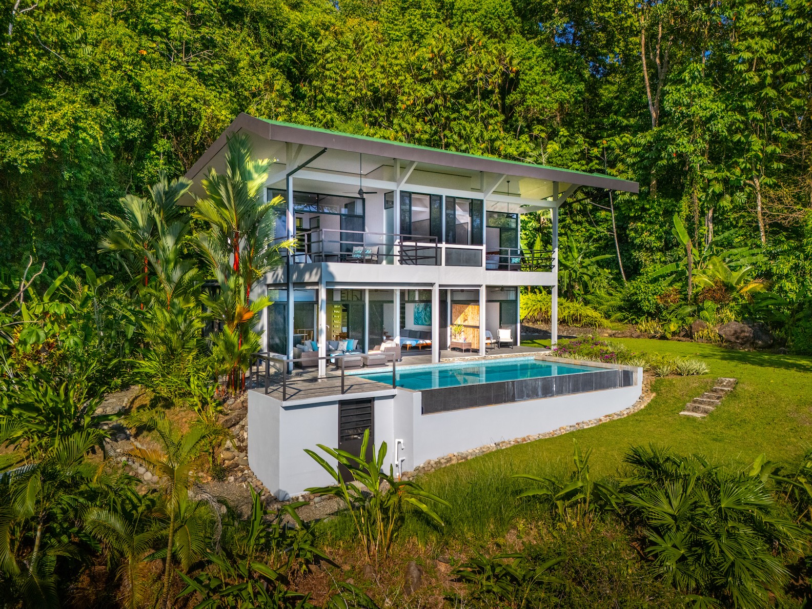 El área social se abre hacia una impresionante piscina infinita y una terraza cubierta, ideales para disfrutar de atardeceres espectaculares o compartir momentos inolvidables. Todo esto rodeado de aproximadamente media hectárea de exuberante vegetación, que garantiza privacidad y atrae una rica variedad de fauna como monos, tucanes y guacamayas.