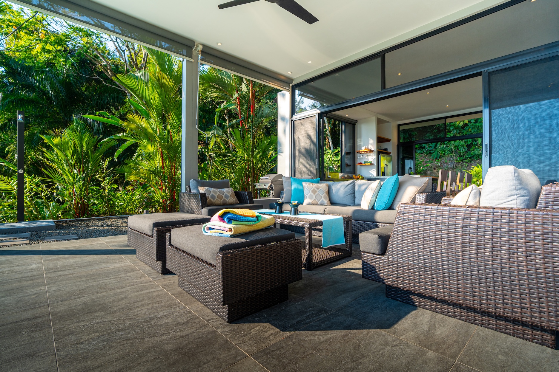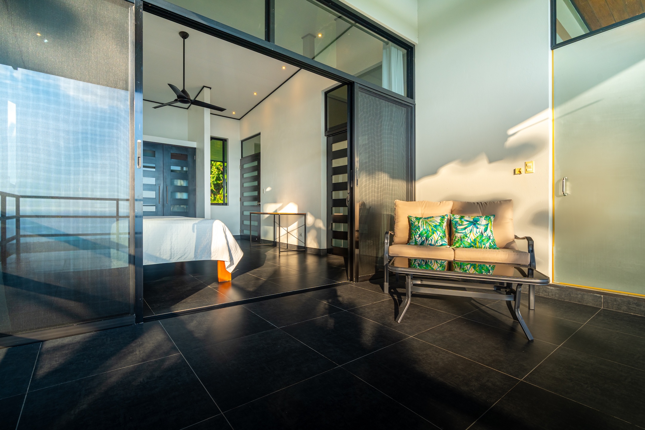 La propiedad, compuesta por tres amplias suites, ha sido diseñada para integrarse con su entorno natural. Sus grandes ventanales y puertas corredizas permiten que la luz y la brisa marina fluyan libremente, creando espacios frescos y abiertos donde el interior se conecta de forma natural con el exterior.