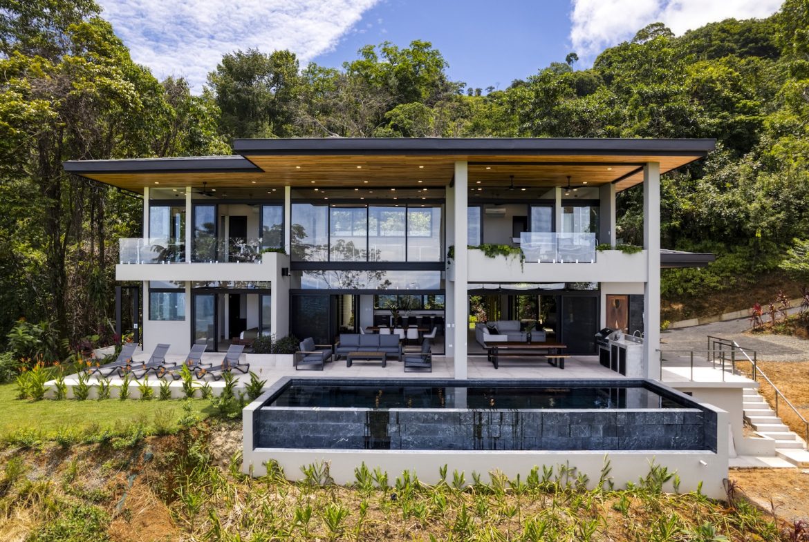 Nestled at the end of a private road among the lush green hills of Playa Dominical , this stunning modern four-bedroom residence offers a unique combination of handcrafted design, natural beauty, and total serenity .