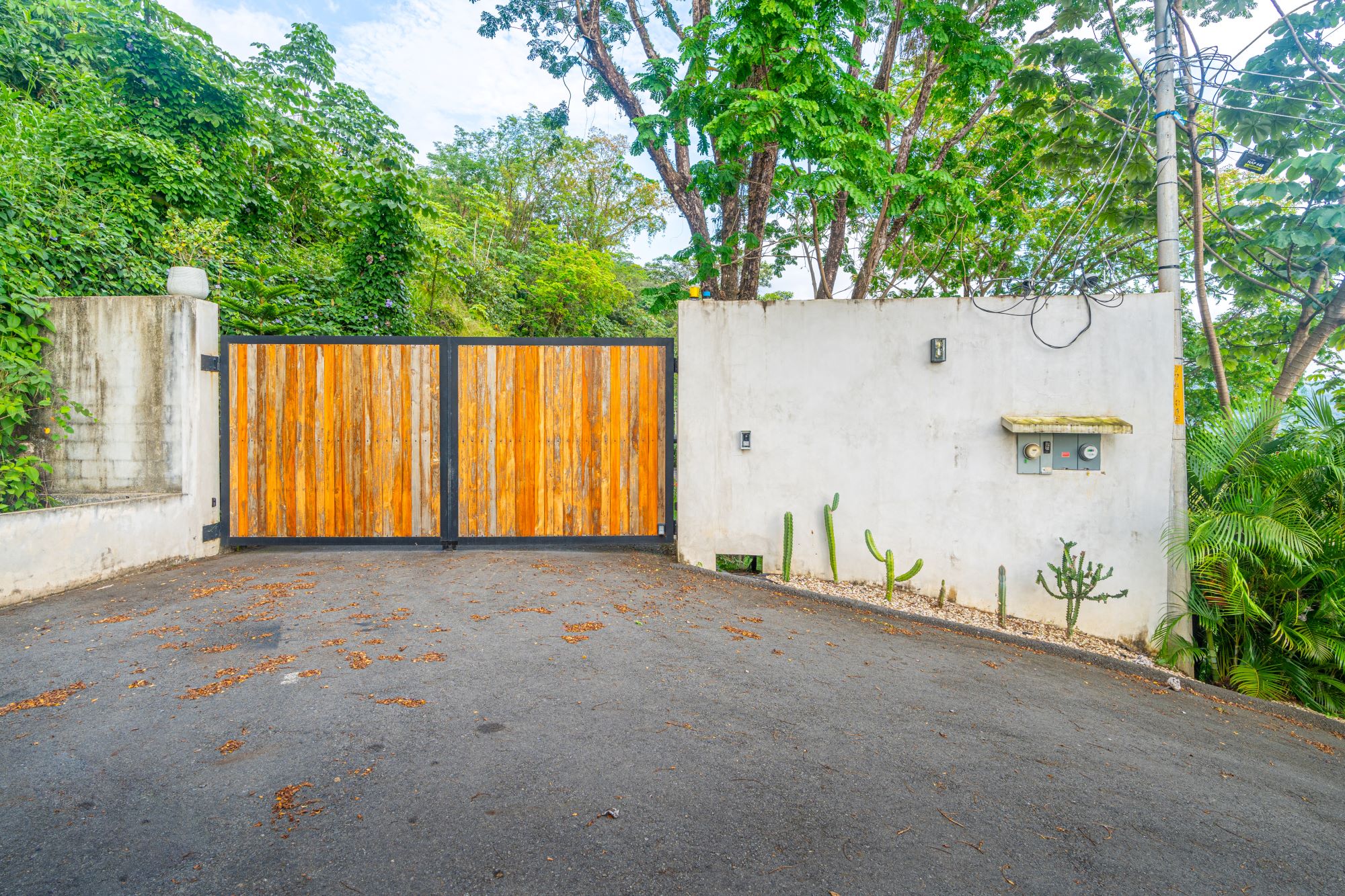 Entrada principal cerrada con cámaras de seguridad, intercomunicador y portón eléctrico.