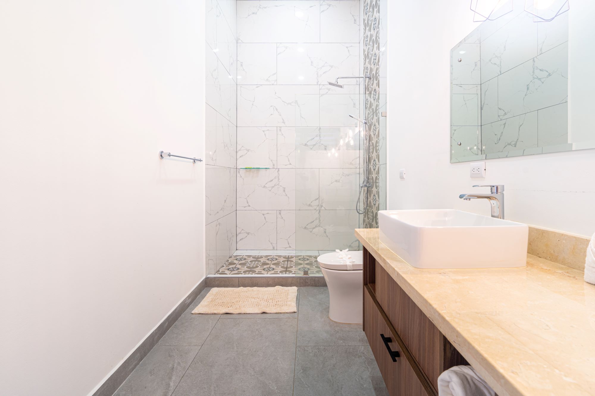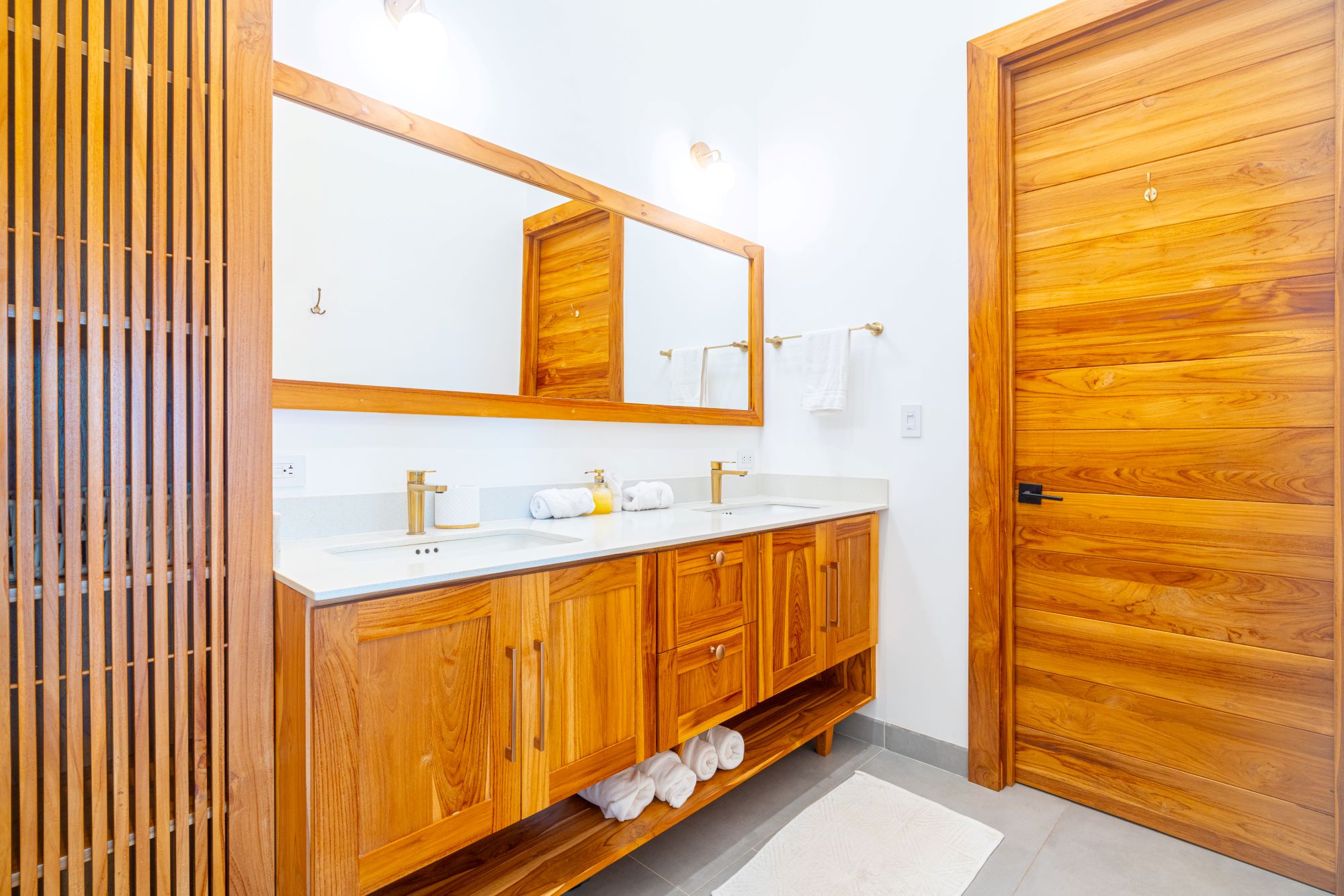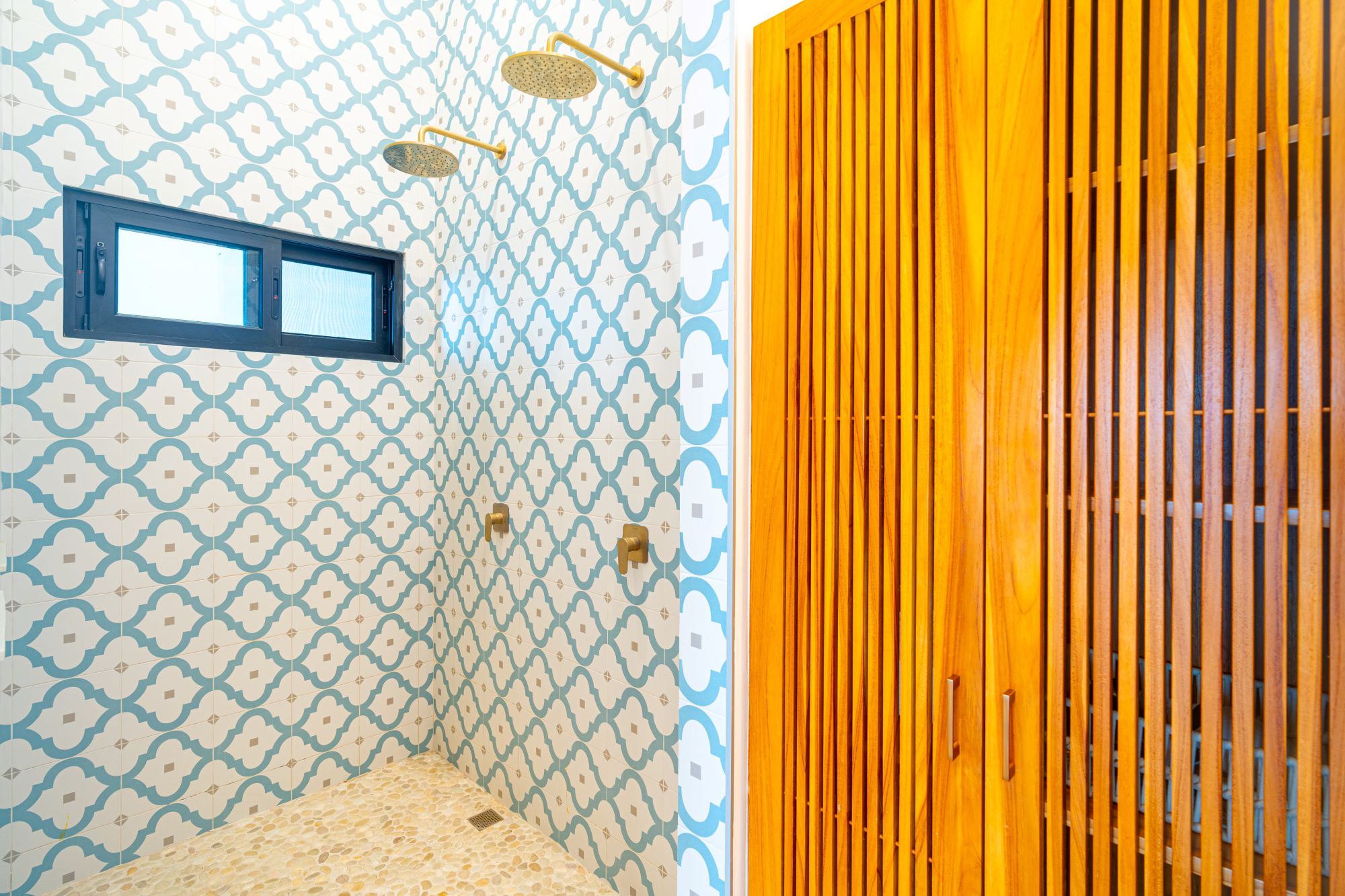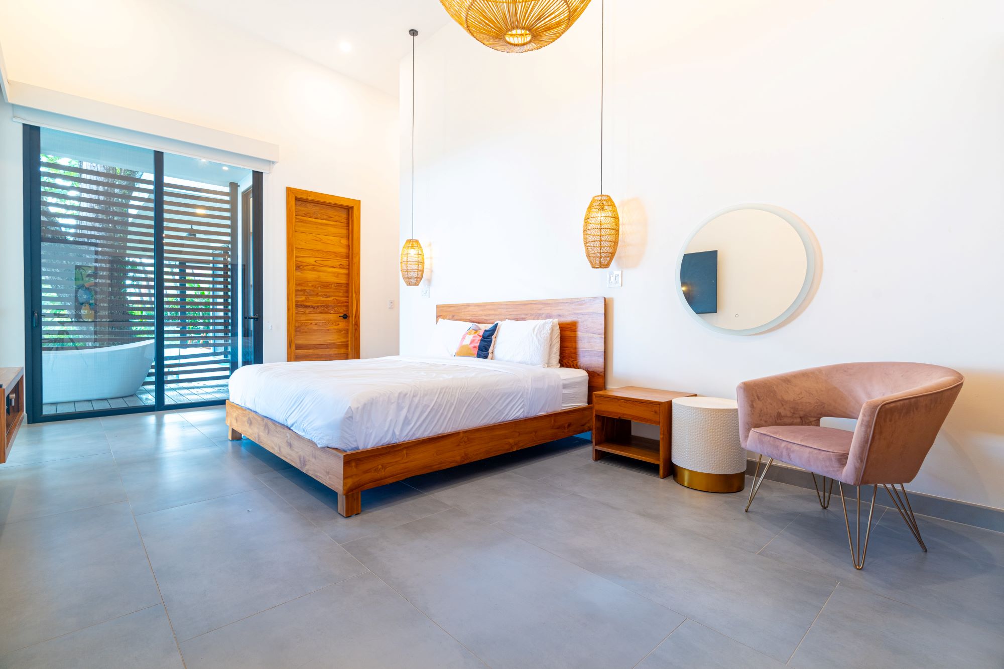 Una suite principal de lujo, con ducha doble, bañera al aire libre y su propio patio privado.
