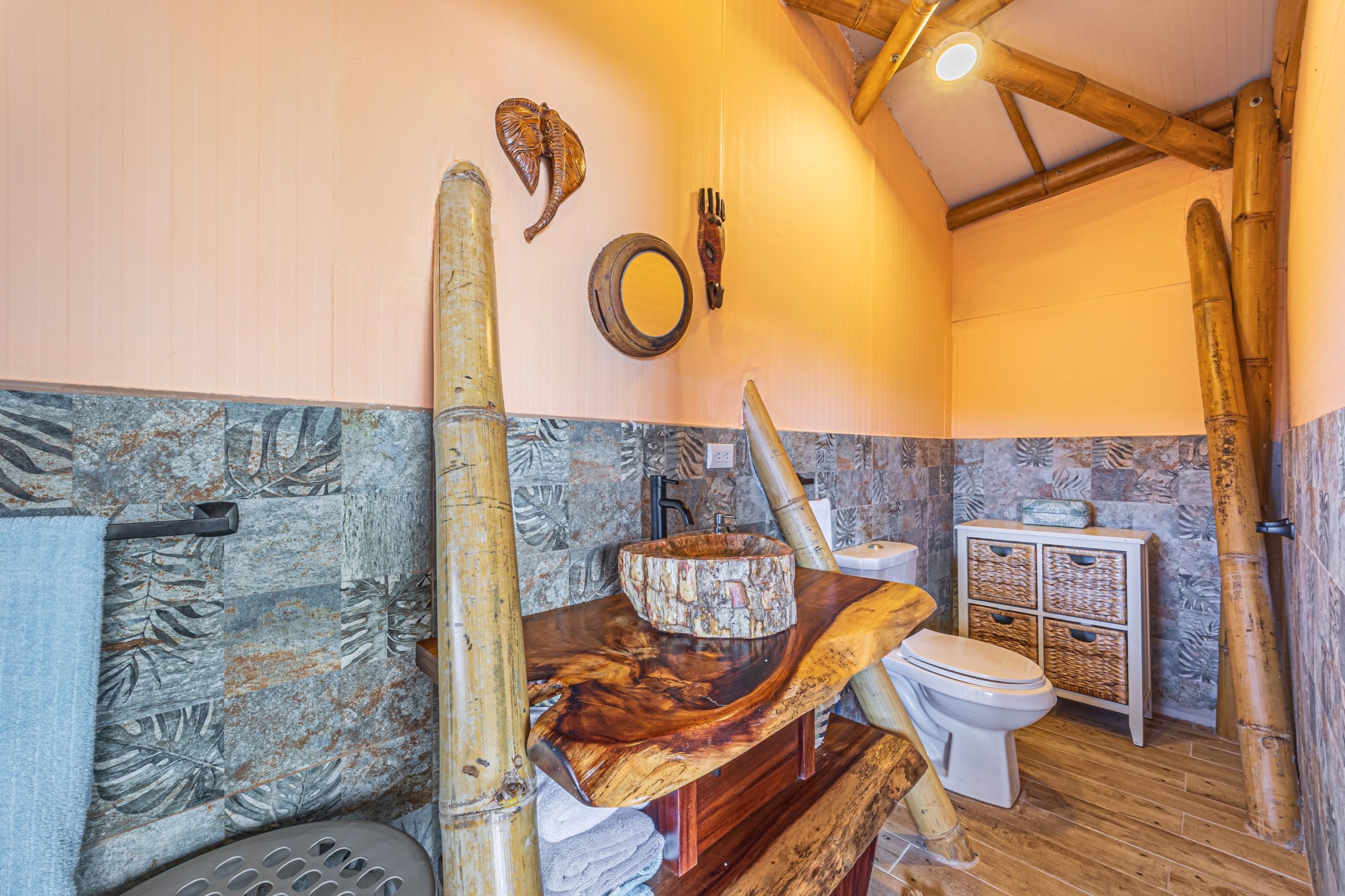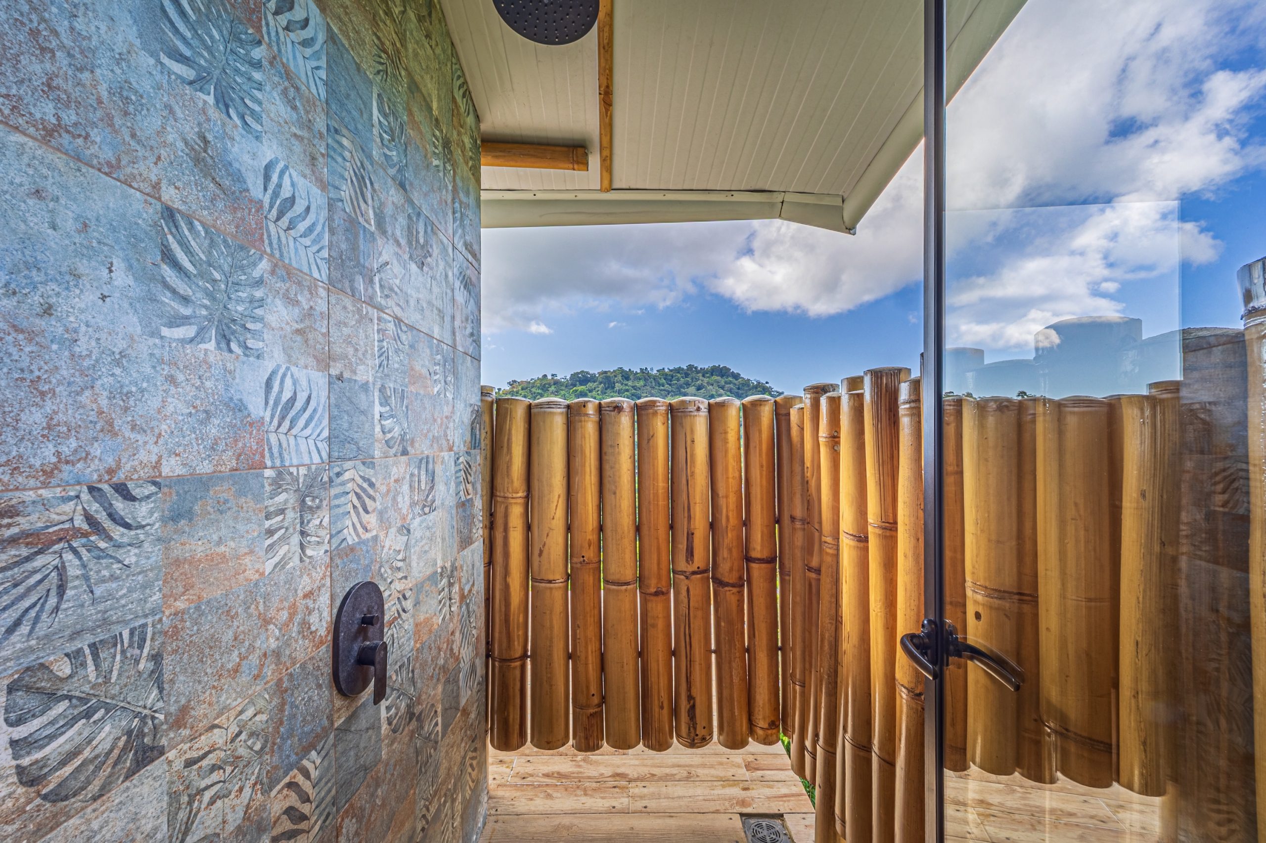 The main house features three spacious bedrooms, each with its own bathroom, high ceilings, and large sliding glass doors that open directly onto the terrace and pool. Abundant natural light and refreshing mountain breezes flow throughout the interior, creating a sophisticated yet welcoming environment.