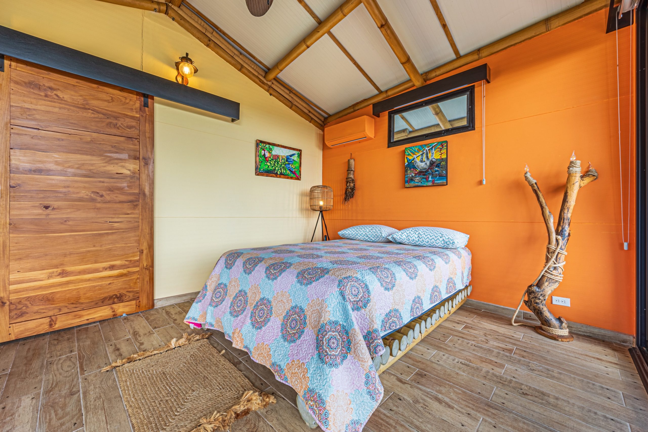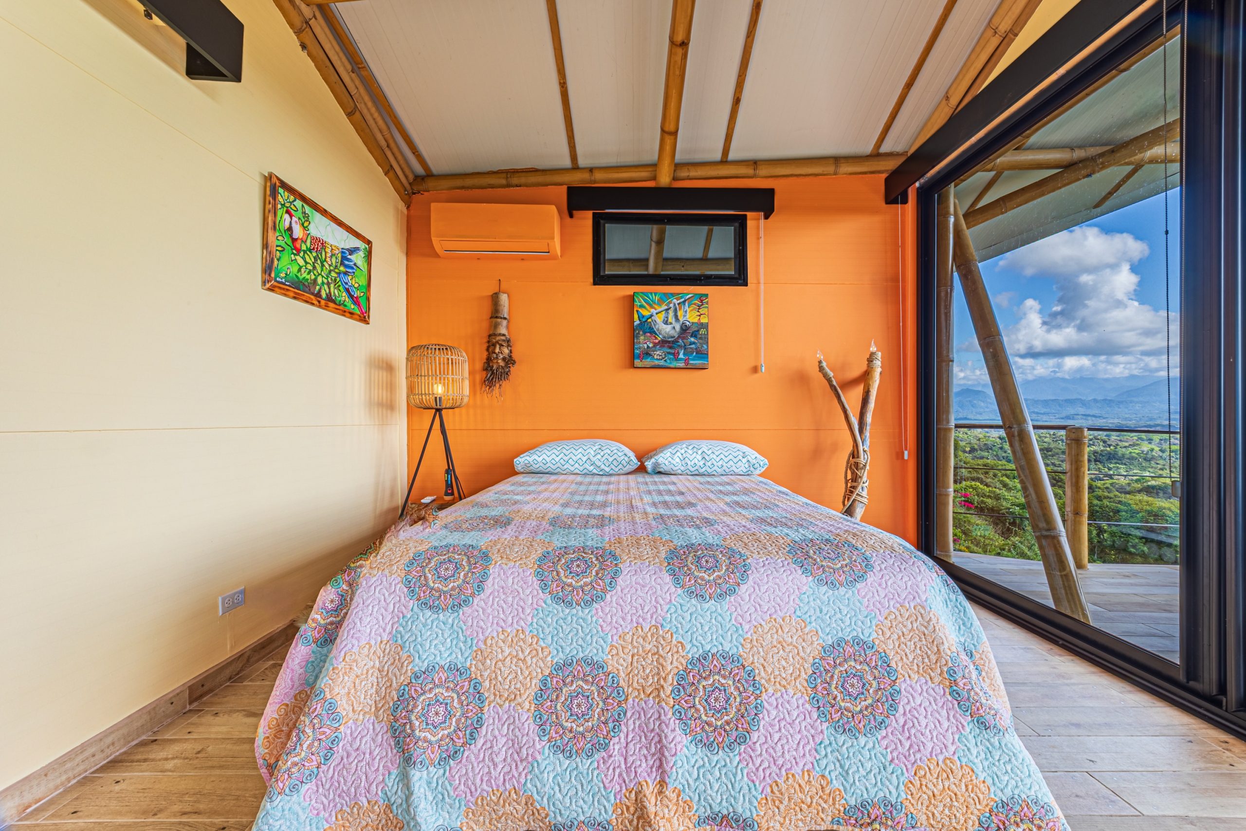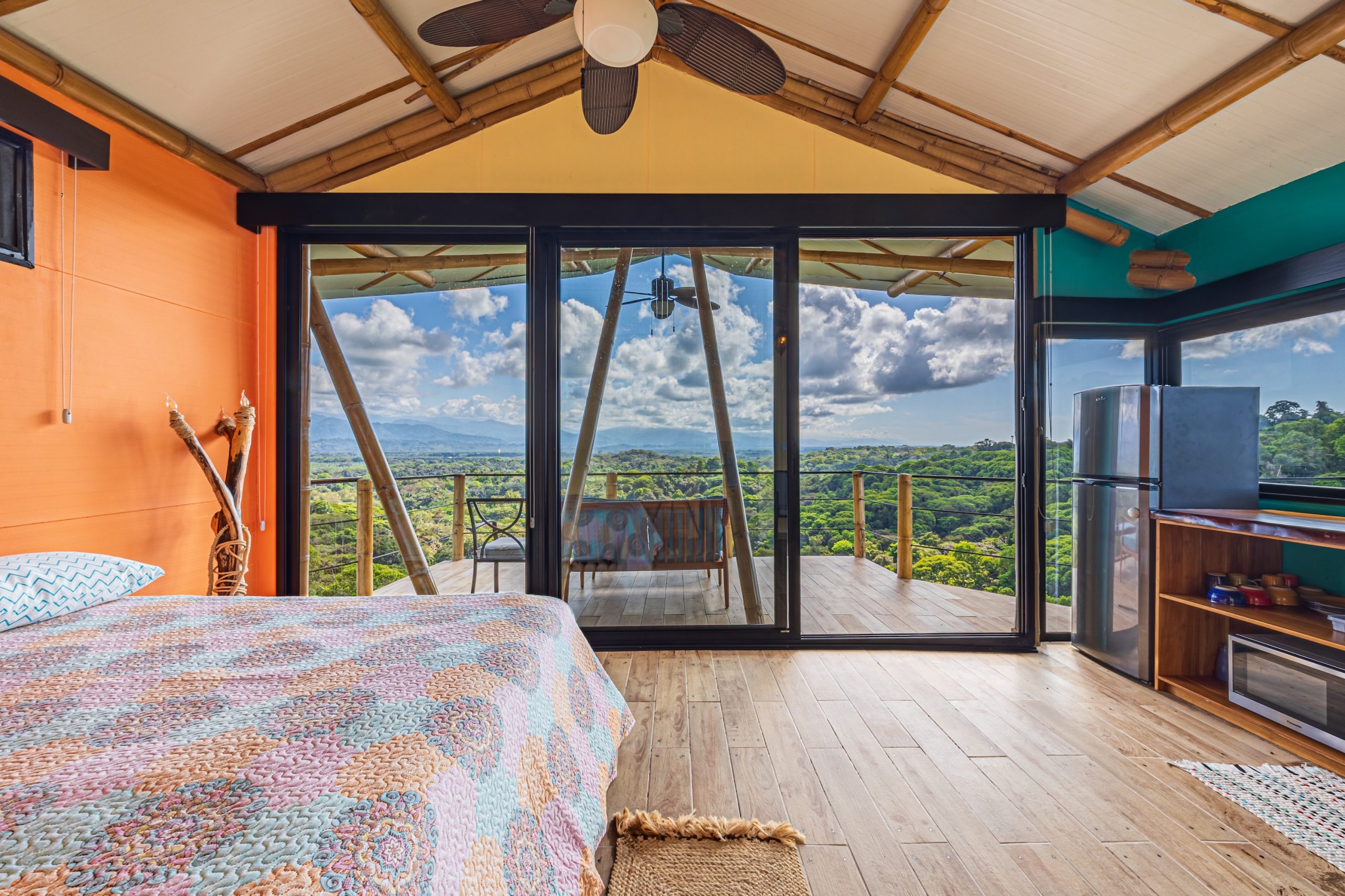 La casa principal ofrece tres amplios dormitorios, cada uno con su propio baño, techos altos y grandes puertas corredizas de vidrio que se abren directamente hacia la terraza y la piscina. La abundante luz natural y la brisa fresca de las montañas recorren todo el interior, creando un ambiente sofisticado y acogedor a la vez.