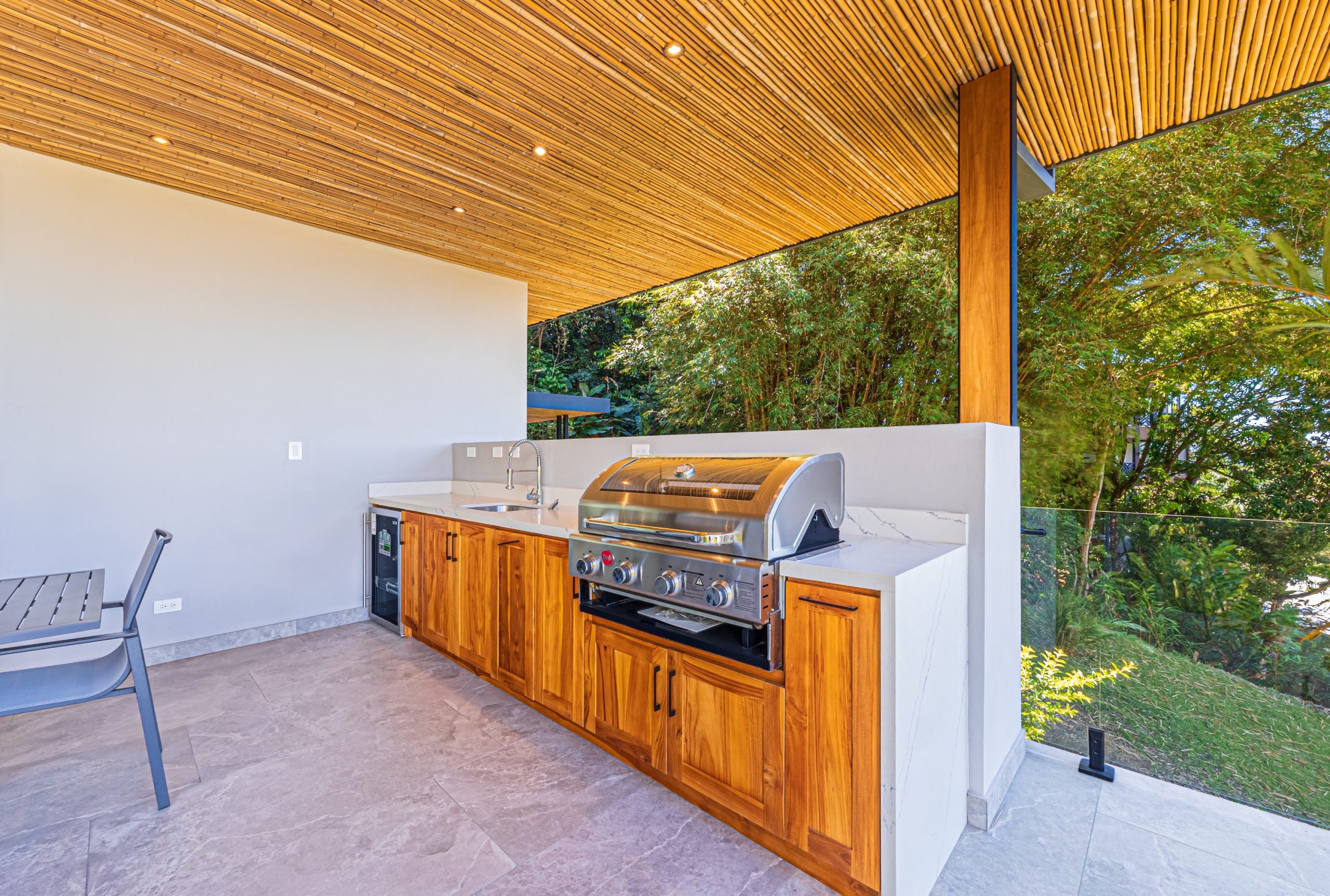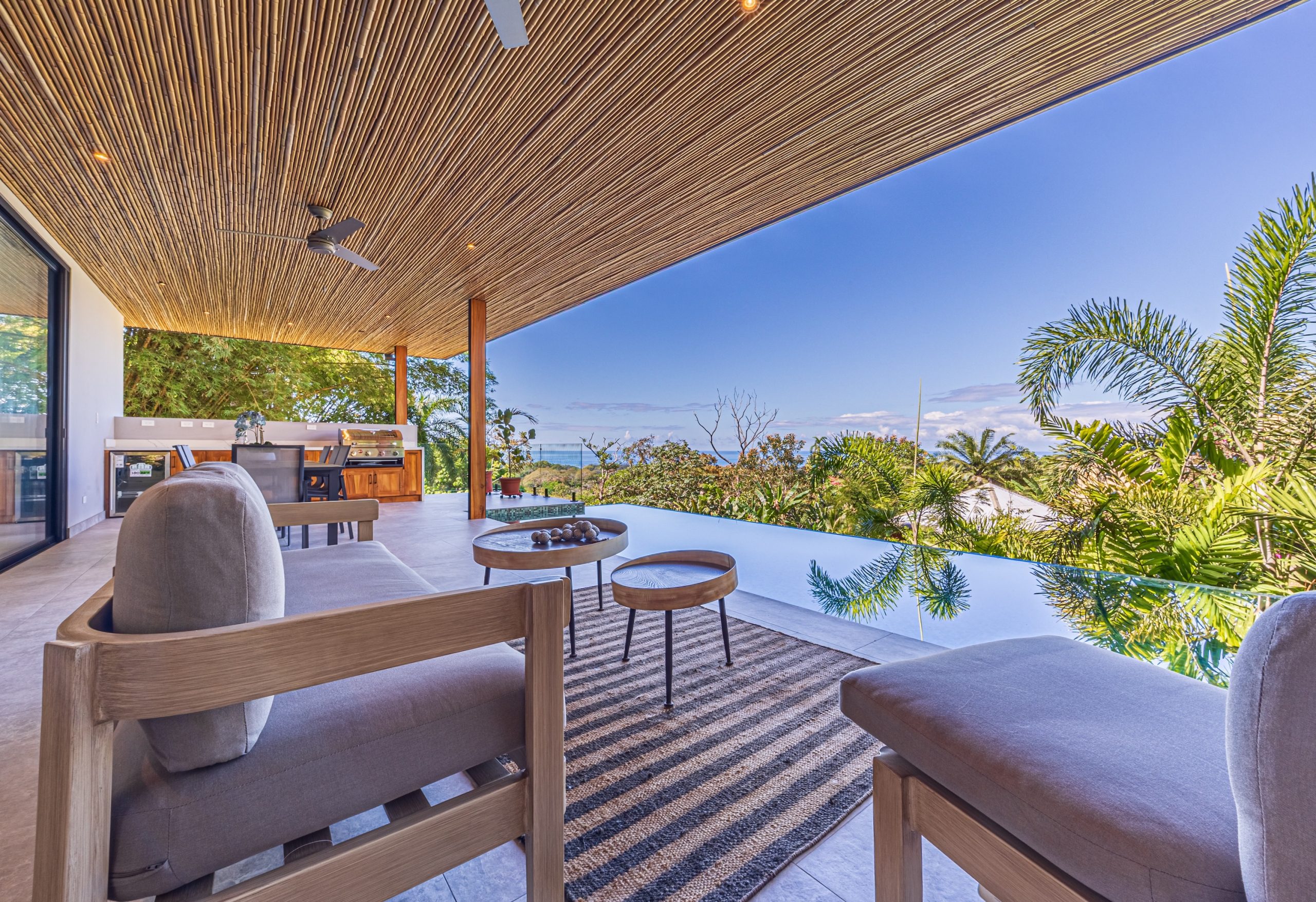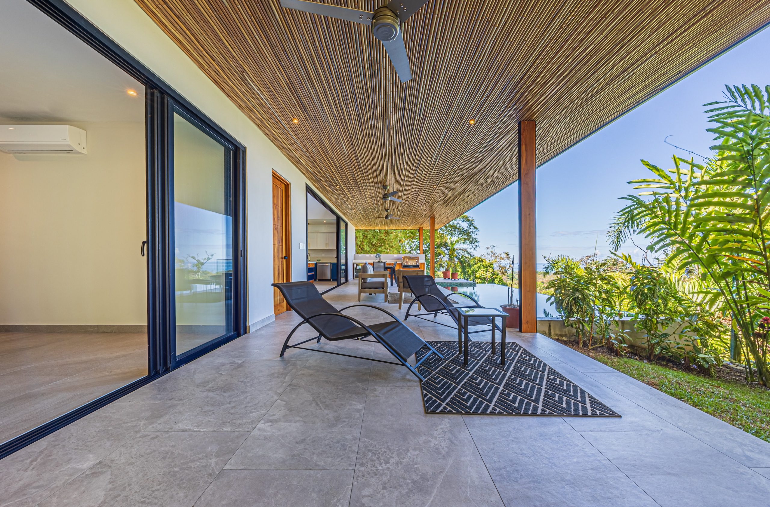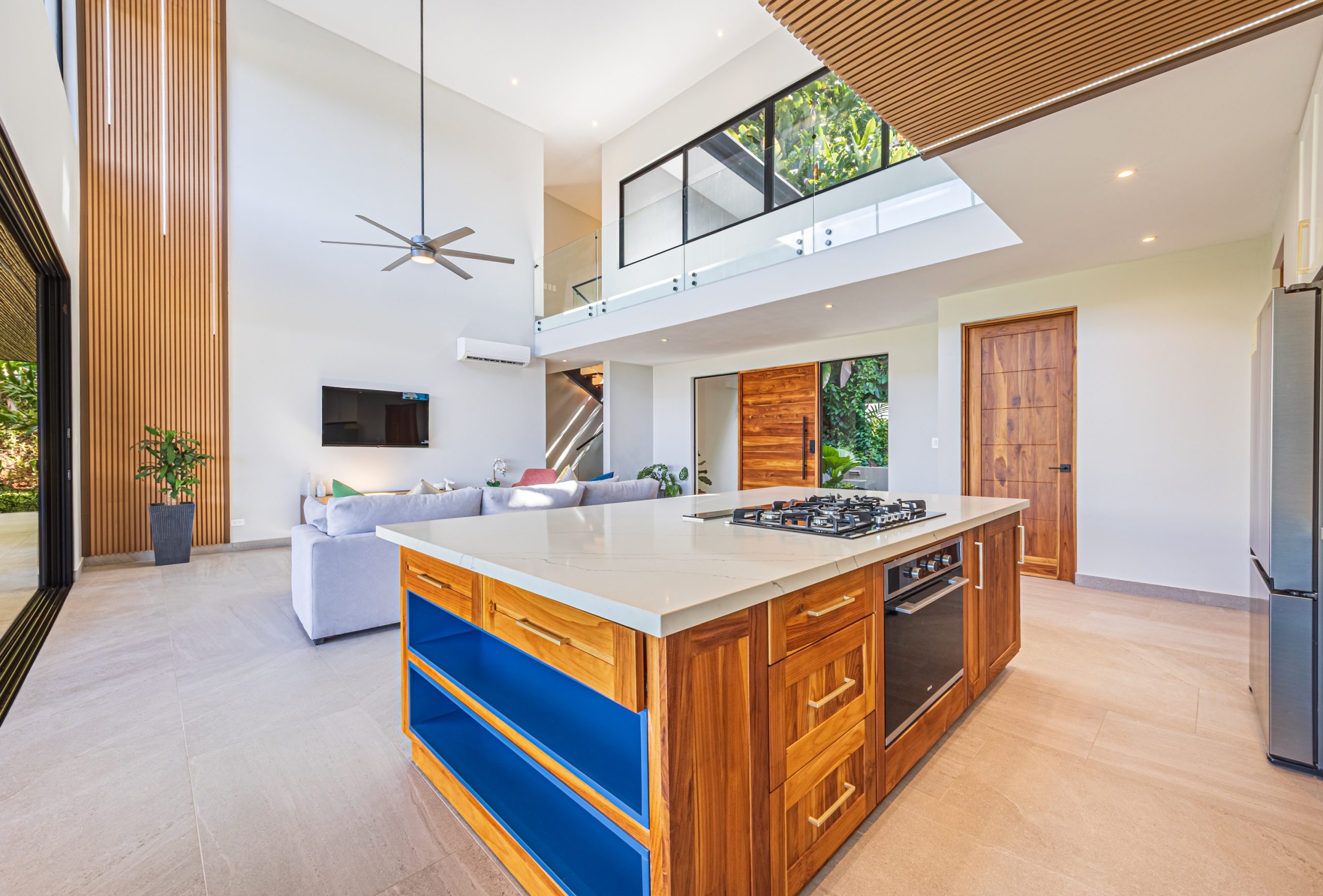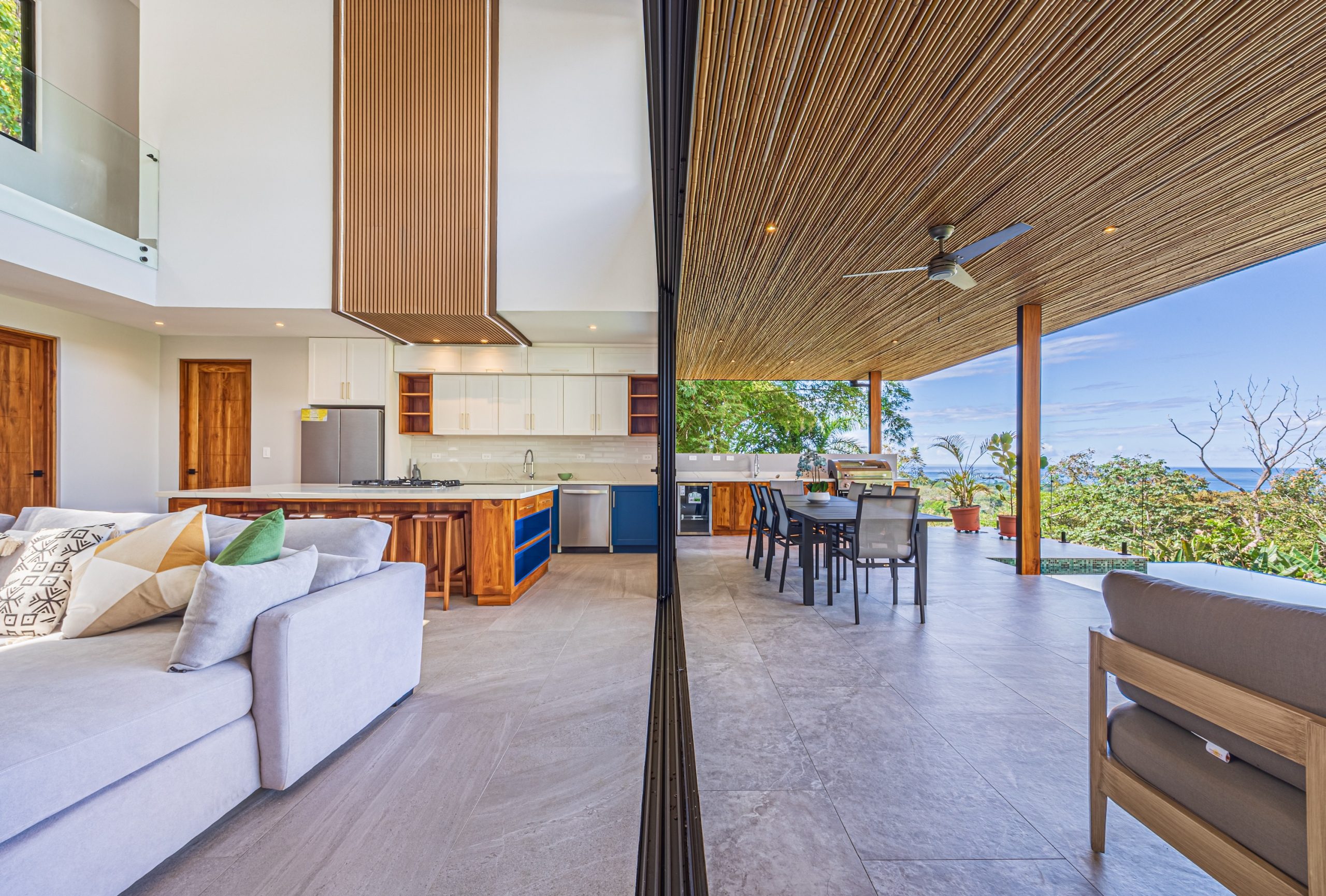 Los espacios de sala, comedor y cocina se integran en un concepto abierto que se comunica directamente con la terraza y la piscina mediante amplias puertas corredizas de vidrio que se retraen por completo, creando una conexión sin interrupciones entre el interior y el exterior.