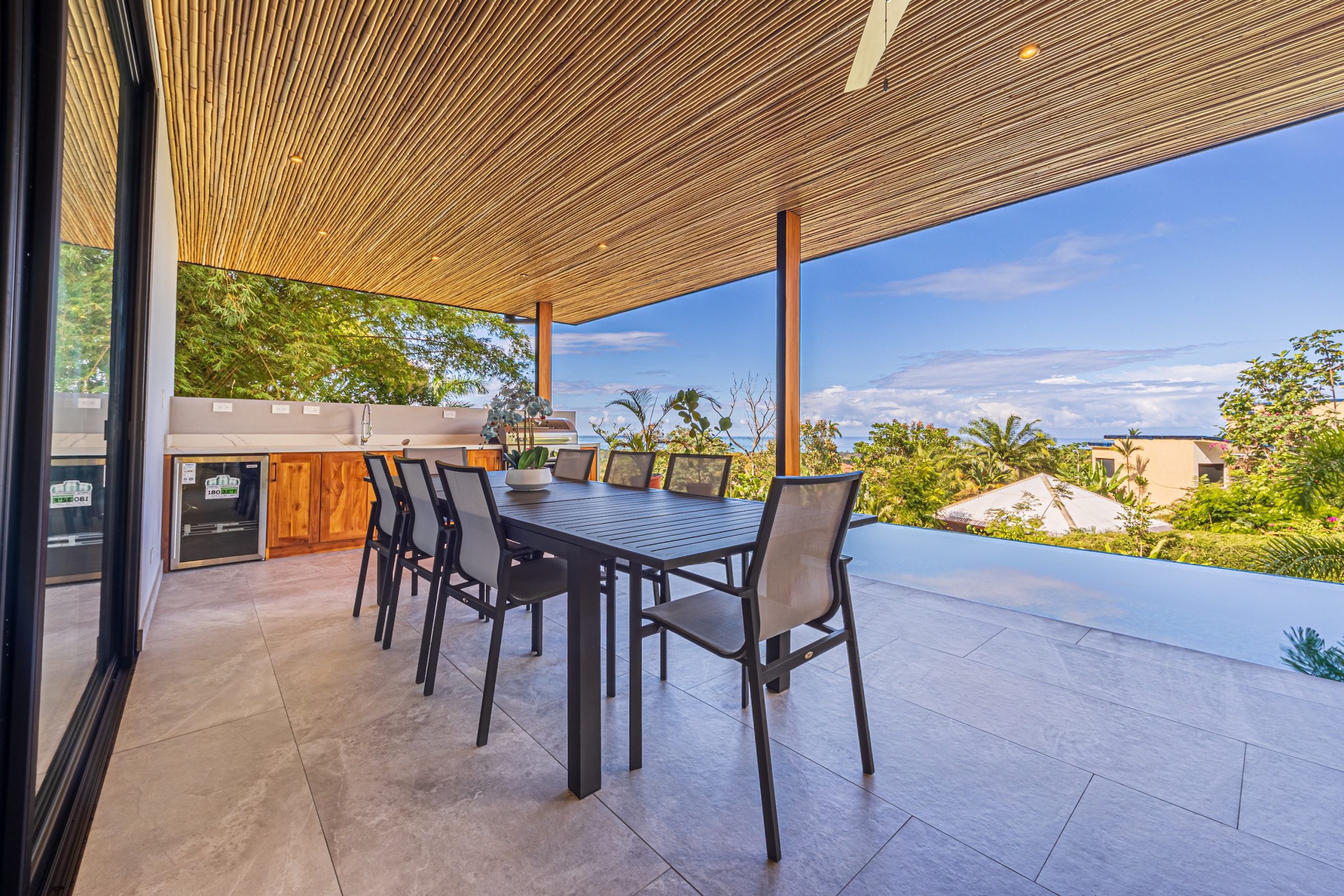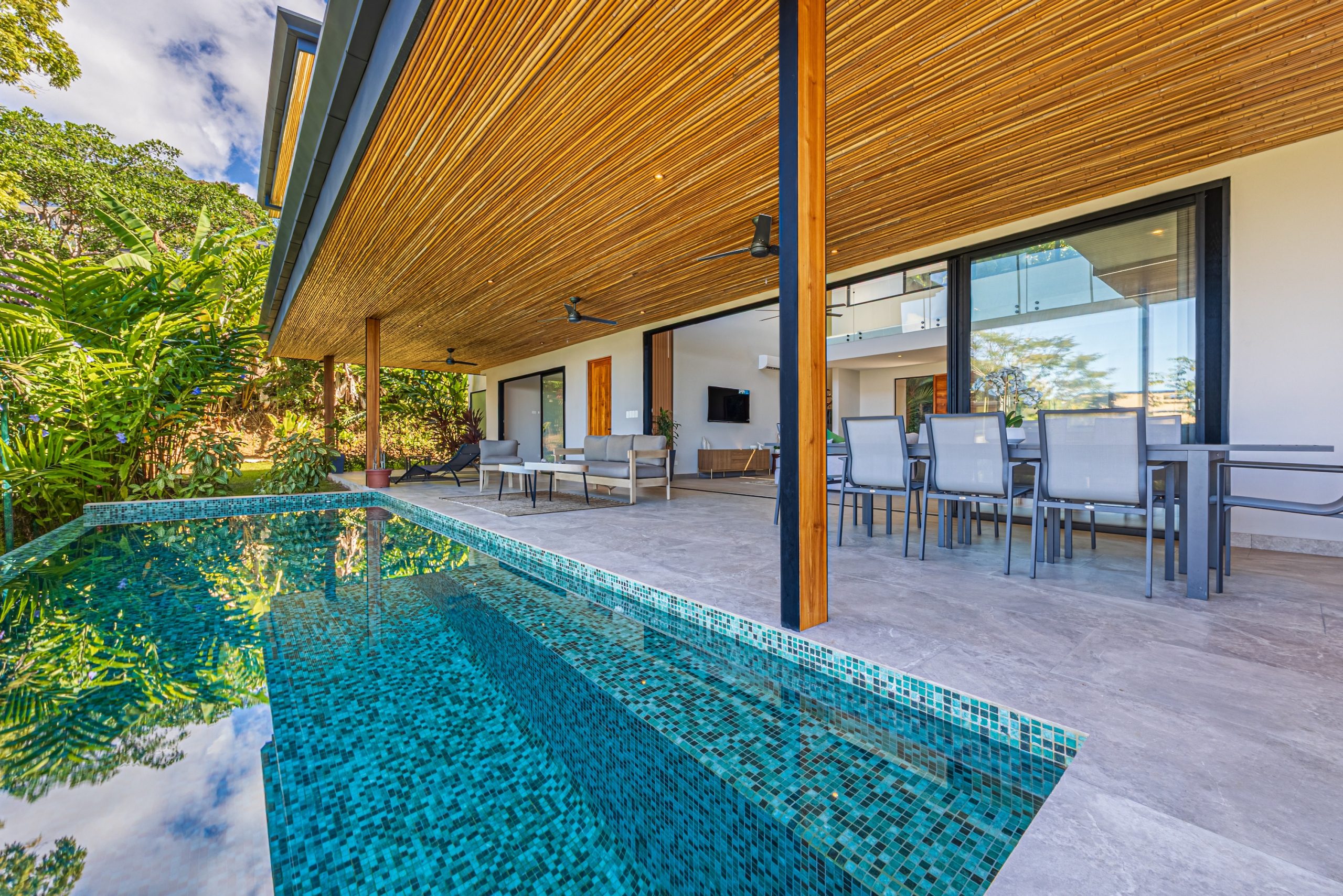 The living room, dining room, and kitchen flow together in an open-concept layout that connects directly to the terrace and pool through large sliding glass doors that fully retract, creating a completely uninterrupted transition between indoors and outdoors.