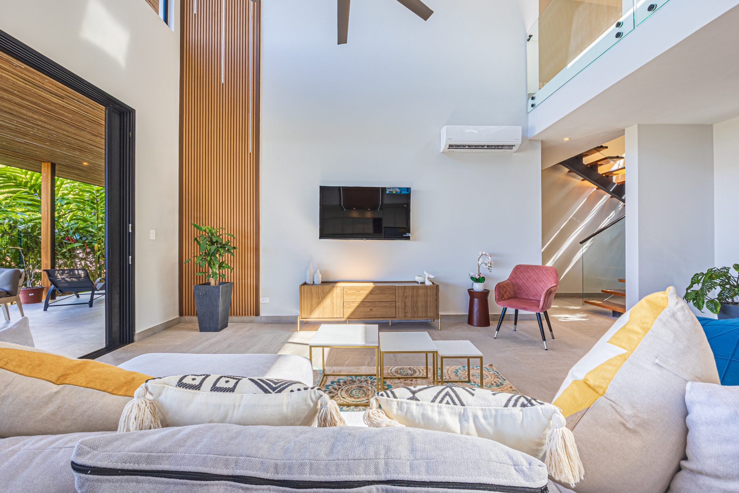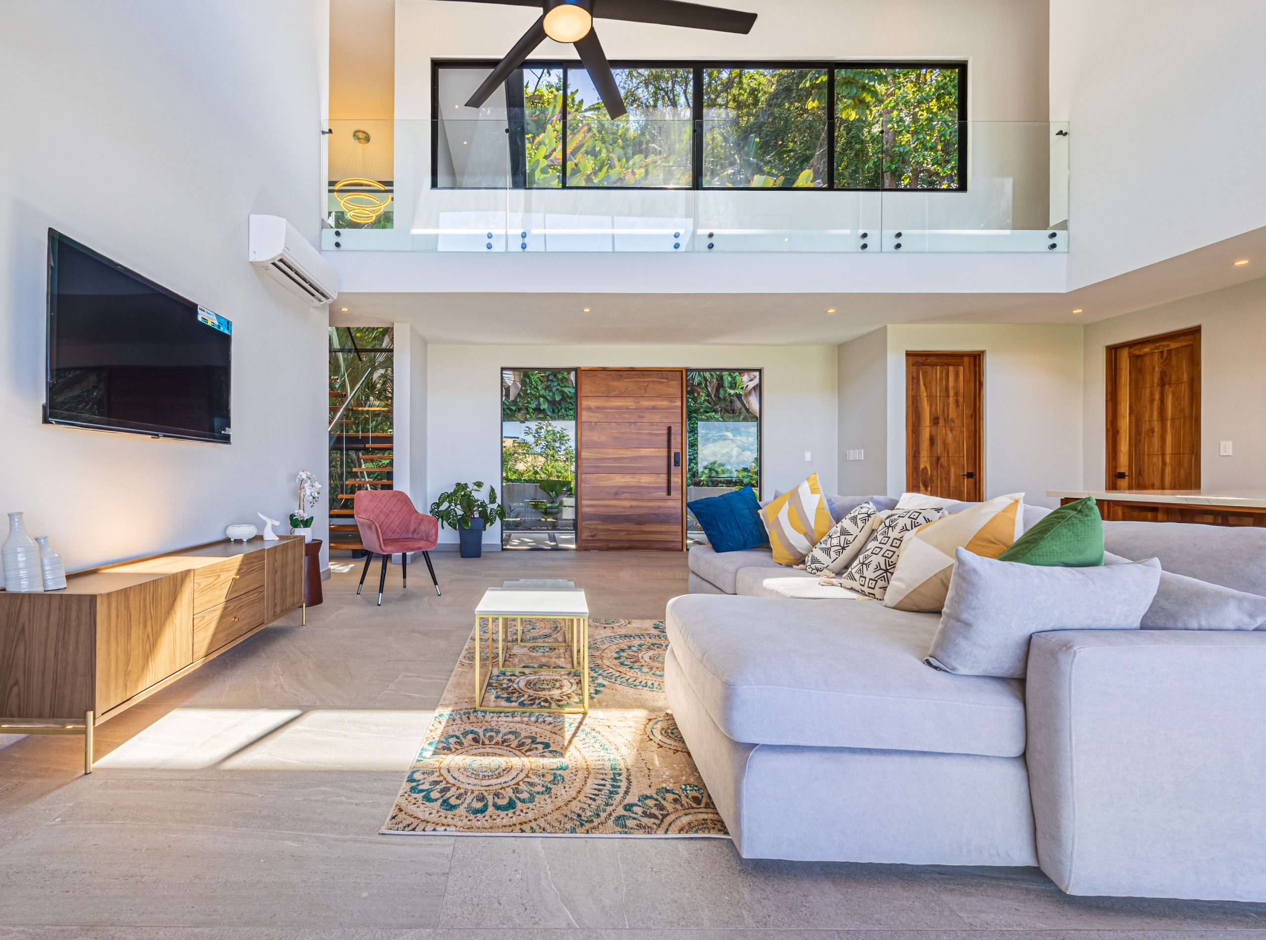 Upon entering, abundant natural light highlights the clean lines and carefully planned layout of the home. Beside the main social area, an elegant glass staircase serves as a striking architectural feature, complemented by a sculptural chandelier that adds style without compromising the sense of openness.