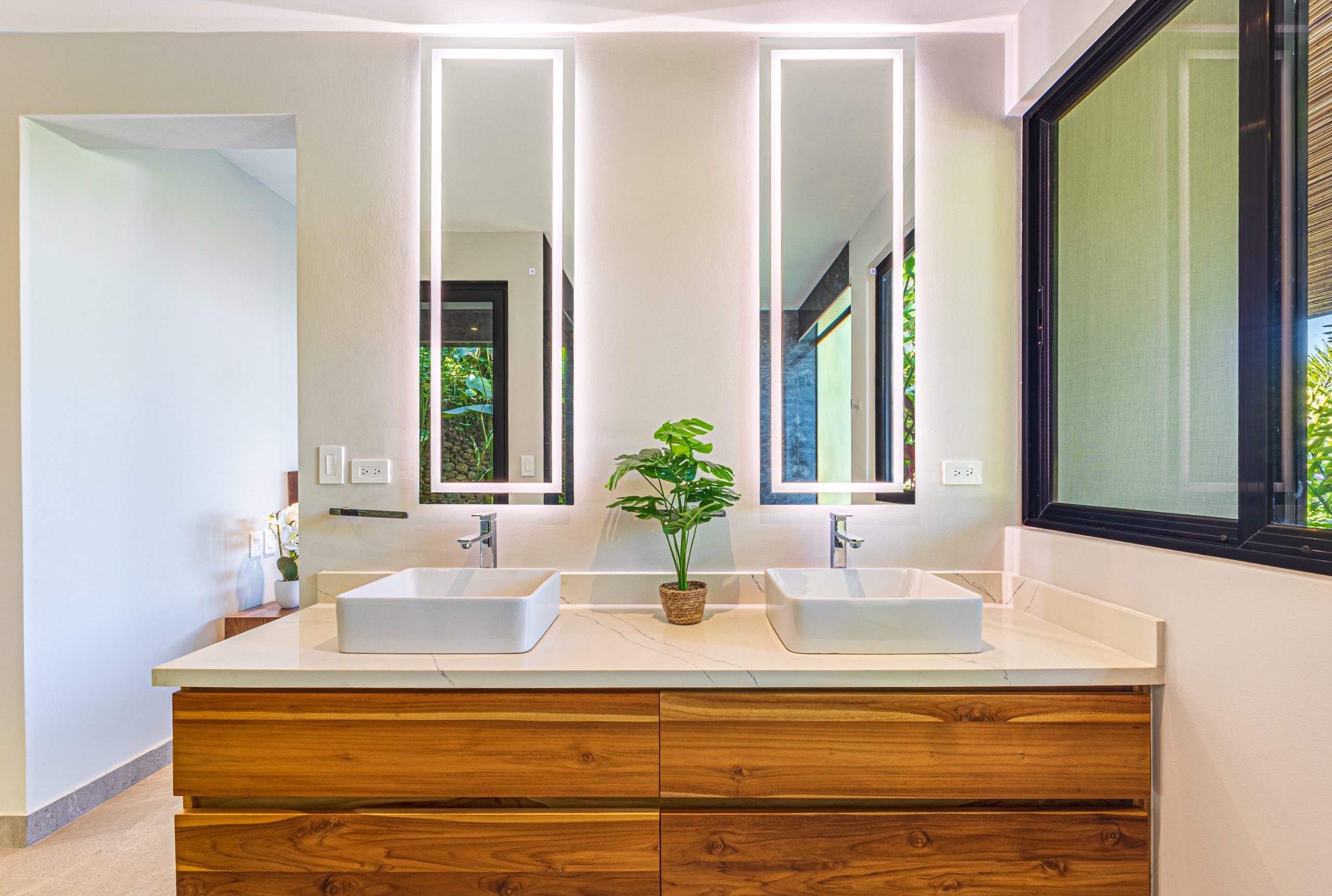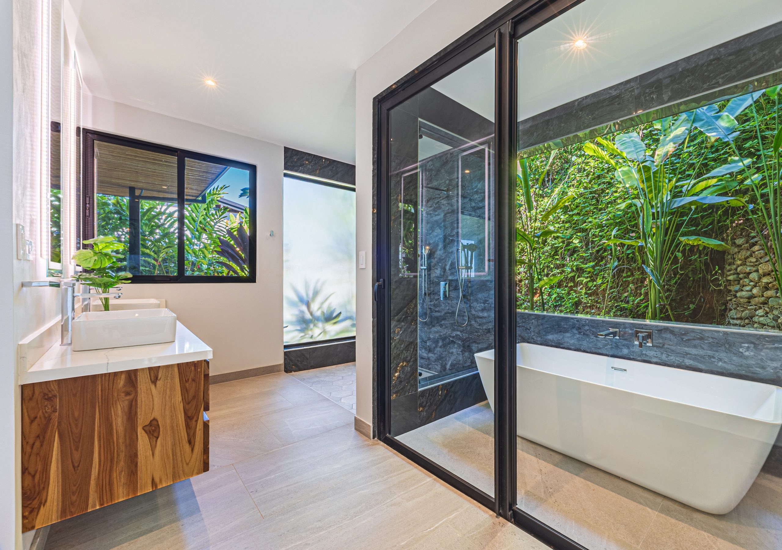 The primary suite is a private retreat overlooking the pool and jungle surroundings. Its spa-inspired bathroom includes dual sinks, dual showers, a deep soaking tub positioned toward the natural landscape, and a separate toilet room for added privacy. A walk-in closet completes the space, blending comfort and elegance.