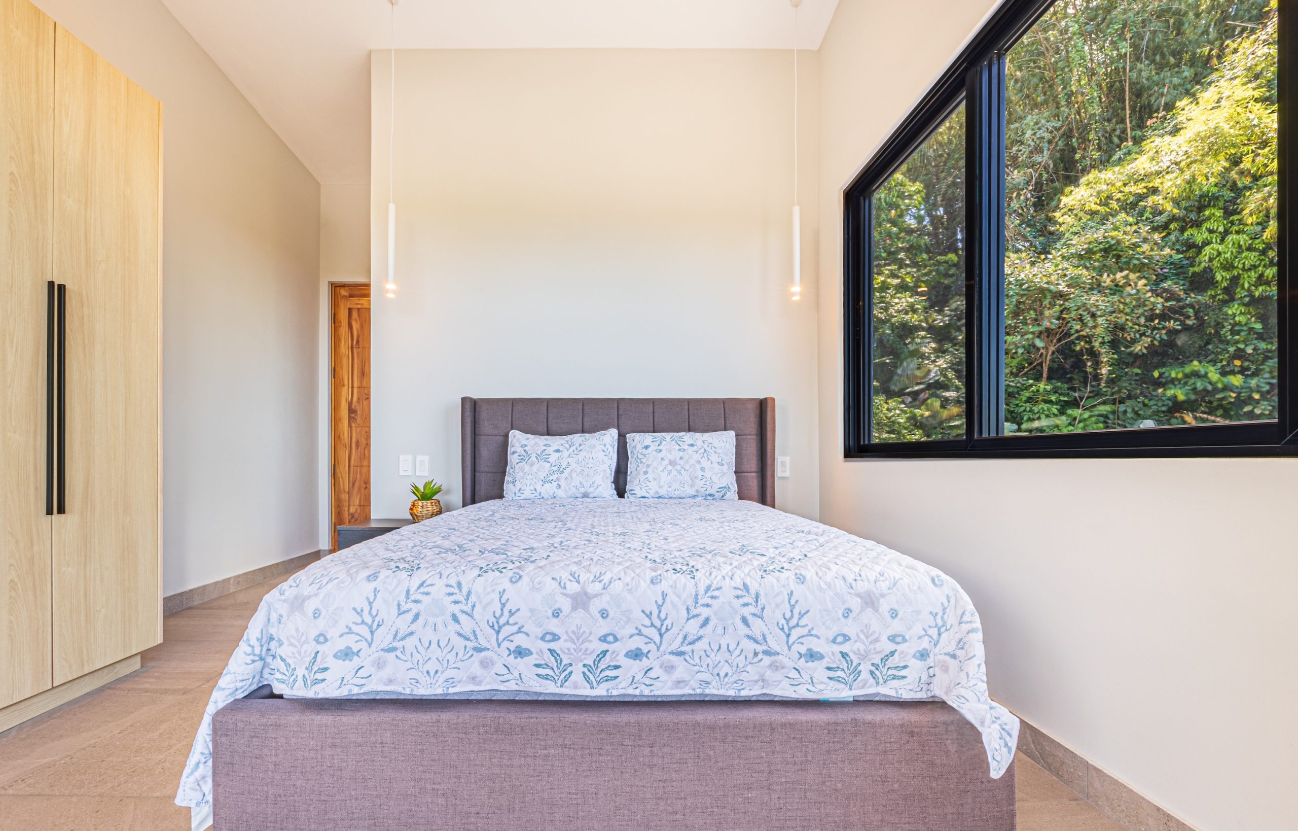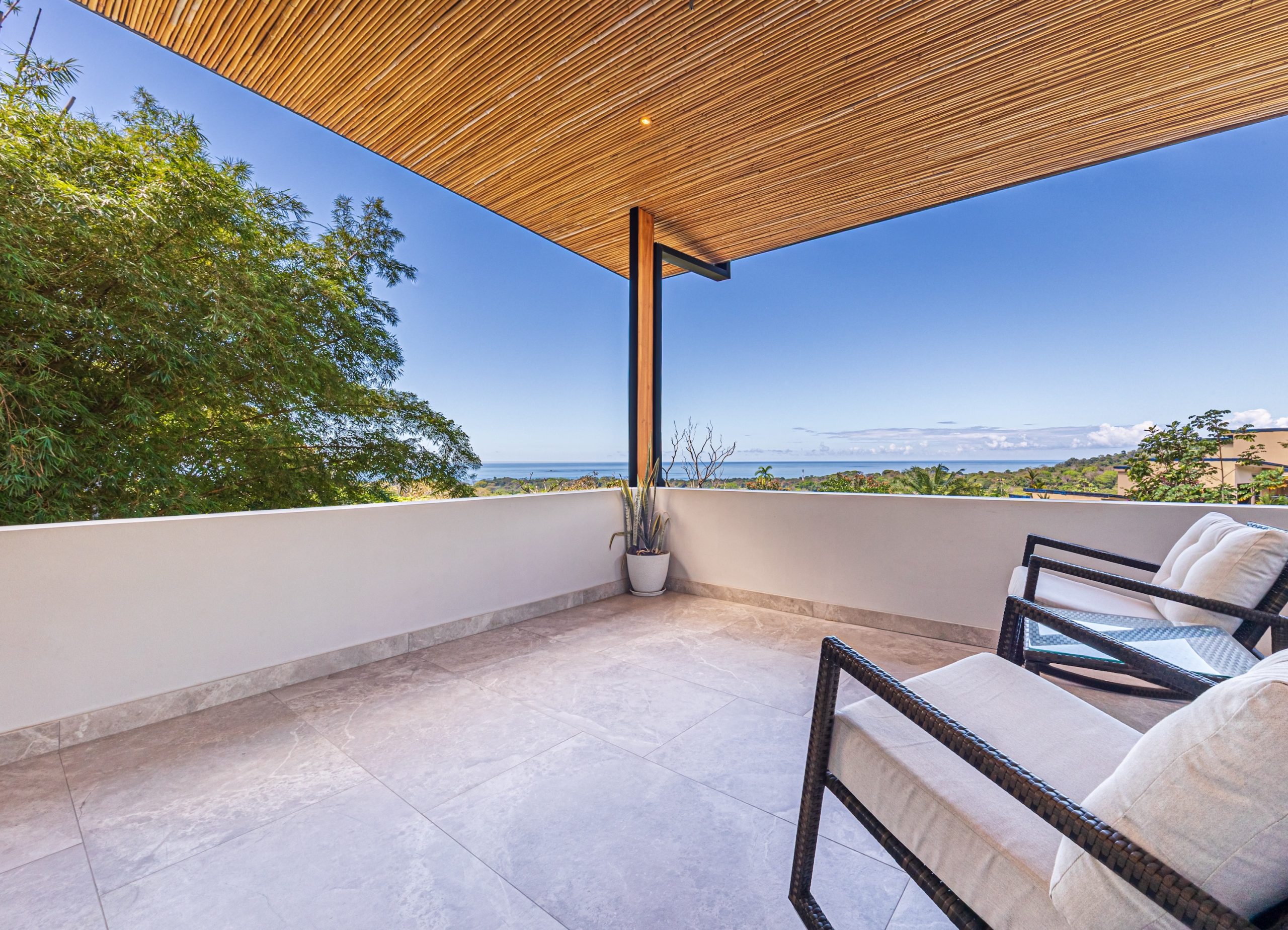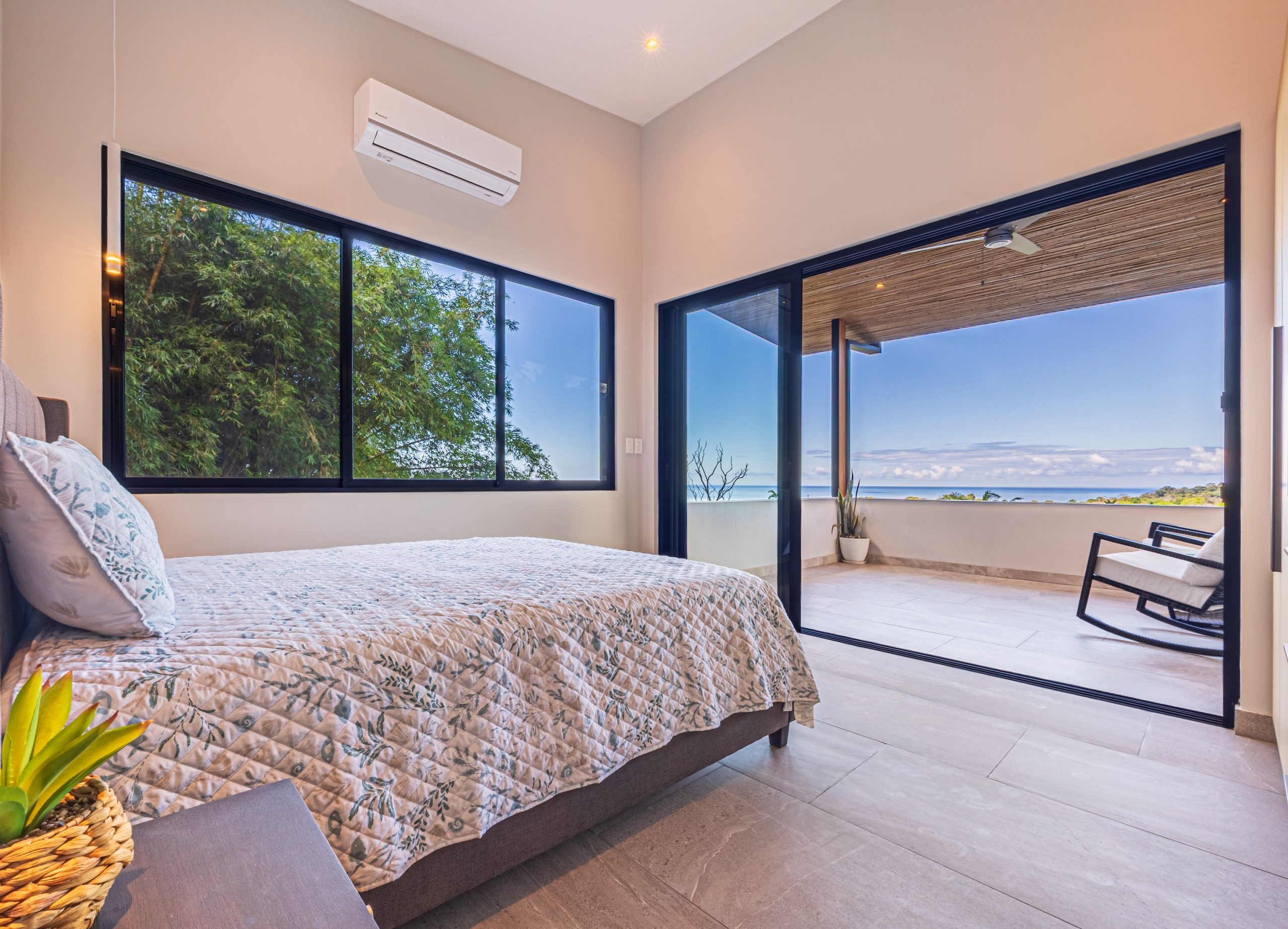 En la planta alta, dos dormitorios adicionales cuentan con baños privados, armarios y amplios balcones diseñados para capturar vistas al océano y dinámicas puestas de sol, ofreciendo privacidad para invitados, comodidad familiar o una excelente opción para alquiler a corto plazo.