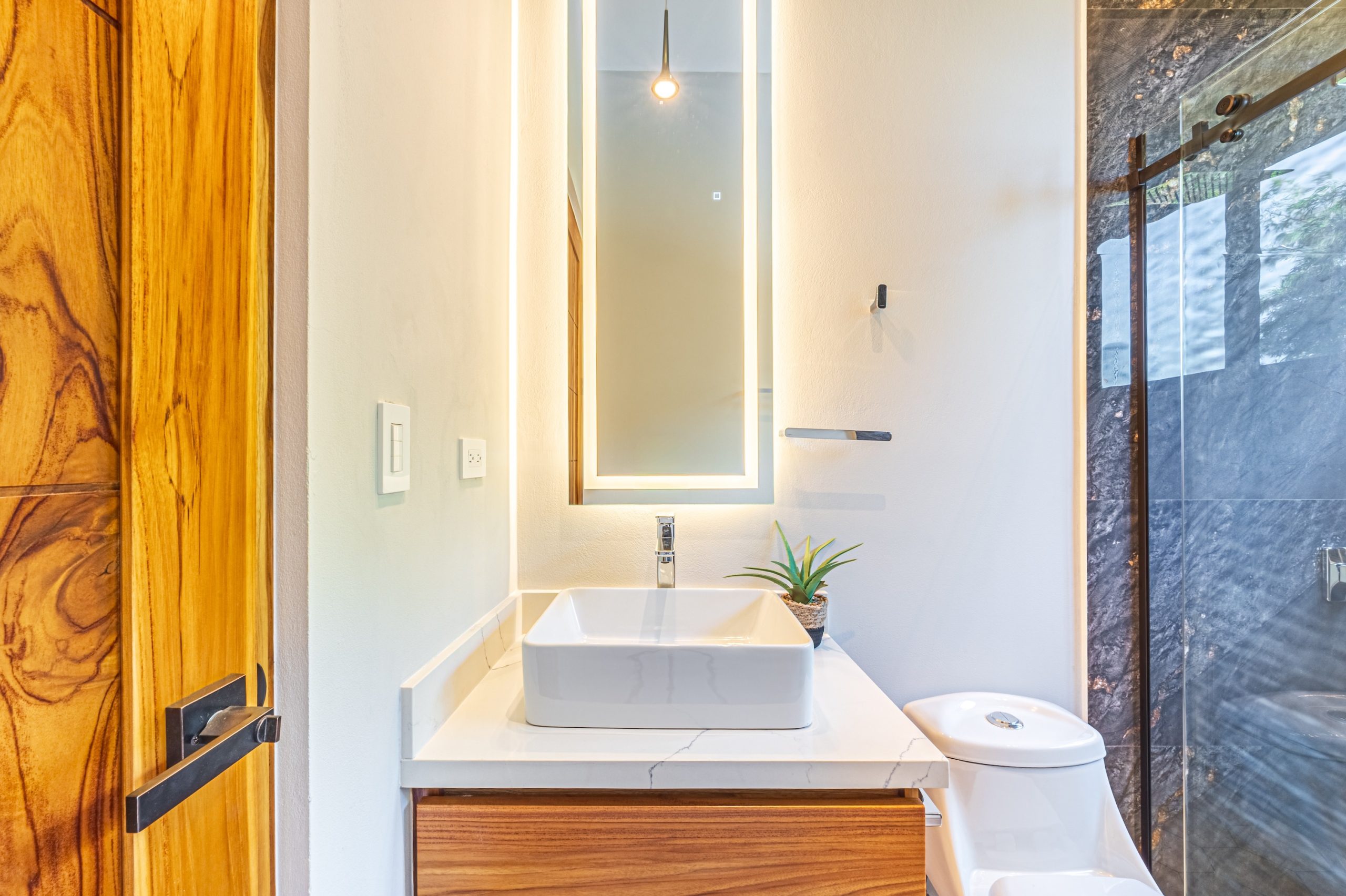 La suite principal es un refugio privado con vistas a la piscina y al entorno selvático. Su baño, con inspiración de spa, incluye lavabos dobles, duchas dobles, una bañera profunda orientada hacia el paisaje natural y un inodoro separado para mayor privacidad. Un vestidor completa el ambiente, uniendo confort y elegancia.