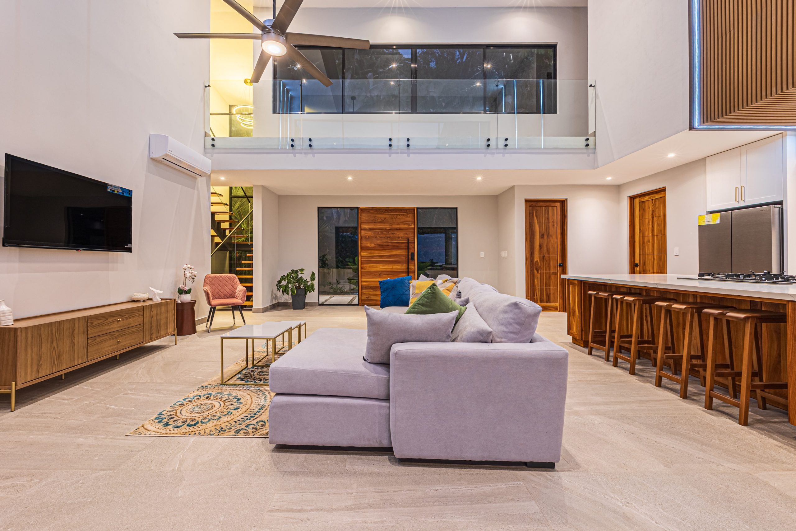 Al cruzar la entrada, la abundante luz natural resalta las líneas limpias y el diseño cuidadosamente distribuido de la vivienda. A un costado del área social, una elegante escalera de vidrio actúa como pieza arquitectónica destacada, complementada por una lámpara de araña escultórica que aporta estilo sin romper la sensación de amplitud.
