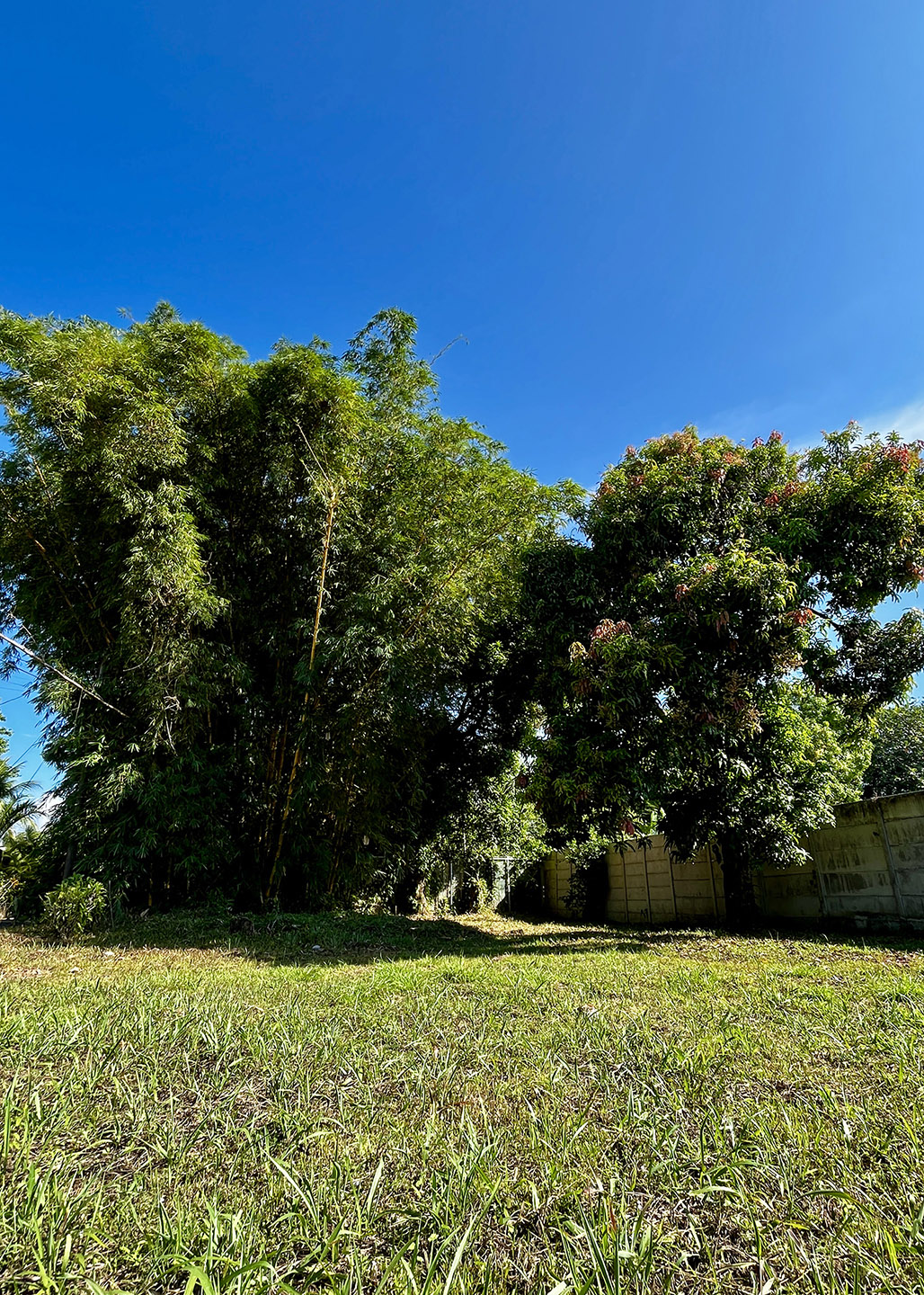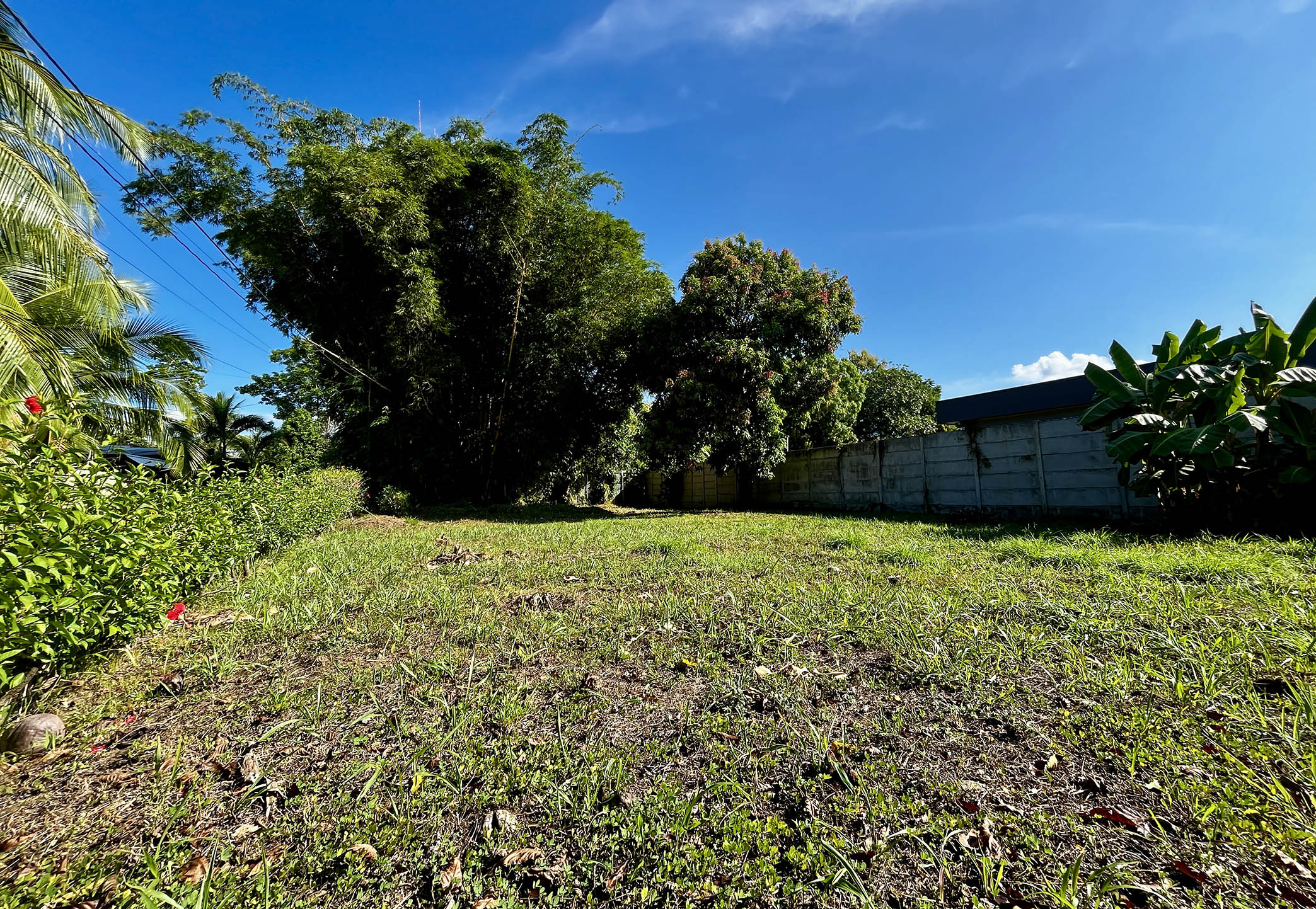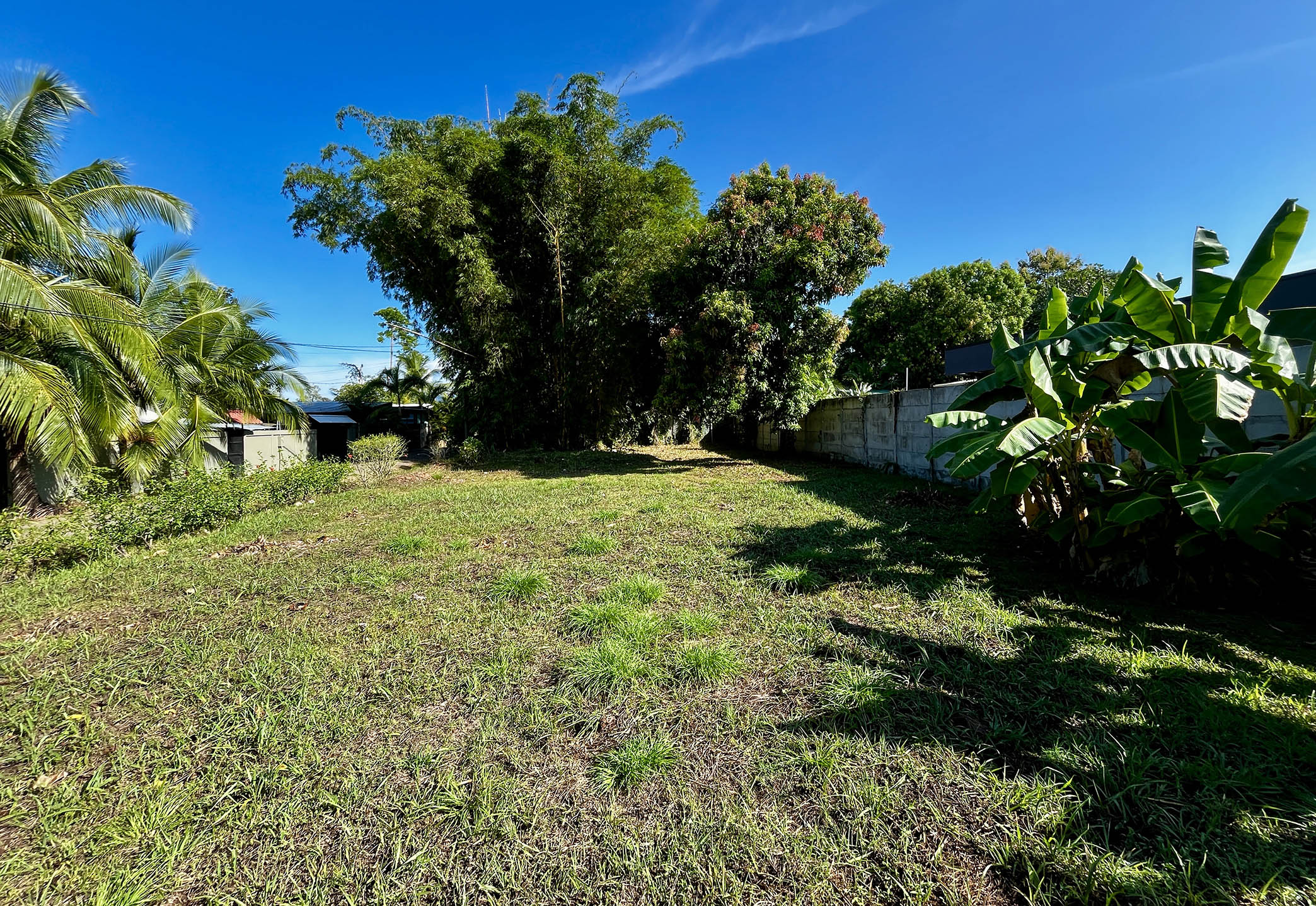 Imagine… you turn down the quiet side street and enter on the north end of the property. You pass under the towering stand of golden bamboo that provides shade throughout the day. A mature mango tree stands in front of the 8-foot privacy wall running the entire eastern property line. This flat land is a blank canvas, and there is ample room for a large custom construction, parking area, and swimming pool. All utilites—electrical, water, internet—run along the property line and easy for your builder to connect. There are no HOA dues.