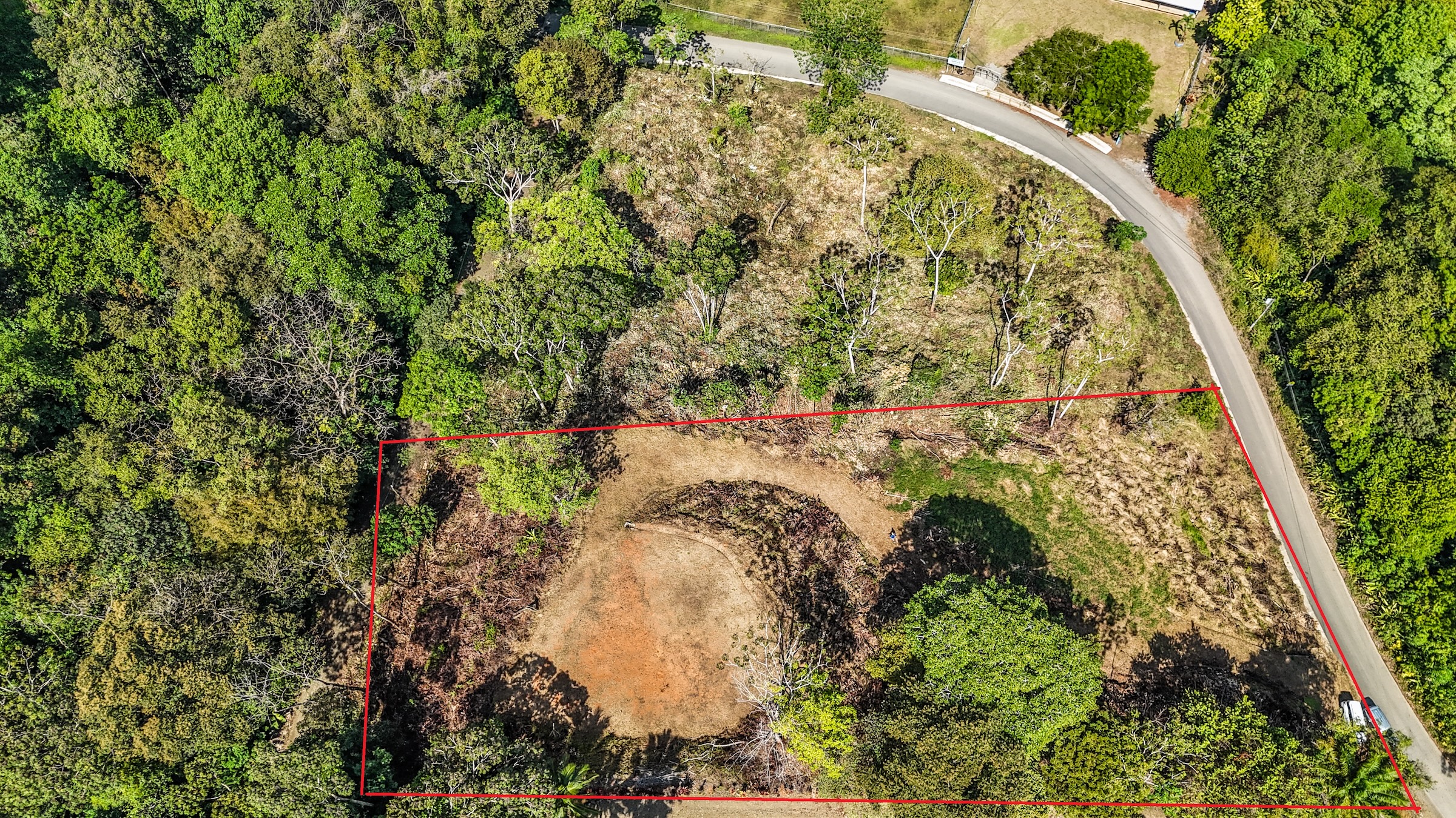 La propiedad tiene frente a una vía pública pavimentada y se accede mediante un camino interno bien mantenido. El camino conduce primero a una plataforma de construcción ubicada a media altura de la colina y luego continúa hasta una segunda plataforma situada en la parte superior del terreno.