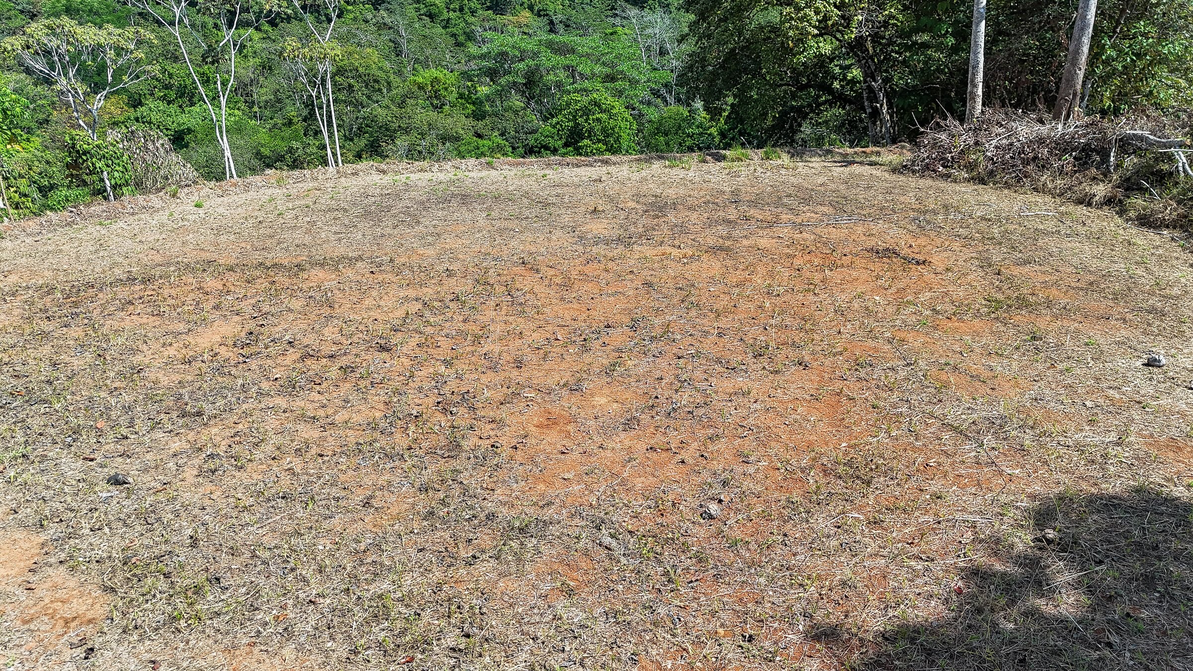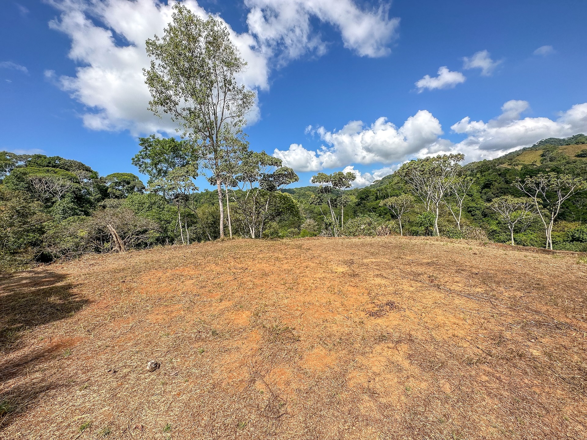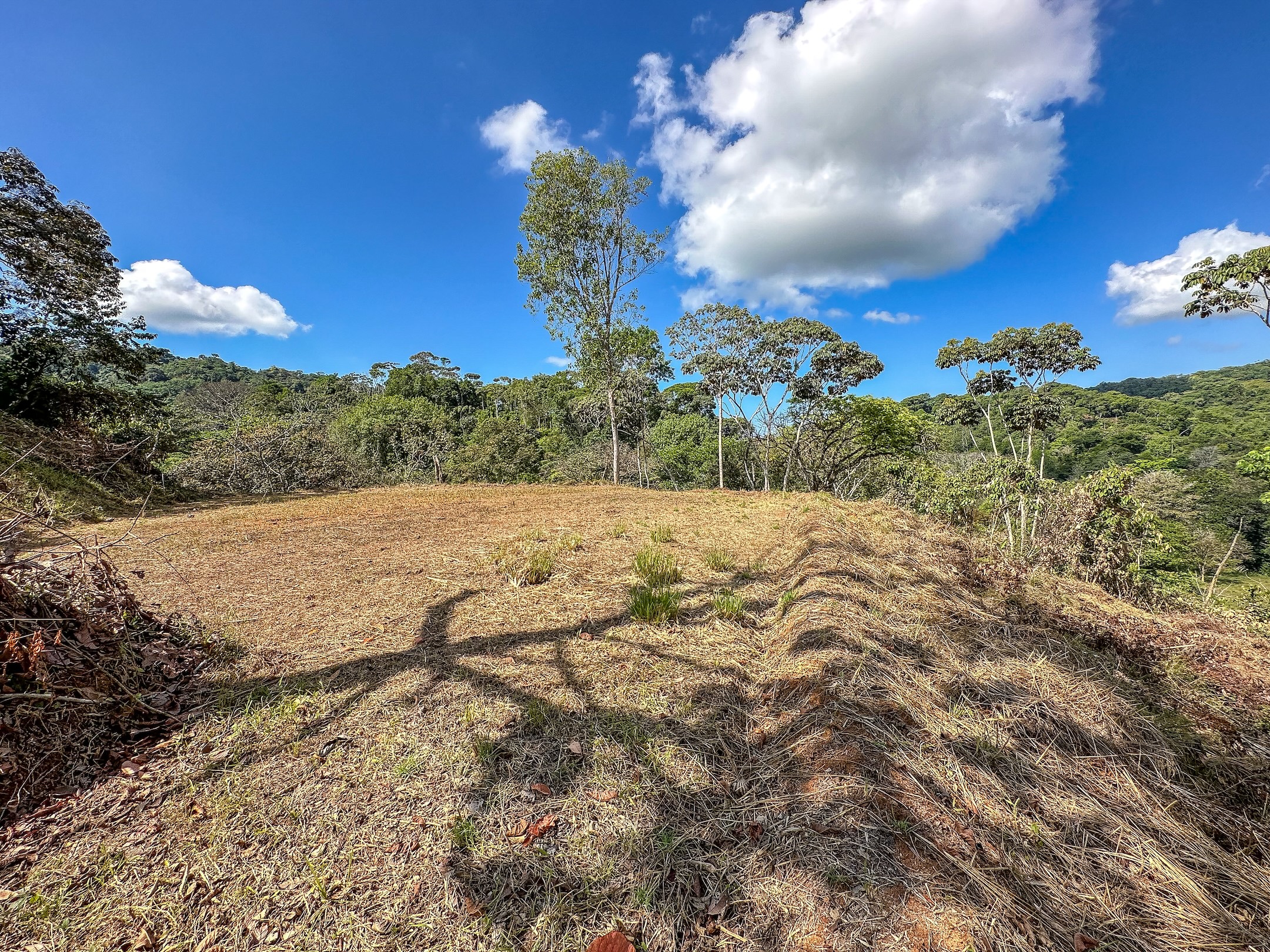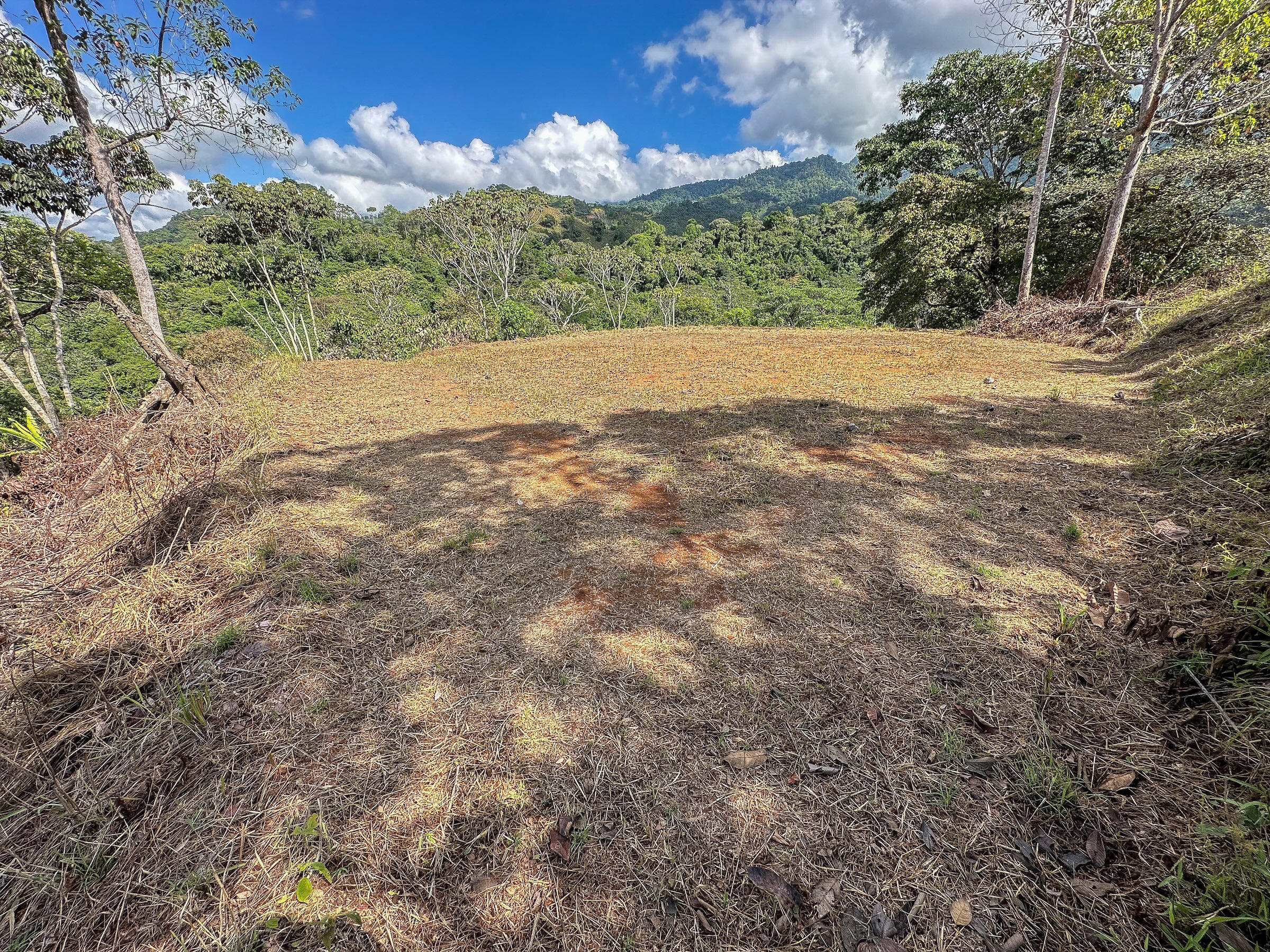 Ambas áreas son planas y ofrecen hermosas vistas hacia las colinas, la selva y las montañas costeras que se elevan hasta más de 1300 metros sobre el Pacífico. Estas montañas suelen cubrirse de neblina y nubes que se deslizan entre los bosques, creando un paisaje espectacular donde incluso pueden observarse cascadas descendiendo por sus laderas. La zona es hogar de abundante fauna silvestre como guacamayas, tucanes, monos capuchinos y aulladores, además de mariposas morfo azules y muchas otras especies que forman parte del entorno natural. El sonido de un río cercano se puede escuchar desde cualquier punto de la propiedad, incluso durante la estación seca.